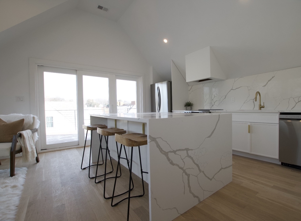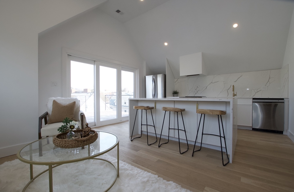 Luxury and convenience converge in this stunning, brand new top-floor condo ideally located in Davis Square, just steps to vibrant shops, acclaimed restaurants, and the Red Line MBTA. This sun-filled 2-bedroom, 1.5-bath home offers modern living at its finest, featuring soaring vaulted ceilings and a spacious open-concept layout with a cozy fireplace.The sleek designer kitchen is beautifully appointed with quartz countertops, a center island, and stainless steel appliances,perfect for everyday living and entertaining. The primary bedroom includes a custom-tiled half bath, while the spa-like full bath showcases custom tilework and a curbless shower.Additional highlights include in-unit laundry and a Ring doorbell for added security and peace of mind. A rare opportunity to own a turnkey home in one of Somerville’s most sought-after neighborhoods. Schedule your private showing today.