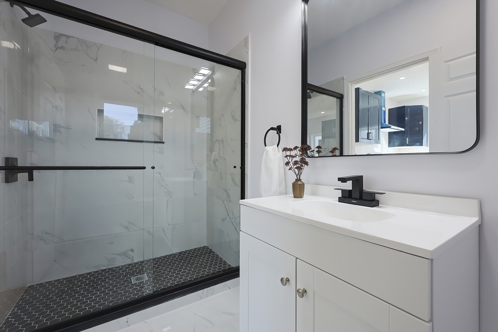 BRAND NEW CONSTRUCTION! This modern farmhouse blends timeless charm with modern design. The great room features highceilings and LED recessed lighting, creating a bright, open space for everyday living. A dining area leads to the chef’s kitchen,beautifully appointed with stainless steel appliances and gas cooking. Adjoining the kitchen, you’ll find an oversized bonus roomwith a rear entrance and a full marble bathroom, offering a flexible space for a family room or guest suite. Upstairs, a spaciouslanding area at the top of the stairs makes a perfect reading nook or home office. Next, the primary bedroom is filled with naturallight from three exposures. Two additional bedrooms are at the opposite end of the house. A second full bath with marble tile, acloset with a washer and electric dryer hookup, and a linen closet complete the upper level. The finished basement with tile flooringprovides plenty of storage. Welcome home!
