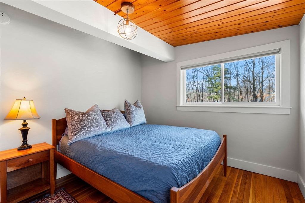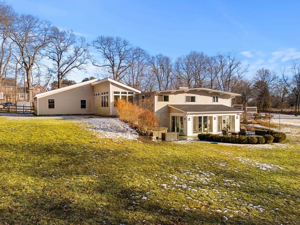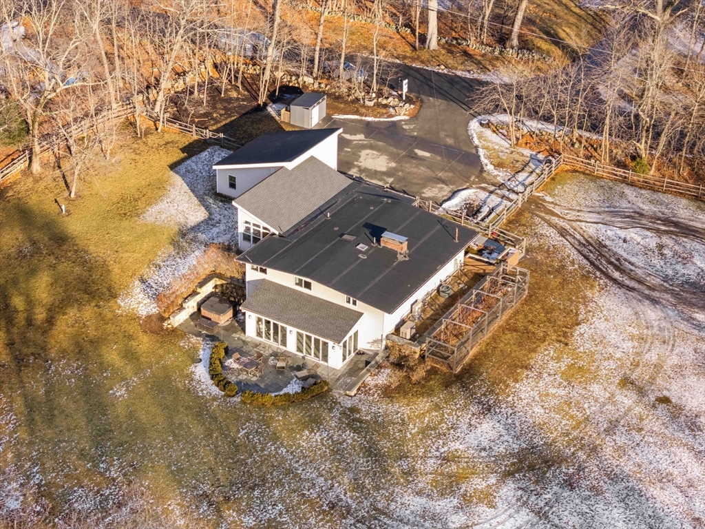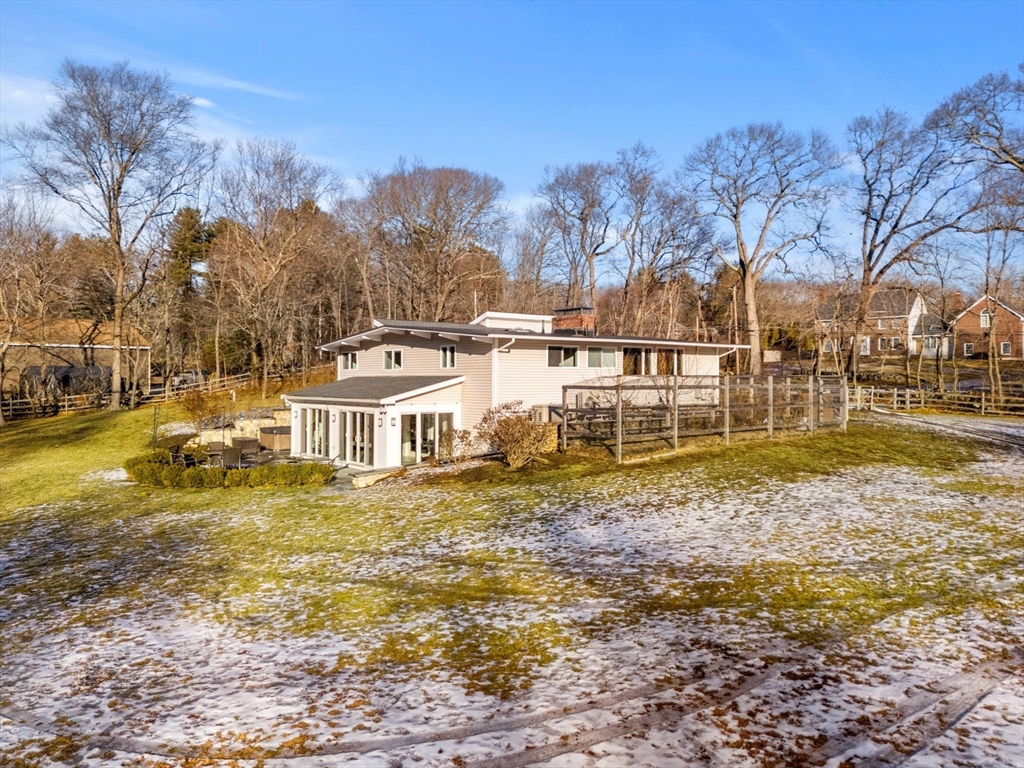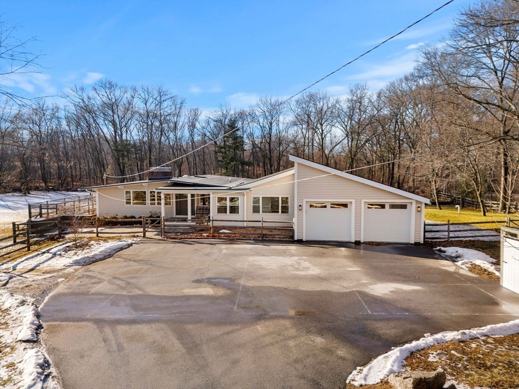 Stunning, move-in-ready Mid-Century Modern home set on over four private acres in a sought-after Estate location. Renovated in 2021 with multiple additional recent improvements, this exceptional property offers the ease of single-level living with the primary suite and two additional bedrooms on the main floor. The open-concept layout features a chef’s eat-in kitchen flowing seamlessly into a fireplaced living area, while a separate dining space showcases walls of windows that flood the home with natural light. The finished lower level offers an expansive family room with sliders leading to a brand-new sunroom addition overlooking the bucolic grounds. A fourth bedroom with an oversized walk-in closet, spacious laundry room, and dedicated home office complete this level. Dog lovers paradise, three acres are fully fenced. Irrigation system, whole-house generator, hot tub, and a garden with peach trees. A special property offering privacy, style, and modern comfort.