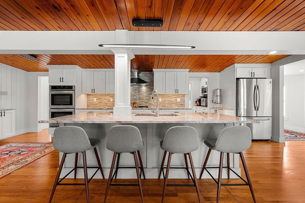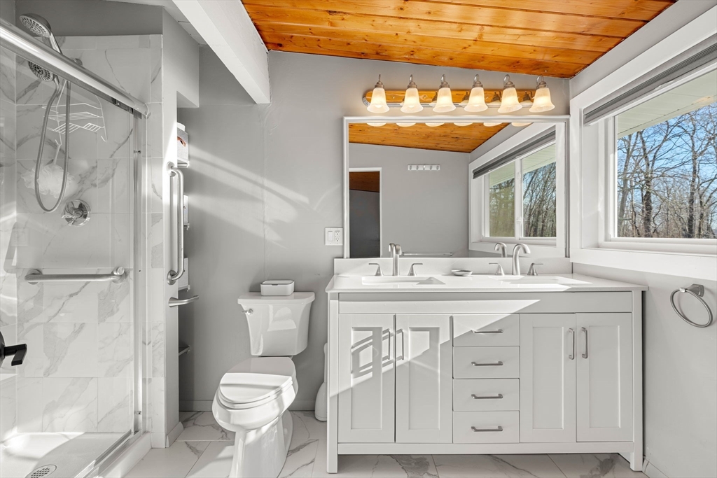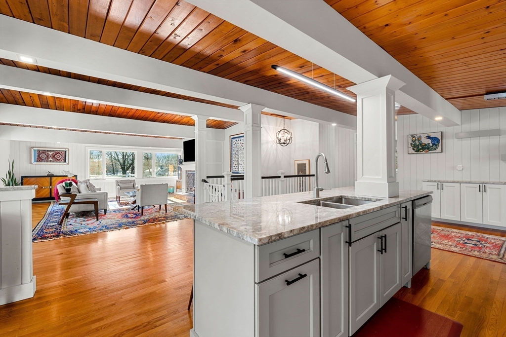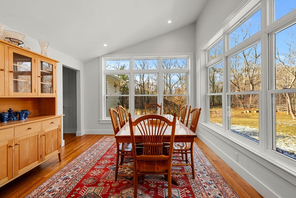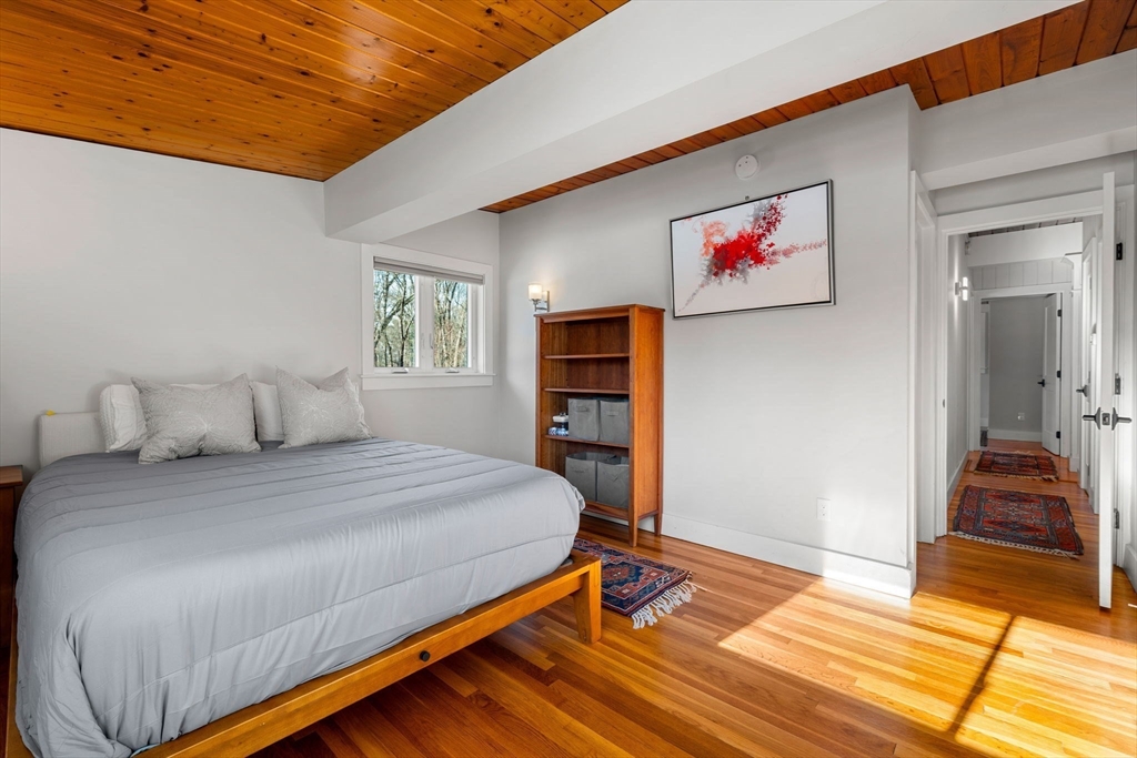 Stunning, move-in-ready Mid-Century Modern home set on over four private acres in a sought-after Estate location. Renovated in 2021 with multiple additional recent improvements, this exceptional property offers the ease of single-level living with the primary suite and two additional bedrooms on the main floor. The open-concept layout features a chef’s eat-in kitchen flowing seamlessly into a fireplaced living area, while a separate dining space showcases walls of windows that flood the home with natural light. The finished lower level offers an expansive family room with sliders leading to a brand-new sunroom addition overlooking the bucolic grounds. A fourth bedroom with an oversized walk-in closet, spacious laundry room, and dedicated home office complete this level. Dog lovers paradise, three acres are fully fenced. Irrigation system, whole-house generator, hot tub, and a garden with peach trees. A special property offering privacy, style, and modern comfort.