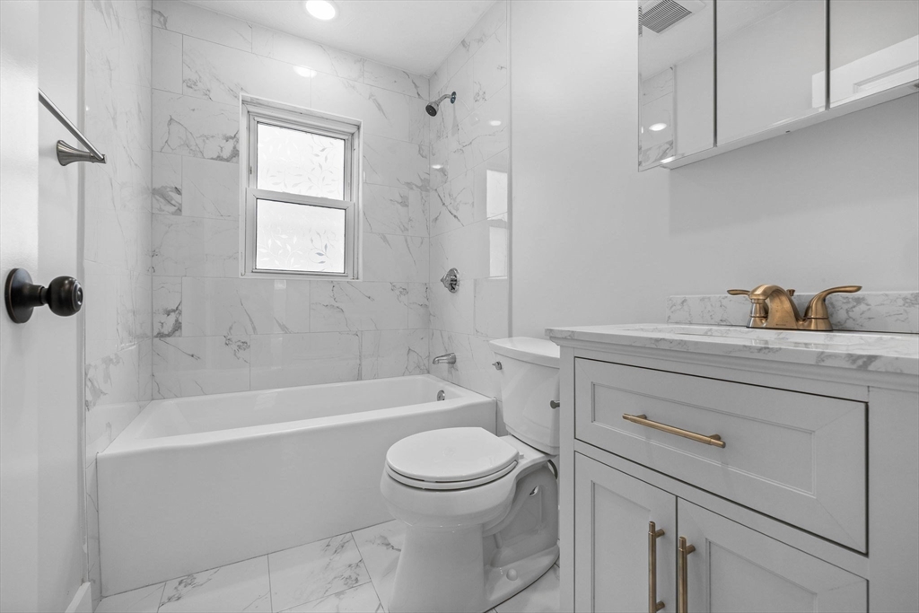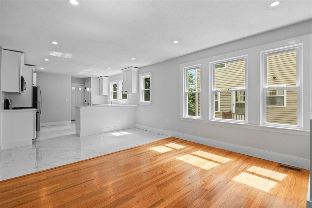 Renovation completed last year! This 3BR / 1.5 bath spans across the entire first floor and features in-unit laundry, central air conditioning, and a convention location with minutes of Northeastern University, Longwood Medical, and downtown Boston. A hard to find modern, open concept kitchen and living area highlighted by white quartz countertops, shaker cabinetry, breakfast bar, and gas cooking. Other desirable features include above average natural light, recessing lighting, a rear deck, and hardwood floors. One parking space in the driveway (tandem) is included. Furnace and all appliances are new from 2025! Floor plan attached (last photo).