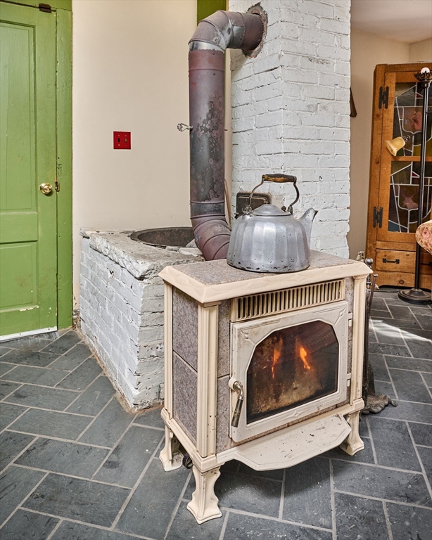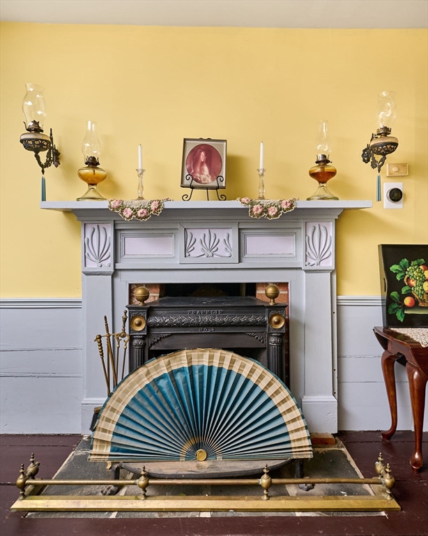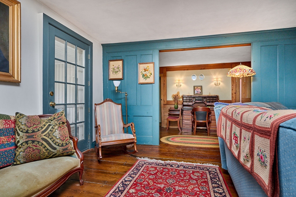 Elegant historic home has many antique features, 5 fireplaces, bullet glass above front door and much of the original paneling It is set on 3 acres of level pasture w/fruit trees, berry bushes & perennial beds. Property is a sanctuary of peace & privacy. There are 13 rooms – close to 3500 sq ft - 4 bedrooms (2 w/fireplaces), 2.5 baths, formal LR and DR + Breezy Family Room opens to Goshen Stone patios. Modern addition includes a formal entryway, 1/2 bath, walk-in closet, 1st flr laundry room, 2 car garage (26x26) & Master Suite w/beautiful windows + Master bath w/deep jetted tub & separate shower. Spacious living room has a woodstove and beautiful doors that open to the patio. Fiber Internet is available for all of your home office needs! Electric Dog fence. For the nature lover, there are miles of trails in the nearby Hawley State Forest, & Plainfield Pond.