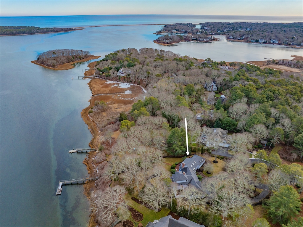 Experience the waterfront allure of Punkhorn Point ! Sited on a 1.78 acre lot, this beautiful Contemporary home has water views from all rooms. Enjoy boating from your private dock. The first floor primary suite includes hardwood floors, cathedral ceiling, walk-in closet with skylight and an elegant bath with whirlpool tub and full tiled shower. The home features 3 additional bedrooms, first floor office, sunken living room, dining room with fireplace. family room with beautiful built-ins, fireplace wet bar & a comfortable screened-in porch. The traditional gourmet kitchen features skylights, cathedral ceiling, Wolf appliances, granite countertops and Sub Zero refrigeration as well as a lovely breakfast nook. There is an expansive deck to relax or entertain all summer long! With Mashpee Commons and South Cape Beach close by this private, yet convenient location is perfect for all your needs.
