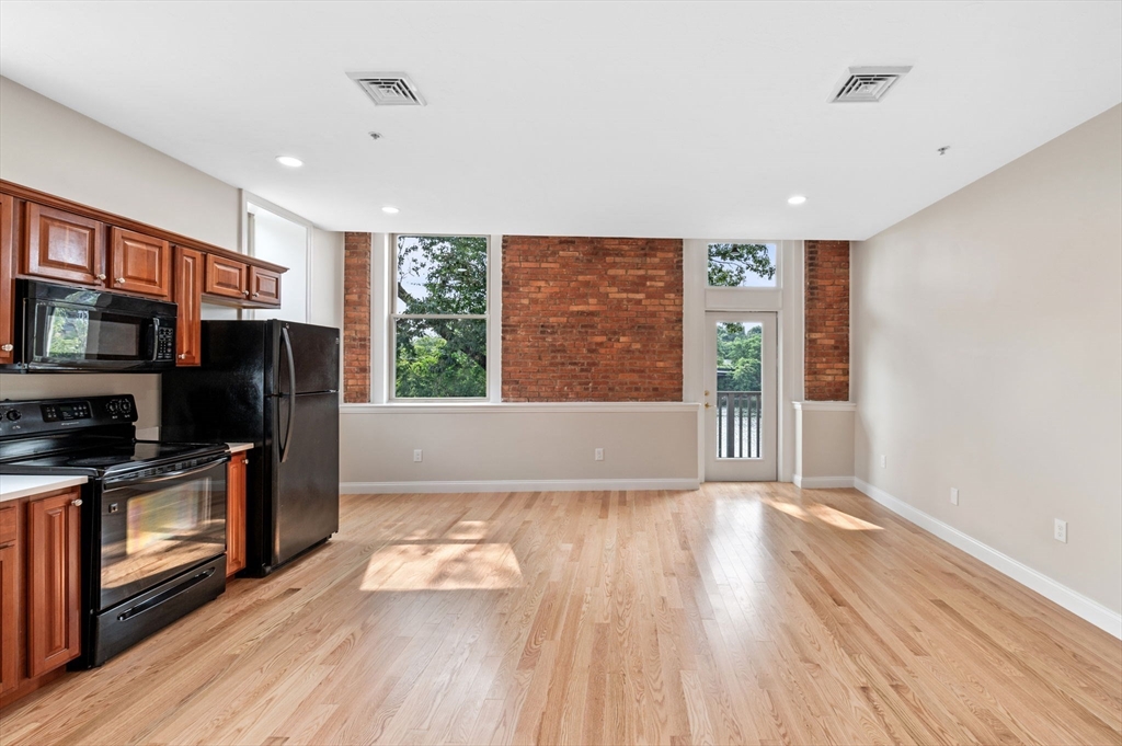 Open House Sat 1/17 & Sun 1/18 11a-12p! 2 Bedroom sun-splashed unit in brick elevator served waterfront building. Fantastic water views from your private balcony overlooking the river. Lots of charm with Exposed brick, gleaming hardwood floors throughout. Open concept kitchen/ Living room, Updated eat in kitchen with new granite countertops. Fresh paint and updated tiled bath. Central A.C, Full size laundry in unit. Whole building was gut renovated with updated electrical, roof, plumbing, heating etc within last 15~ years. 1 assigned parking space on-site. Pet friendly association. Storage in basement. Located within walking distance (5 minutes) of Downtown Haverhill, close to the Train Station and Passaqua Playground Park. Lots of restaurants and dining spots close by.