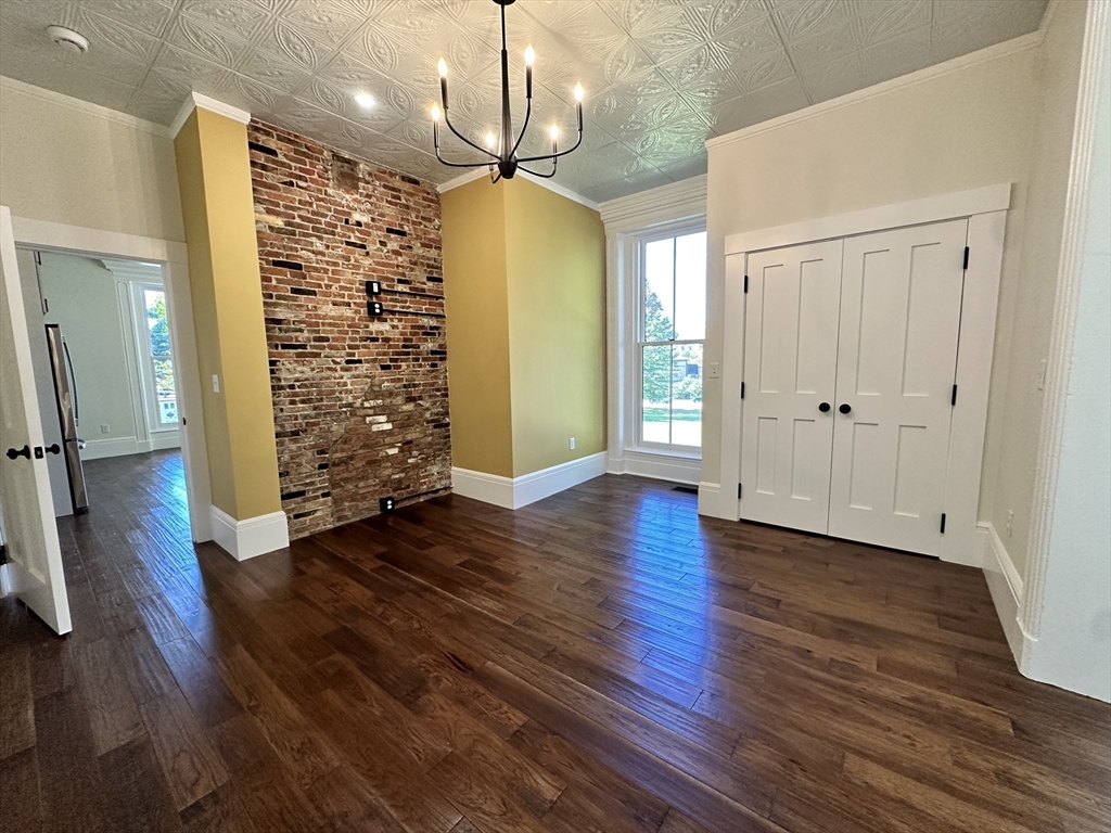 This 789 sf, first floor unit offers stunning views of downtown Groton with 8-foot windows in the living area that provide plenty of natural light. The 9’10’ ceilings boast the original bespoke decorative ceiling. The unit offers an open concept kitchen, living and dining area, a large 1 bedroom, 1.5 baths as well as a bonus 8’10 x 6’8 area that can easily be used as a workspace or sitting area adjacent to the bedroom. A stacked washer and dryer are located in the bathroom off the bedroom. The wine cooler, Energy Star electric stainless appliances and open living floor plan make this a breathtaking unit that will be both functional and comfortable. The marble fireplace with electric insert adds a coziness to the living space. Lockable, climate-controlled storage in basement is available.