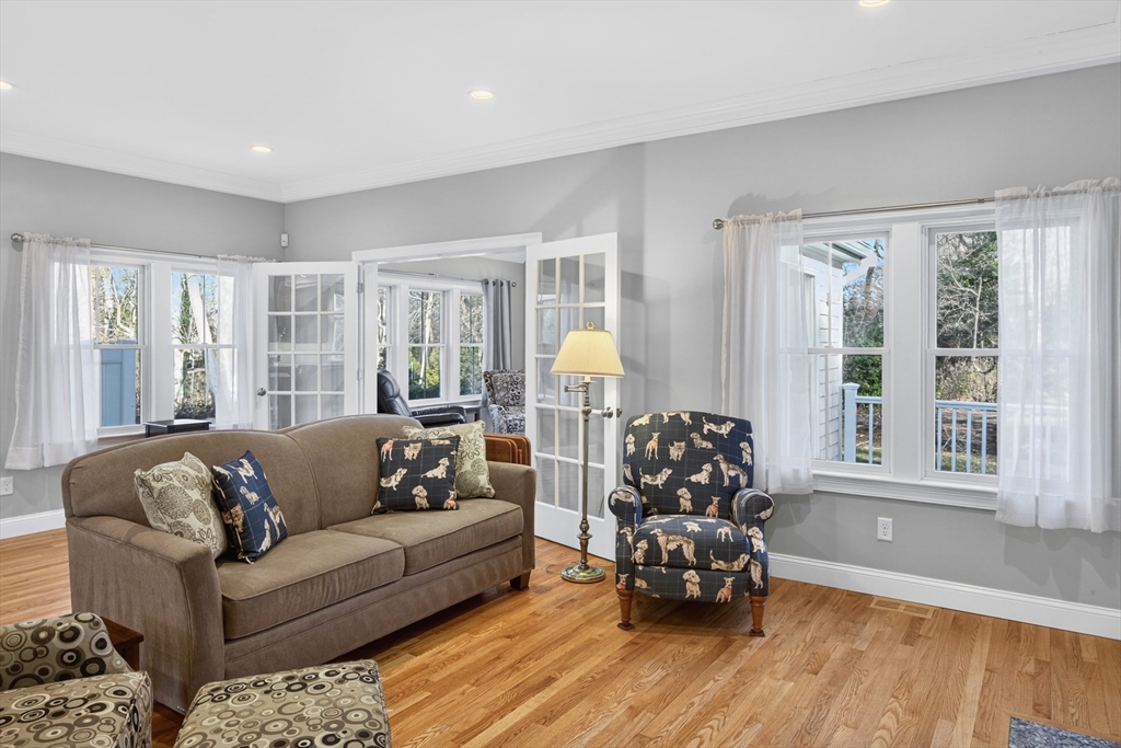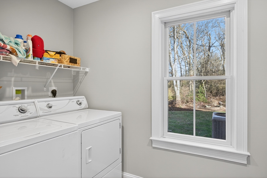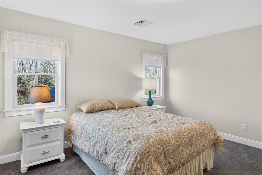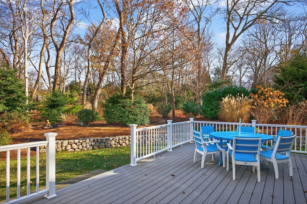 Thoughtful, turn-key custom home completed in 2017, this 3 BR, 2.5 Bath, 2,356 sf home sits comfortably on a wonderfully landscaped 1-acre lot within a private three-home cul-de-sac just around the corner from the heart of Yarmouth Port Village and some of Cape Cod's finest restaurants. The sun-drenched, open-concept first floor includes 11' ceilings and hardwood flooring throughout. It encompasses a well-appointed kitchen, a living room with a gas fireplace, a dining room, and a sunroom that opens onto a secluded deck and backyard. Also on the main level are a generous primary bedroom suite with a private full bath, a laundry room, and a powder room. Upstairs, the second floor offers two additional bedrooms sharing a full bath, as well as a versatile loft. The clean, dry lower level provides a dedicated workshop area and ample storage. Additional amenities include an attached two-car garage, security system, outdoor shower, irrigation system, AZEK trim, and whole-house generator.