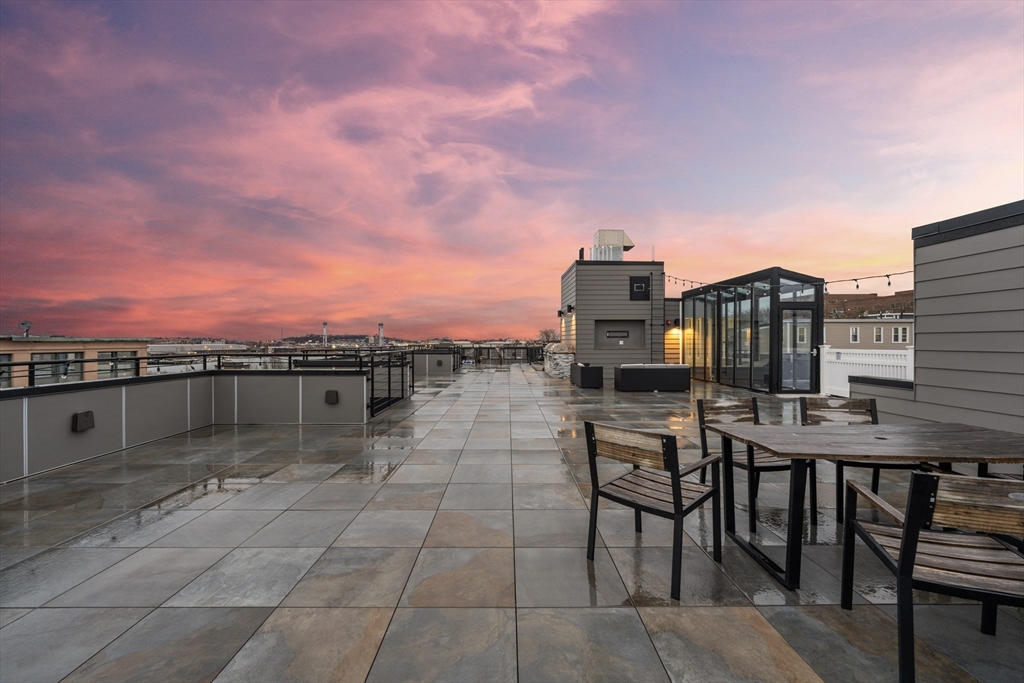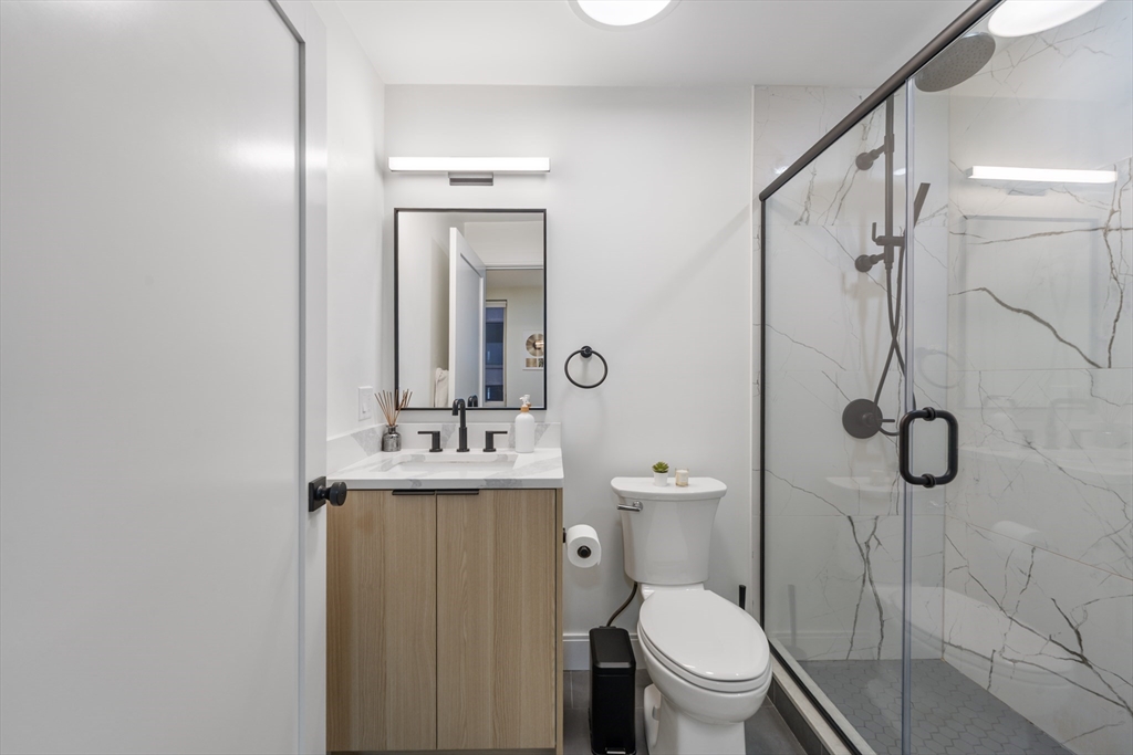 OPEN HOUSES SAT 1.17 and SUN 1.18 11am-1pm. Welcome to this beautifully updated East Boston 2-bedroom, 2-bathroom condo with 942 square feet and deeded garage parking with electric charging capabilities! Step inside to gleaming hardwood floors and a kitchen featuring high-end Bosch appliances, sleek quartz countertops with a waterfall edge, seamless backsplash, and frameless cabinets—perfect for cooking and entertaining. Expansive floor-to-ceiling windows fill the space with natural light. The living room boasts a custom quartz mantle with a built-in fireplace and recessed TV, a truly luxurious look! The primary bedroom offers a large walk-in closet and en-suite frameless glass shower. Enjoy modern Apple Home smart lighting and the convenience of an in-unit washer/dryer. Built in 2021, this elevator building also features a 3000+ square foot common roof deck with a wet bar, gas grills, and Chelsea Creek water views!