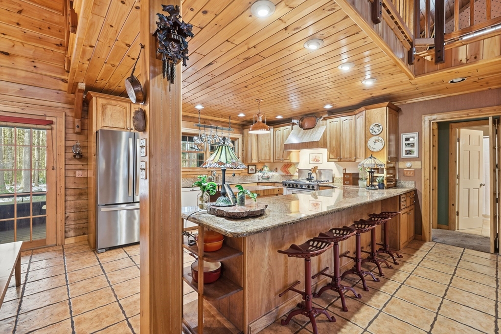 The perfect blend of comfort, privacy, and natural beauty, this enchanting home is nestled down tree-lined driveway on 12+ acres abutting conservation land. Gracious single-level living with an airy open-concept anchored by soaring wood-beamed ceilings and a stone fireplace with Harman pellet-stove insert. Multiple French doors throughout open to spacious rear porch, screen porch, and 850 sq.ft. Goshen stone patio, walkways, and walls. The generous kitchen offers granite counters, birch cabinetry, long breakfast bar, and walk-in pantry. Two bedrooms sit on one side of the home, along with a full bath. On the opposite side is the primary suite with French doors to the porch and a bath featuring soaking tub, double vanities, and glass shower. An open second-floor loft includes built-ins for storage and workspace. Partially finished lower level has high ceilings and large workshop. Beautiful woodwork, wood windows, and a handsome 50-year steel roof complete this exceptional retreat.