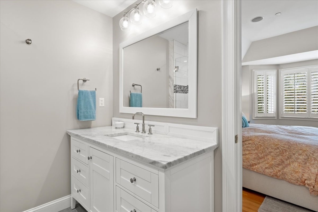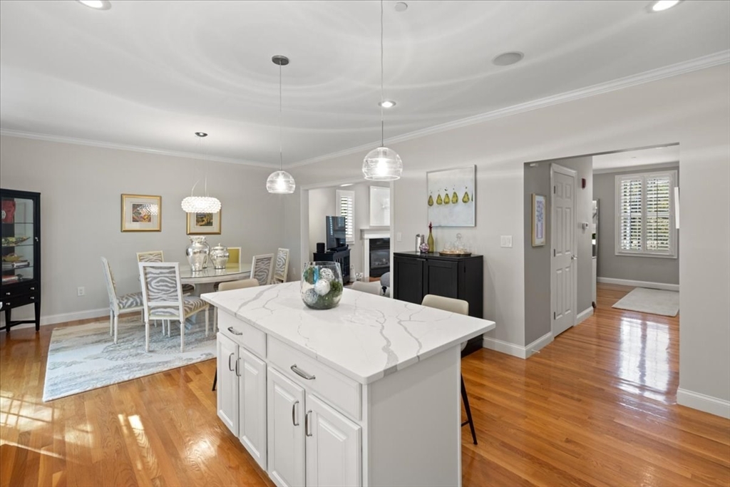 Exceptional and sophisticated end-unit townhome at Brook Farm Woods! Conveniently located to Longwood Medical, Commuter Rail/Green line, Chestnut Hill, Route 9. Great layout with direct garage entry to foyer + 1st level offers new tile and paint, laundry, full bath, and family room with gas fireplace—ideal for guest suite or home office. Main level features open floor plan with high ceilings, crown moldings, hardwood floors, sun-filled living room with 2nd gas fireplace, open to dining area and deck overlooking greenspace. Gorgeous, renovated kitchen with quartz counters + island, white cabinetry, stylish backsplash, and updated SS appliances. Half bath completes this level. Top floor offers 3 bedrooms and 2 new marble full baths, including a stunning primary suite with walk-in shower. Excellent storage throughout! Nothing to do but move in and enjoy!