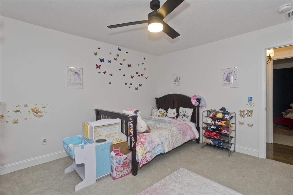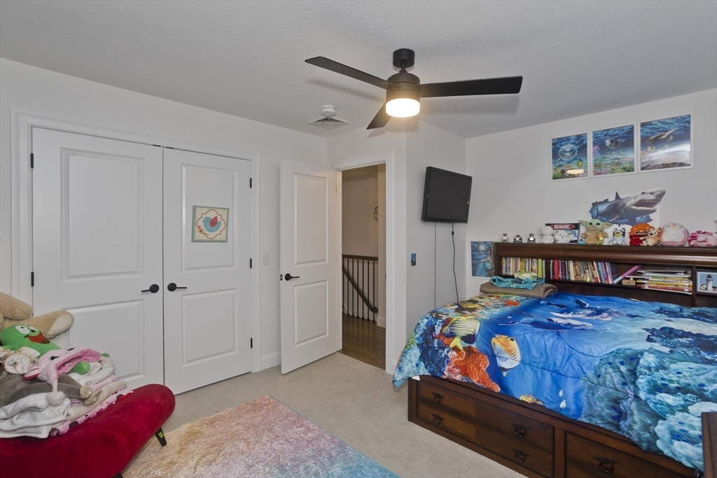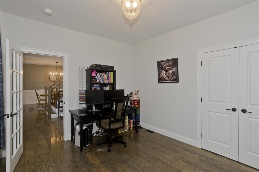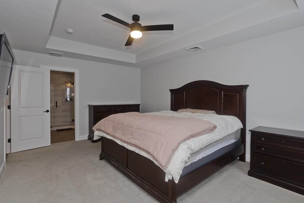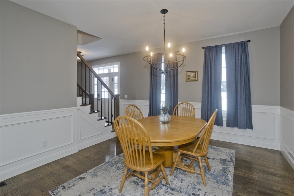 Built in 2023, this 4-bedroom, 2.5 bath Craftsman-style Colonial offers a move-in-ready opportunity with all the advantages of new construction—without the wait. The light-filled, open floor plan is ideal for everyday living and entertaining, featuring a spacious dining room with wainscoting that flows into a stunning great room with cathedral ceilings, exposed beam details, and a fireplace with a custom mantle. The kitchen offers custom cabinetry, quartz countertops, stainless steel appliances, a designer hood, and a pot filler, with hardwood flooring throughout the main living areas. A first-floor bedroom or home office adds flexibility, along with a large pantry and laundry room. There is also a custom entryway drop zone bench. Upstairs, the primary suite includes a soaking tub and tiled shower, plus two additional bedrooms and a full bath. Enjoy front porch sunsets and scenic views overlooking The Ranch Golf Course. Sprinkler system and landscaping are already in place.