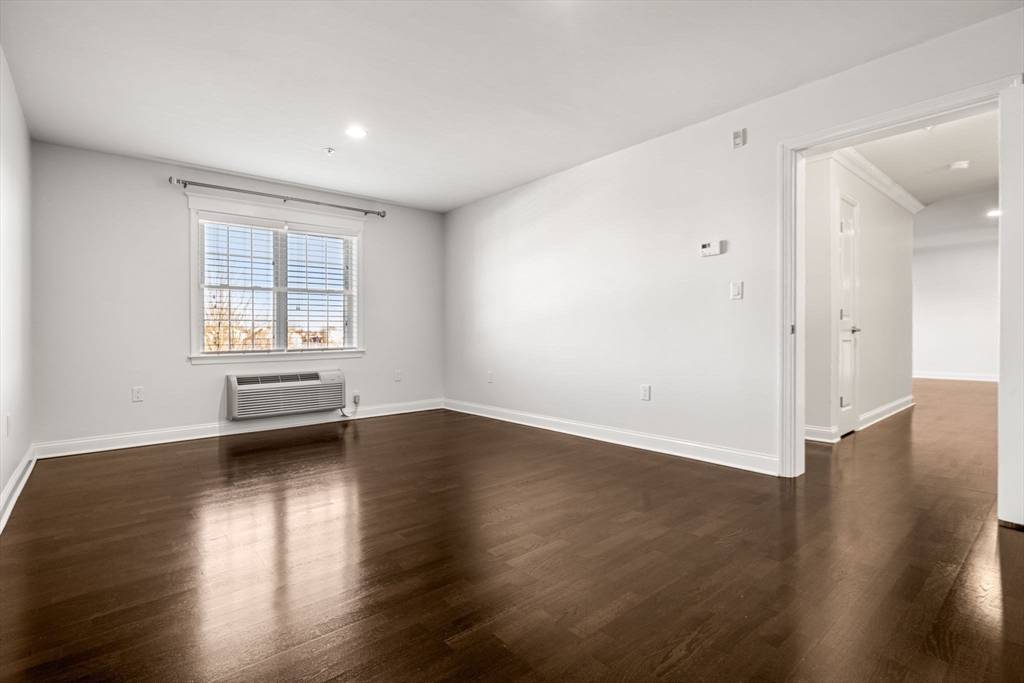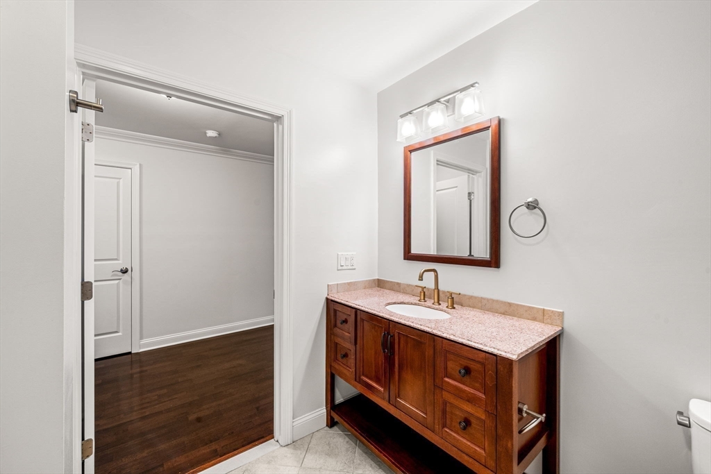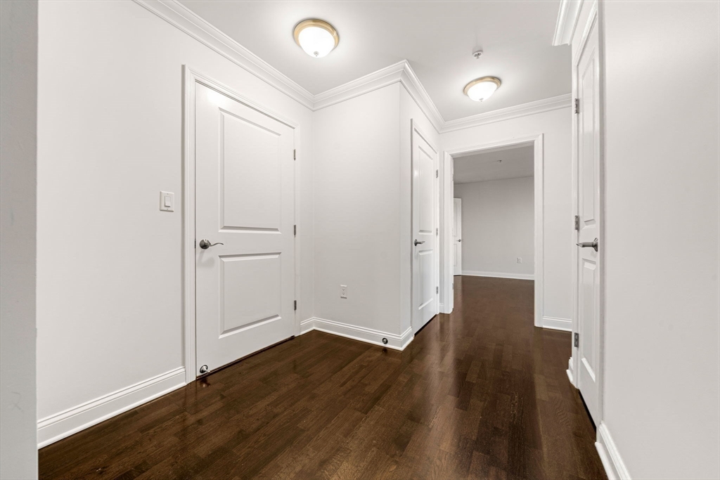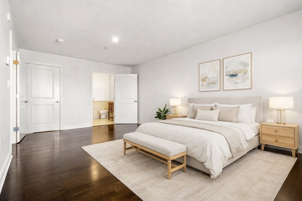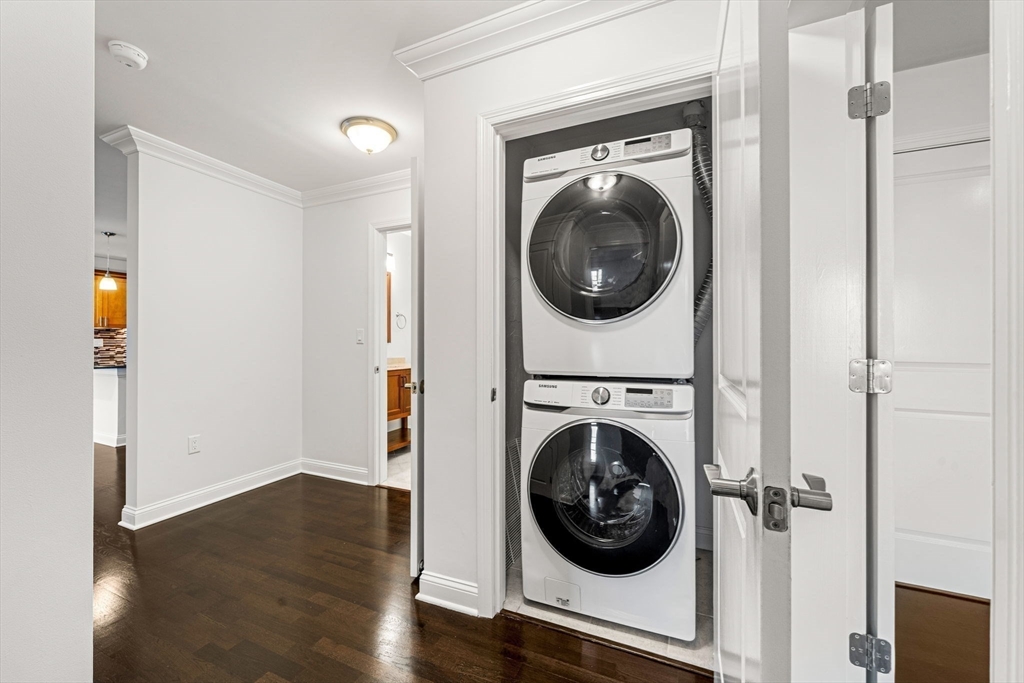 Welcome to this bright east-facing penthouse, where morning sunlight fills an open and inviting floor plan just moments from the North Quincy T. The designer kitchen features granite countertops, Schrock cabinetry, and GE Adora stainless-steel appliances including a five-burner gas range, opening to a generous living area with space for dining and access to an oversized private, covered balcony—perfect for enjoying sunrise views. The entry offers space to create a mudroom drop zone, leading into a hall with in-unit laundry, ample storage, and full bath. The primary suite includes a large walk-in closet and en-suite full bath, complemented by a spacious second bedroom with a large closet. Details include crown molding, Kahrs hardwood floors throughout, electronic key pad entry, and efficient three-zone heating/cooling. Excellent commuter location with elevator, 1 deeded/assigned parking, and close proximity to highways, MBTA, shops, Stop & Shop, restaurants, and Wollaston Beach.