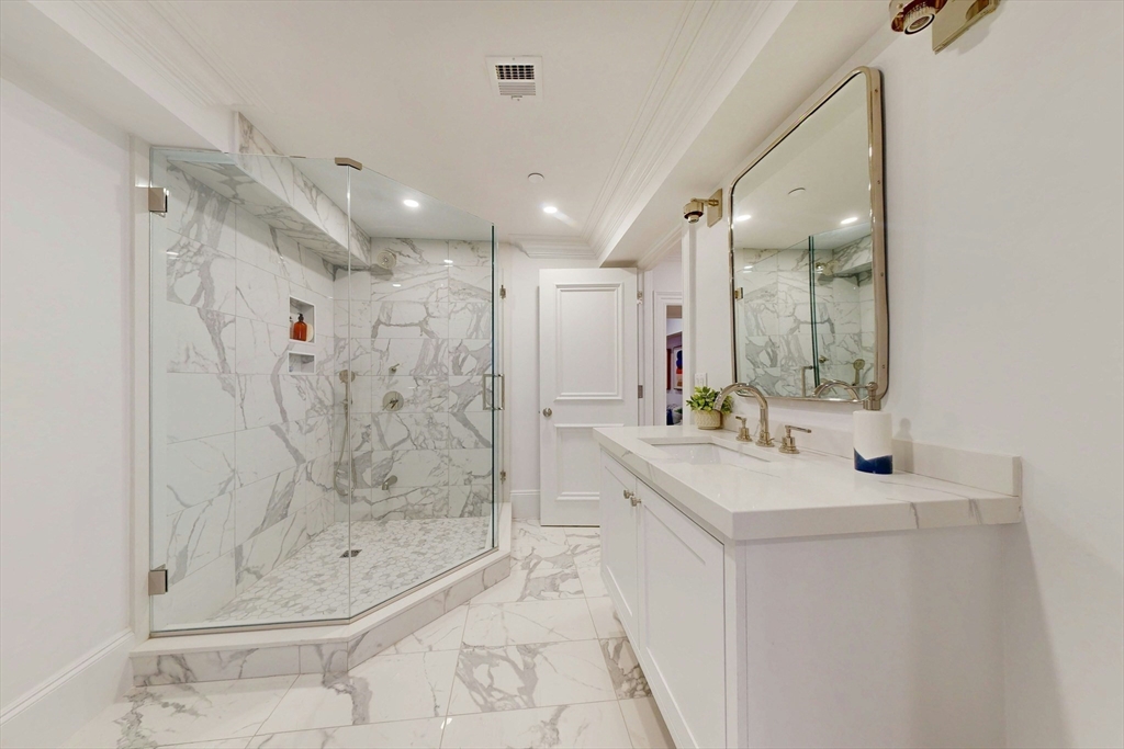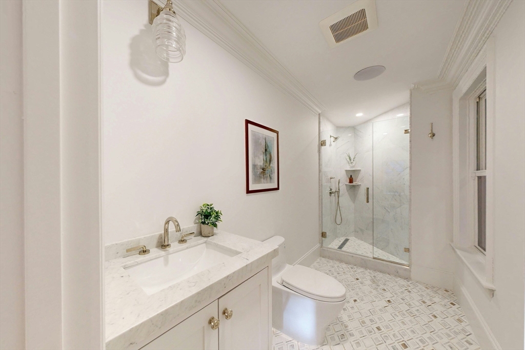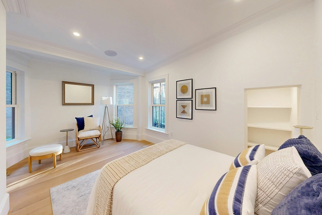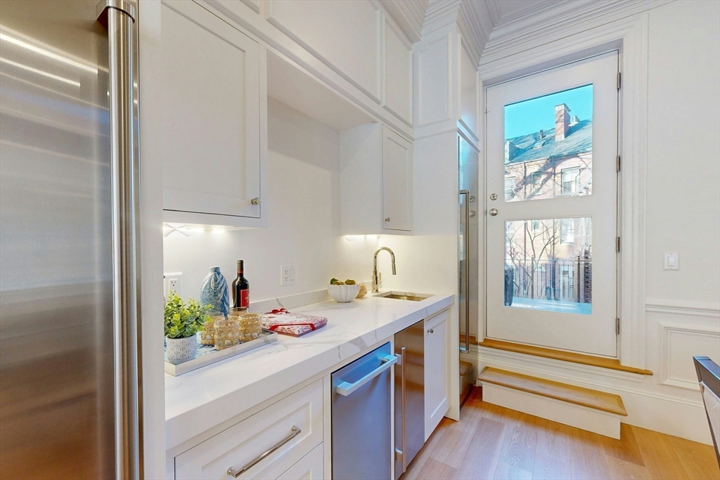 CONSTRUCTION COMPLETE. Brand new restoration four bedroom four and a half bathroom triplex home located on the highly sought after Southside of Beacon Hill steps to both the Boston Common and Louisburg Square. This south facing townhouse located up off the street with professionally landscaped front yard has undergone a complete and total restoration creating a two unit association. Residence one encompasses the three levels of the property and boasts two private outdoor spaces. Parlor level master suite with high ceilings, floor to ceiling south facing windows, large walk-in closet and marble bath. There are three guest bedrooms all with ensuite baths. The second floor wide open living, kitchen, dining level has a private office, full wet bar, sun filled south facing bay window and deck. The garden level houses a a second living/family room with wet bar and home gym/wine cellar. Private courtyard. Elevator. Brand new construction.