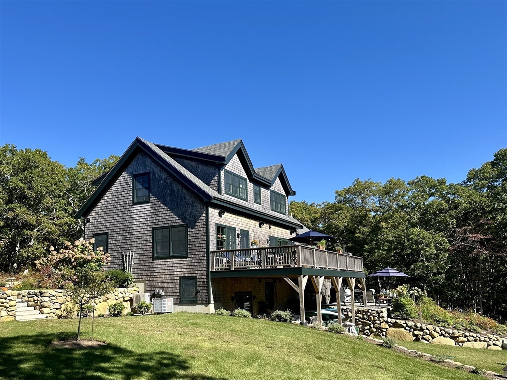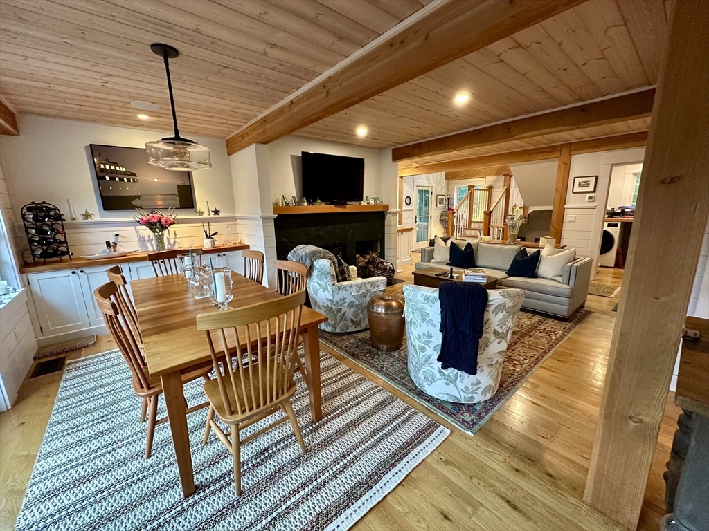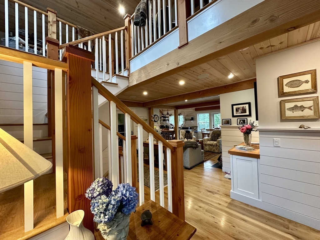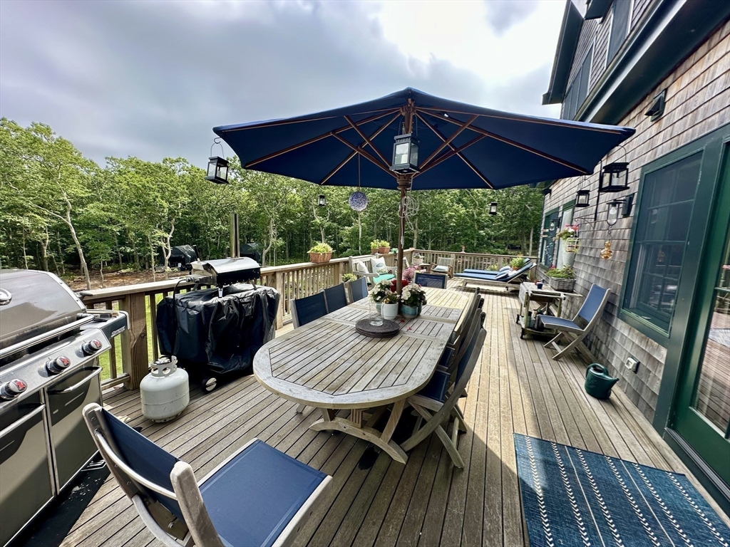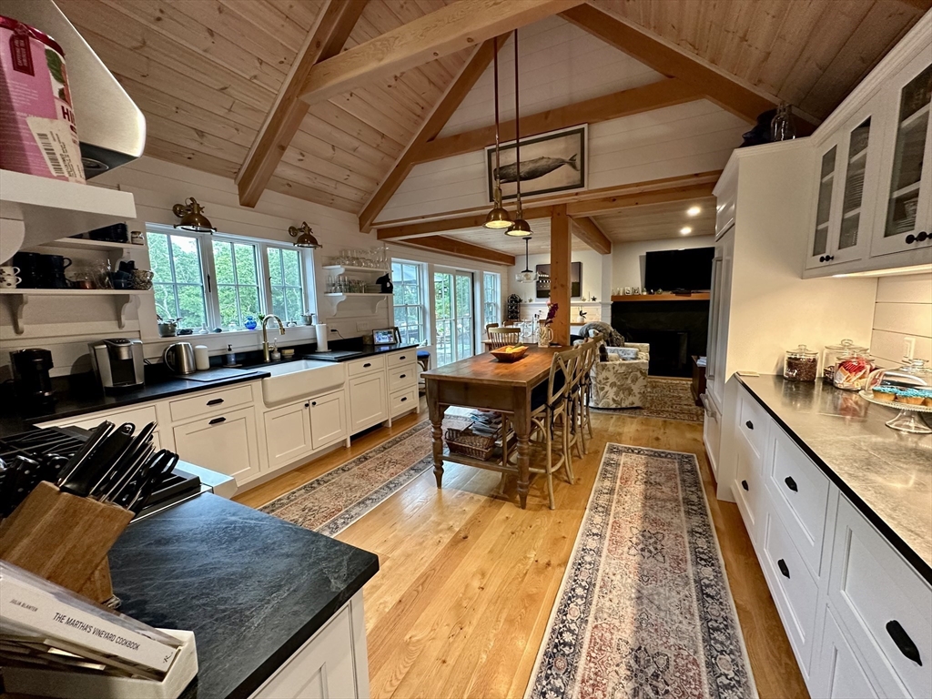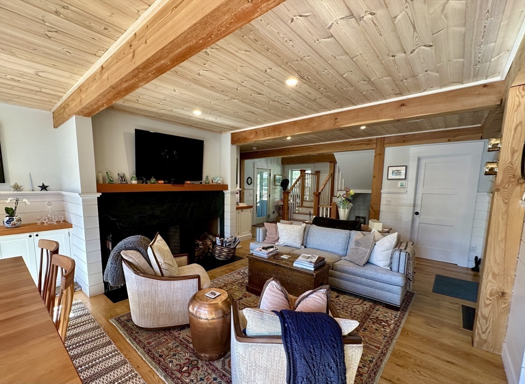 Beautifully designed and built Post & Beam style home is tastefully thought out and meticulously maintained. The open living, dining and kitchen feature custom built-ins, a wood burning fireplace and a fabulous gourmet kitchen with Wolfe 8 burner professional style stove, Sub Zero refrigerator, Boshe dishwasher, soapstone counters and a butlers pantry with extra cupboards, shelving and a wine refrigerator. There are sliders that take you to an oversized deck and stairs to a blue stone patio and beautiful gardens. The screened-in porch off the living room steps out to the side yard, patio and outdoor shower. First floor Primary with walk-in closet, access to the deck and a private en-suite bathroom with beautiful tiled steam shower and large soaking tub. Second floor includes a loft with sitting room, 2 spacious bedrooms that share a full bath with shower and office, all with cathedral beamed ceilings. Many nice features throughout include white oak random width floors, marble and tile.