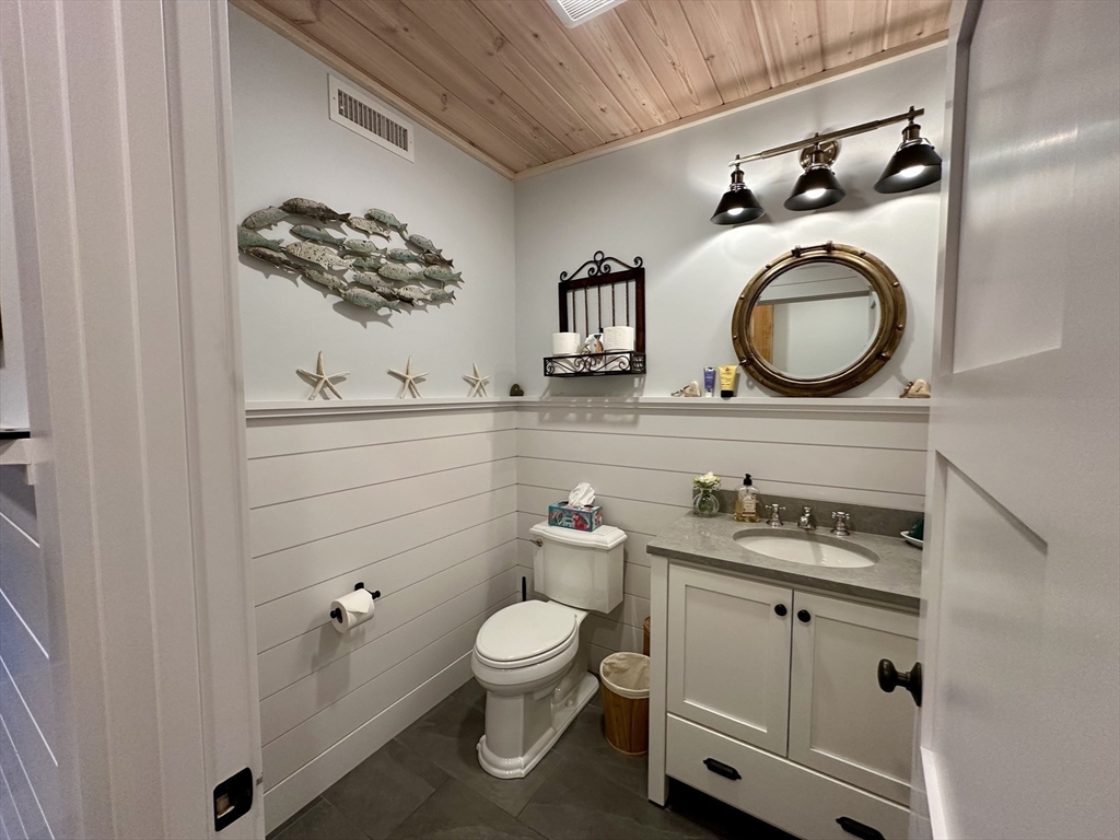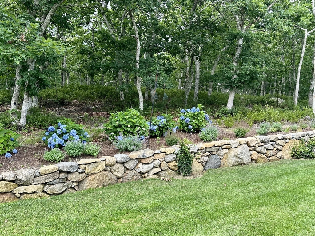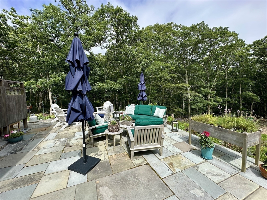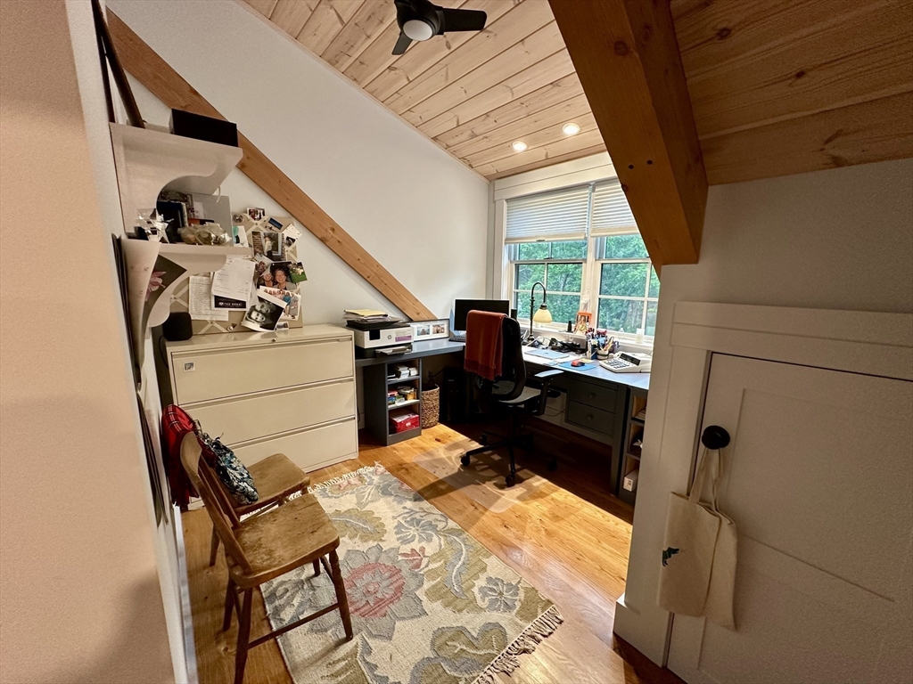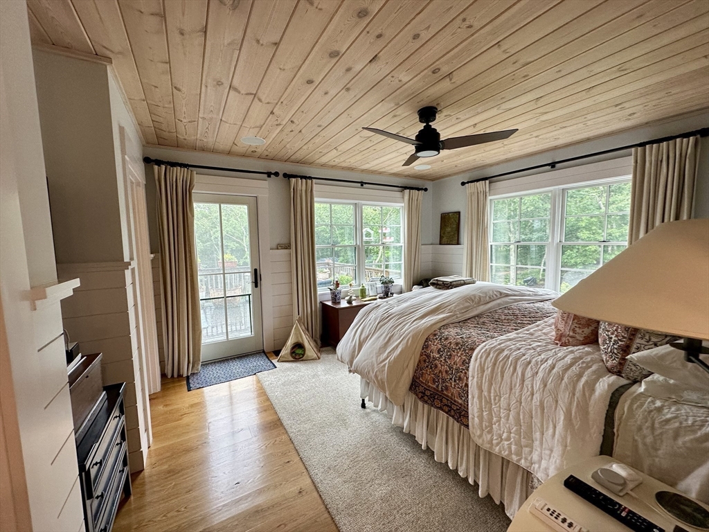Beautifully designed and built Post & Beam style home is tastefully thought out and meticulously maintained. The open living, dining and kitchen feature custom built-ins, a wood burning fireplace and a fabulous gourmet kitchen with Wolfe 8 burner professional style stove, Sub Zero refrigerator, Boshe dishwasher, soapstone counters and a butlers pantry with extra cupboards, shelving and a wine refrigerator. There are sliders that take you to an oversized deck and stairs to a blue stone patio and beautiful gardens. The screened-in porch off the living room steps out to the side yard, patio and outdoor shower. First floor Primary with walk-in closet, access to the deck and a private en-suite bathroom with beautiful tiled steam shower and large soaking tub. Second floor includes a loft with sitting room, 2 spacious bedrooms that share a full bath with shower and office, all with cathedral beamed ceilings. Many nice features throughout include white oak random width floors, marble and tile.