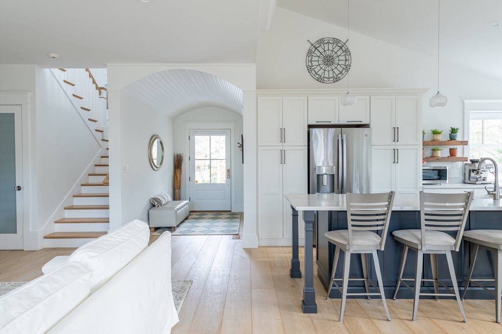 Built in 2023, this exceptional North Falmouth residence embodies refined coastal elegance and thoughtful craftsmanship. From sunrise to sunset, natural light pours through expansive windows, illuminating every room and creating a warm, inviting atmosphere throughout the home. Upon entry, a dramatic barrel-vaulted ceiling foyer sets the tone and leads seamlessly to the heart of the home. The kitchen, living, and dining areas are thoughtfully designed as a central hub for gathering and entertaining, offering both openness and connection.The chef’s kitchen features custom cabinetry, quartz countertops, and a nearly ten-foot island, ideal for hosting family and friends. The living room is anchored by a gas fireplace and custom built-ins, The first-floor primary suite allows for comfortable one-level living and is complemented by luxurious spa-inspired bathrooms featuring radiant heated floors, a steam shower, and a whirlpool tub. Two additional bedrooms up and a full bathroom.