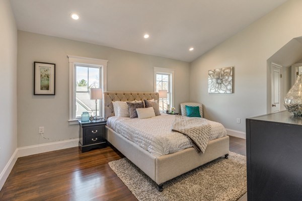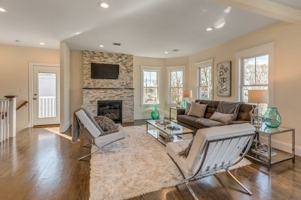 Sun-drenched 3BR/2.5BA townhouse on a quiet tree-lined street in West Medford! Open-concept living/dining/kitchen with hardwood floors, gas fireplace, and abundant natural light. Modern kitchen features Bosch appliances, wine fridge, quartz countertops, and custom cabinets. Spacious bedrooms with ample storage; primary suite boasts vaulted ceilings and en-suite bath with seated dual shower & double vanity. Additional perks: central A/C, private driveway (2 cars), private outdoor space, and large yard. Walk to West Medford Square, commuter rail, and Playstead Park. Luxury, comfort, and convenience in one perfect rental!