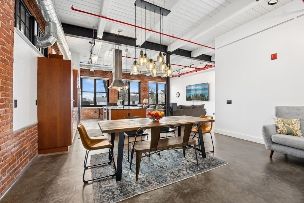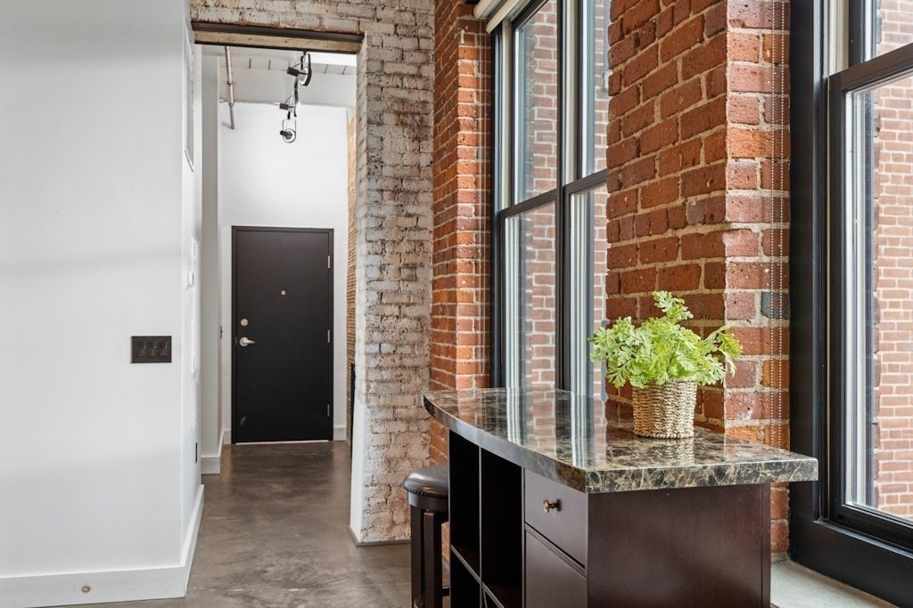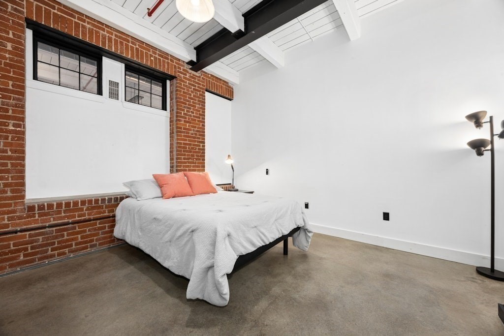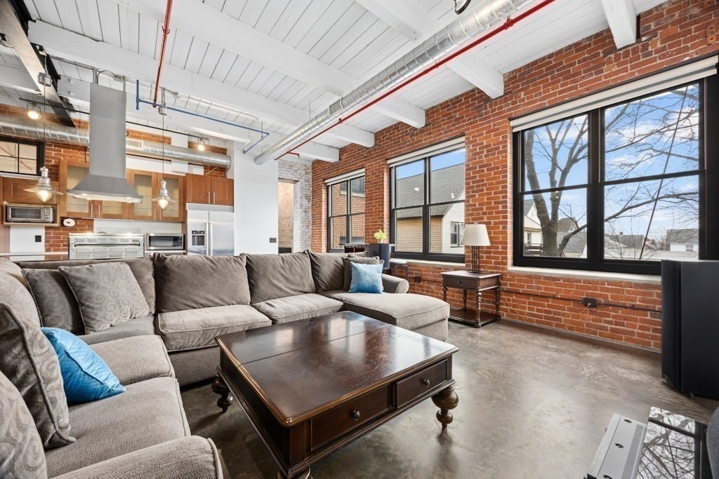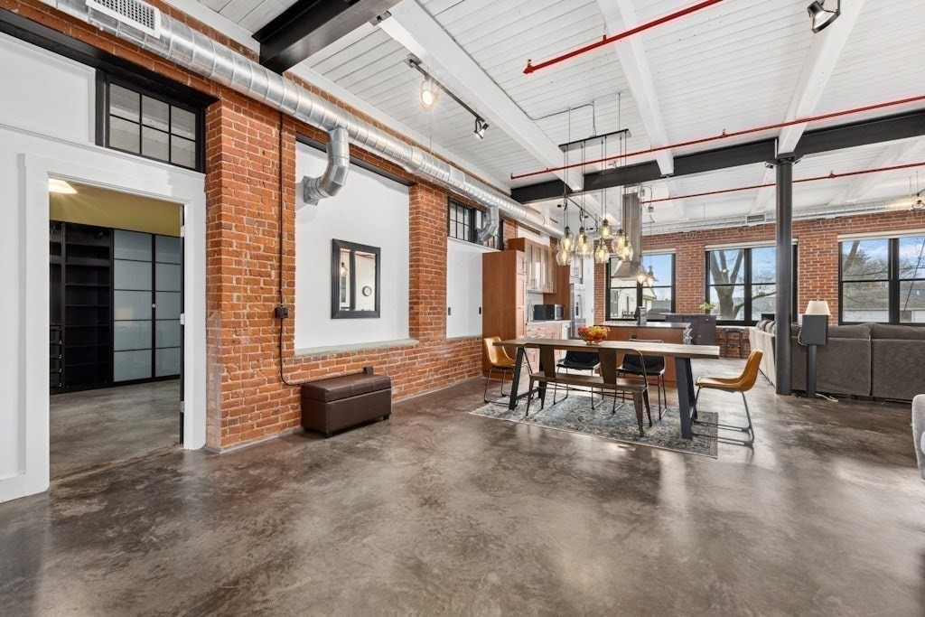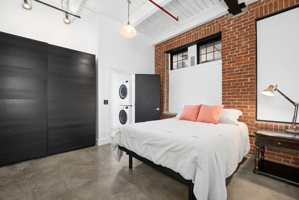 Loft living at its best! This distinctive 2-bedroom, 1-bath residence is rich in character, featuring exposed brick and beams, soaring ceilings, and oversized windows. Enter through the building’s interior courtyard and walkway, allowing natural light to pour into the main living space from both sides. The open-concept kitchen, dining, and living area is ideal for both everyday living and entertaining. Two generously sized bedrooms offer ample closet space and storage. The full bath and in-unit washer and dryer are conveniently located near the primary bedroom. Enjoy the benefits of a professionally managed building with basement storage and shared fitness room. A dedicated parking space completes this exceptional offering.