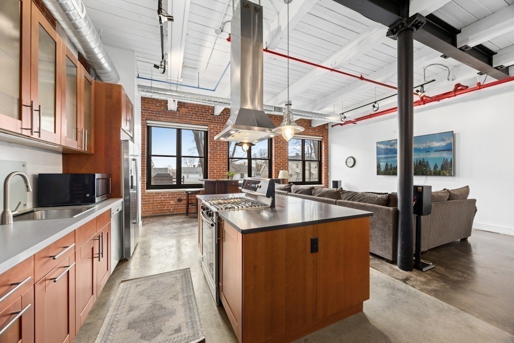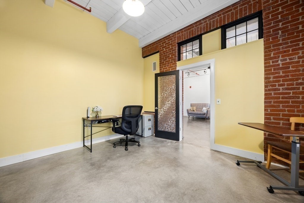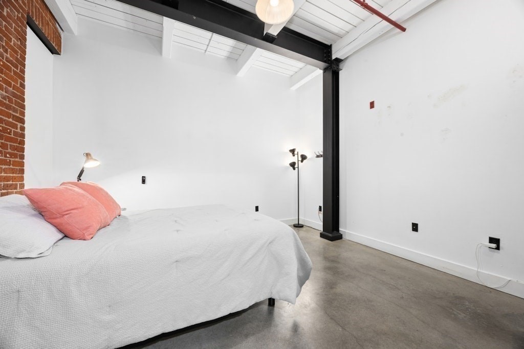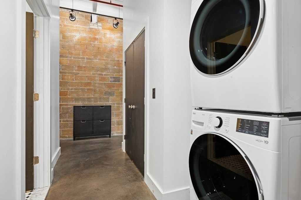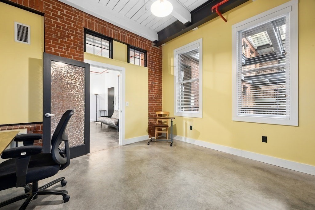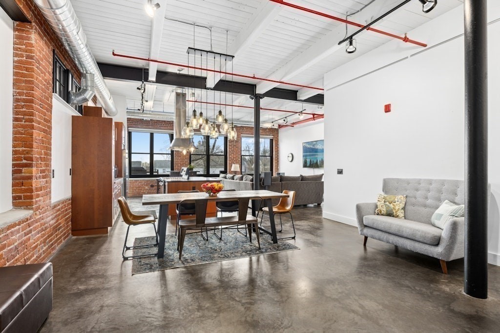 Loft living at its best! This distinctive 2-bedroom, 1-bath residence is rich in character, featuring exposed brick and beams, soaring ceilings, and oversized windows. Enter through the building’s interior courtyard and walkway, allowing natural light to pour into the main living space from both sides. The open-concept kitchen, dining, and living area is ideal for both everyday living and entertaining. Two generously sized bedrooms offer ample closet space and storage. The full bath and in-unit washer and dryer are conveniently located near the primary bedroom. Enjoy the benefits of a professionally managed building with basement storage and shared fitness room. A dedicated parking space completes this exceptional offering.