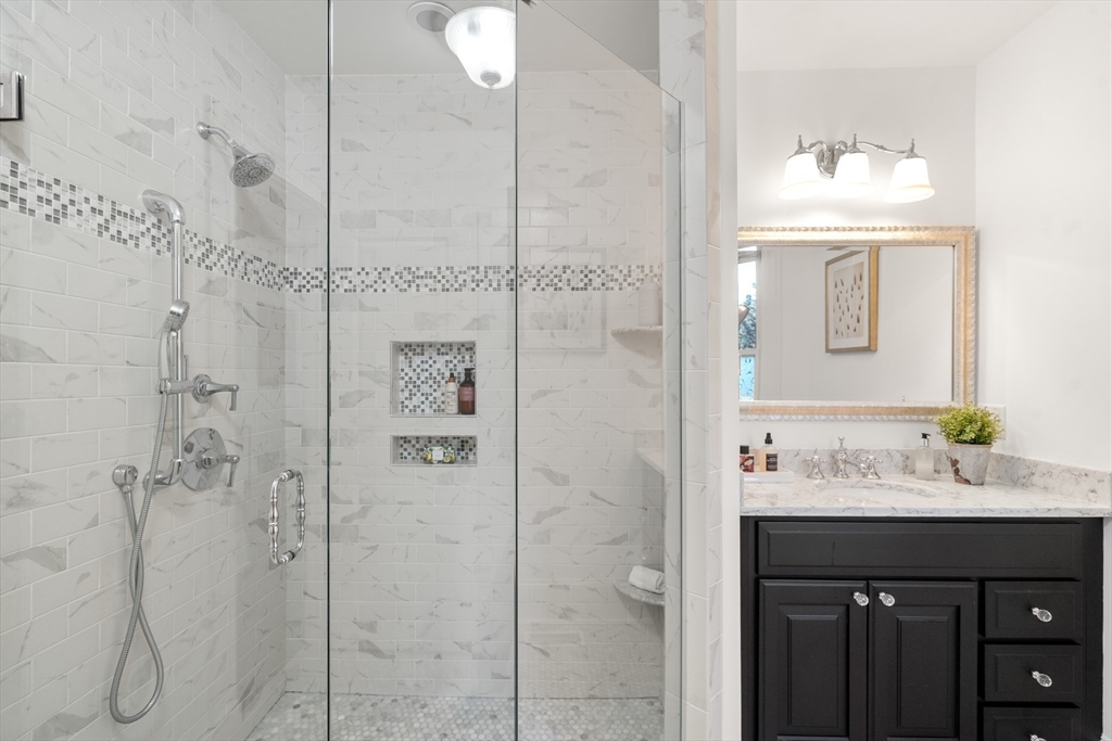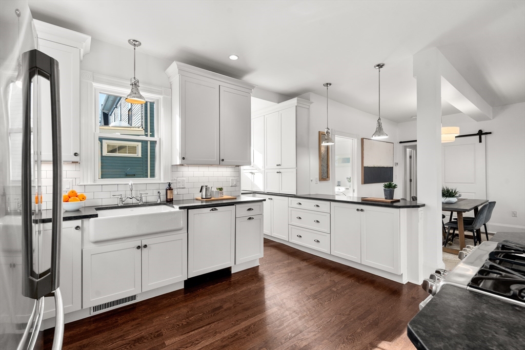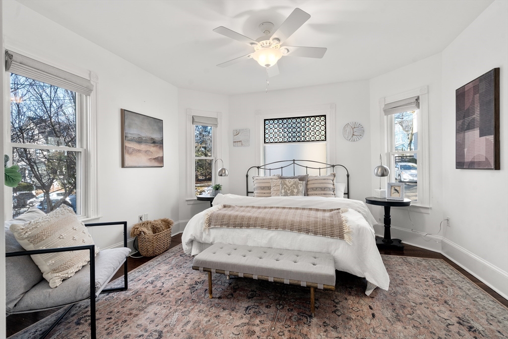 Set along a pretty side street lined with 19th c. houses and tall trees, this inviting 2BD/2.5BA is just 0.4mi to the Green Line at Gilman Sq and 0.3mi to the Somerville Community Path. The property enjoys an unusually wide 5,200sf lot offering great light exposures, fenced yard and 2-car parking for each unit. Expanded and renovated in 2015, the unit features an open plan with a smartly designed, remarkably well-appointed kitchen, a main level primary suite with tiled bath and great closets, a lower-level BR with full bath, a main-level half bath with laundry, central air, and private storage. In addition to private yard space, there is a side porch and rear deck exclusive to the unit. Lovely, rare & not to be missed!