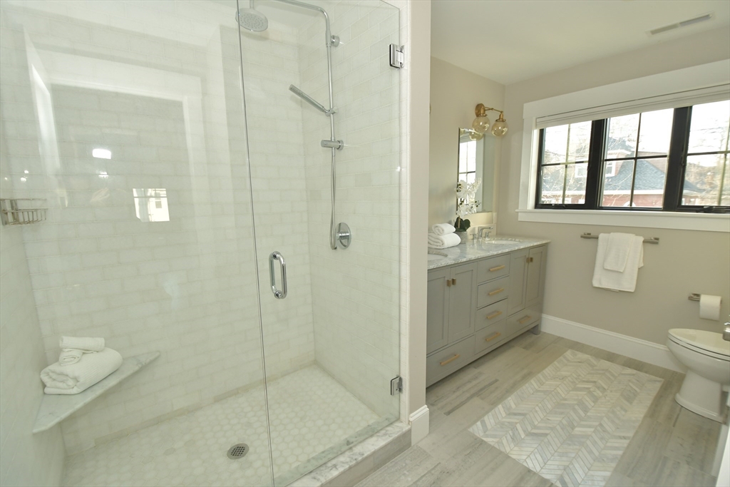 Sustainable luxury meets superior craftsmanship in this LEED-certified modern farmhouse. This south-facing end unit offers 4 beds and 3.5 baths across 3 levels of living with abundant sunlight, windows, and red oak hardwood floors. The main level features a chef’s kitchen with quartz counters and premium appliances, open to a dining and living room with a gas fireplace and direct access to a fenced, private patio and landscaped yard. Upstairs, 3 bedrooms incl. a primary suite with custom closet & bath, as well as laundry. The finished lower level has a large bonus room and guest suite perfect for bedroom or office incl. full bath and exterior access. Amenities include attached garage with EV charger, addl. parking, attic, and significant energy savings thanks to high-performance "tight" construction. Prime Newton Corner location near A-rated public elementary, middle and high schools, dining, express bus to downtown Boston, and easy access to the Mass Pike, Cambridge, and hospitals.