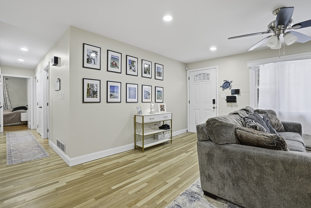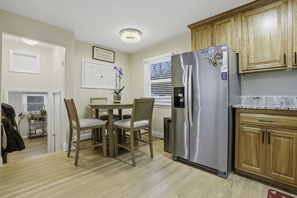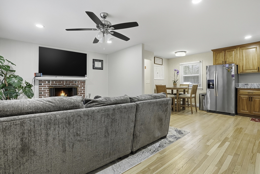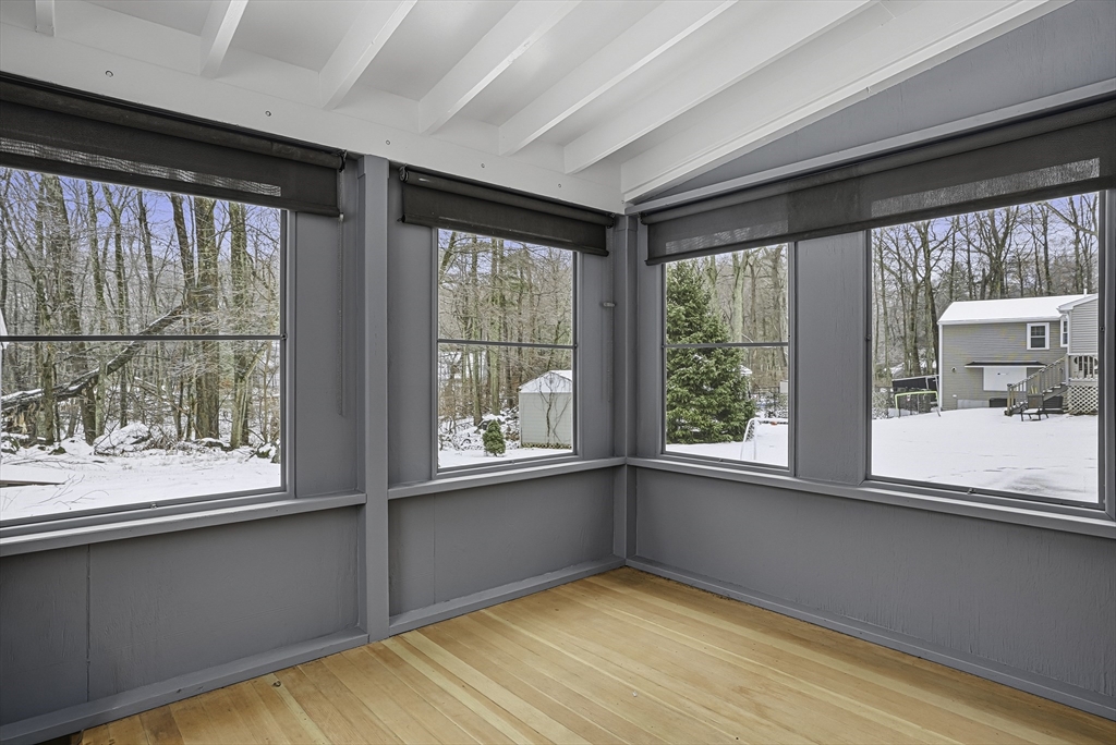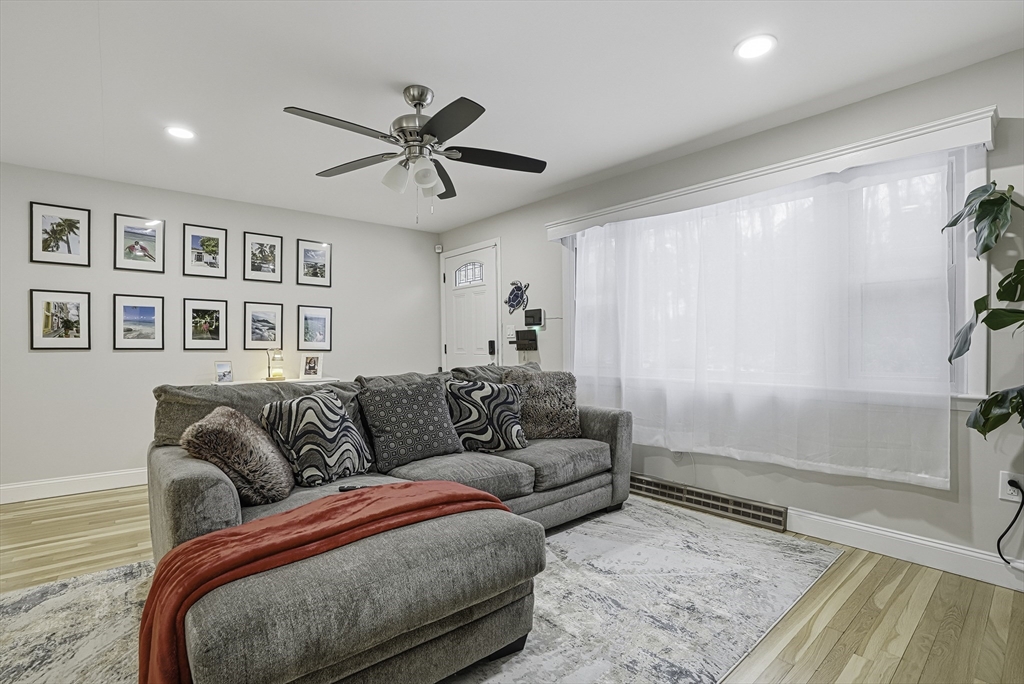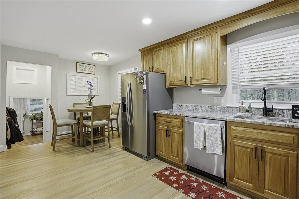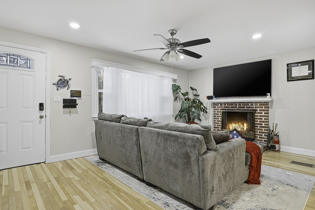 This lovely Ranch sits on a private, half-acre lot with two separate driveways. This is a very well maintained home. Features include a living room with fireplace ,hardwood floors throughout, newer kitchen cabinets with granite countertops, and stainless steel appliances .There is additional space next to the kitchen that can be use as a formal dinning room or office. Spacious basement with lots of potential to expand ,workshop area and laundry area, A screened-in porch offers views to a private outdoor retreat. The home features modern amenities like architectural shingles, energy-efficient windows, and central air conditioning, along with a new tub (2017), new driveway (2021), exterior paint (2024), and a new AC system (2020).Very easy access to major Highway ,very close to Commuter rail ,shopping area and restaurants.