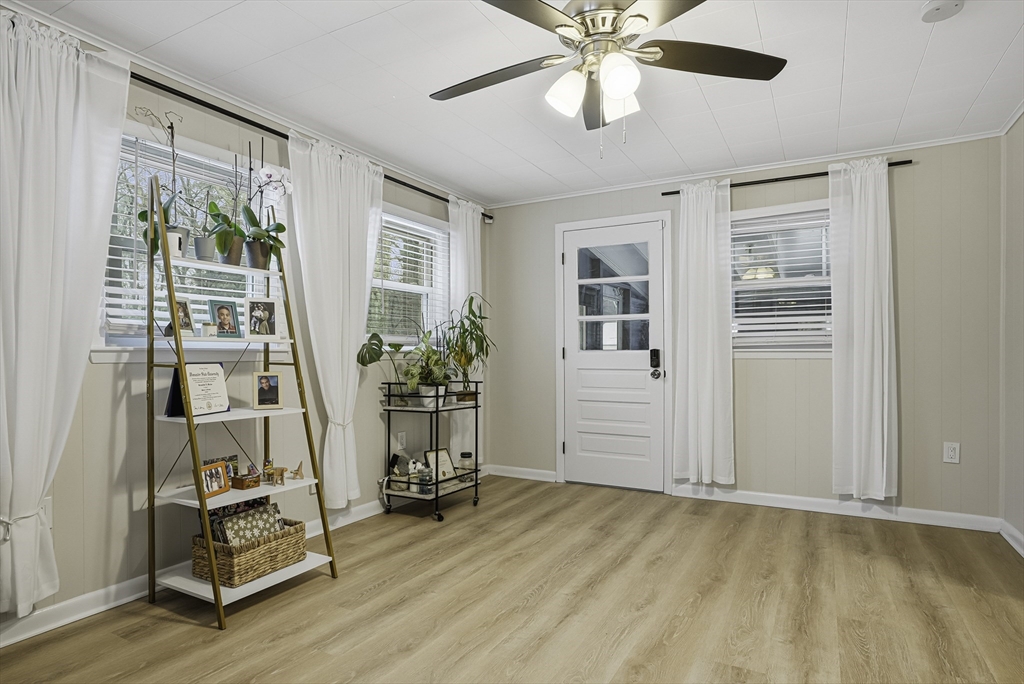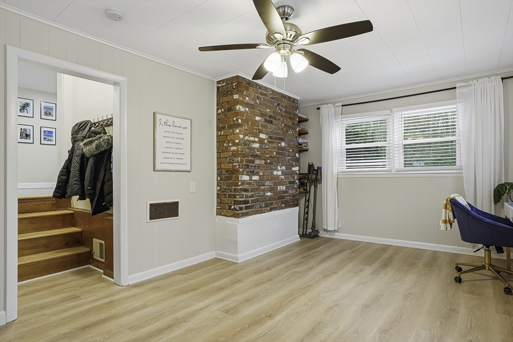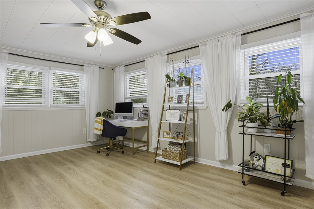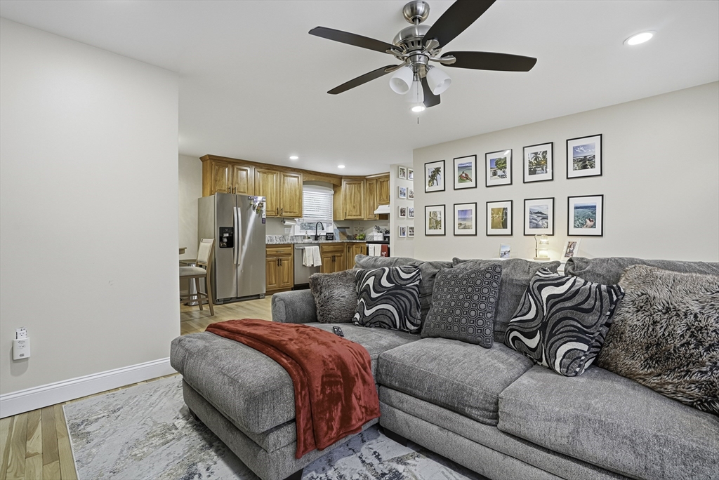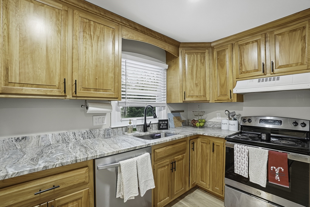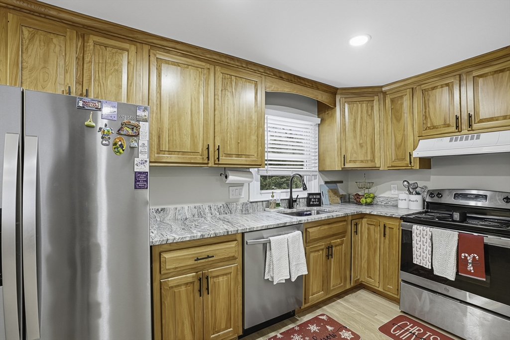 This lovely Ranch sits on a private, half-acre lot with two separate driveways. This is a very well maintained home. Features include a living room with fireplace ,hardwood floors throughout, newer kitchen cabinets with granite countertops, and stainless steel appliances .There is additional space next to the kitchen that can be use as a formal dinning room or office. Spacious basement with lots of potential to expand ,workshop area and laundry area, A screened-in porch offers views to a private outdoor retreat. The home features modern amenities like architectural shingles, energy-efficient windows, and central air conditioning, along with a new tub (2017), new driveway (2021), exterior paint (2024), and a new AC system (2020).Very easy access to major Highway ,very close to Commuter rail ,shopping area and restaurants.