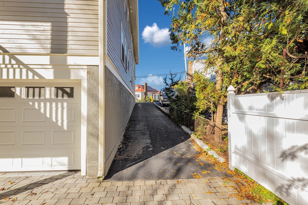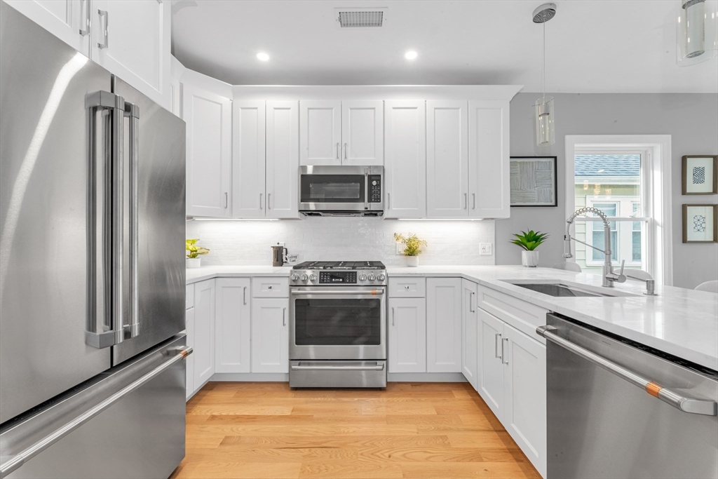 Bright, beautifully renovated, and truly spacious—this move-in-ready Roslindale condo lives like a home. Three generous bedrooms PLUS a sunlit front office with porch access deliver real flexibility for WFH, guests, gym, or playroom. A private primary suite features great closets and an en-suite bath with a sleek shower. The open-concept kitchen is the centerpiece with GE Café appliances, chef-style gas range, and a breakfast bar that seats four—perfect for entertaining. Hardwood floors, updated systems, and high-efficiency heating & cooling bring modern comfort with low-maintenance ease. In-unit laundry, garage parking + an additional outdoor spot, and shared common outdoor space. Plenty of storage with pull-down attic storage plus dedicated basement storage.