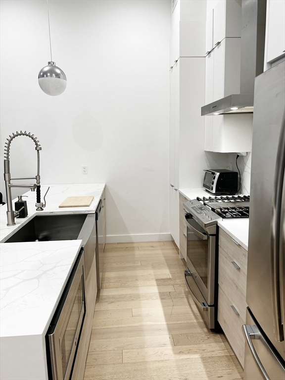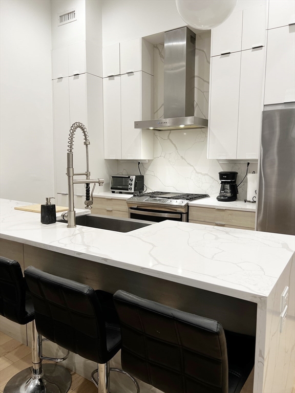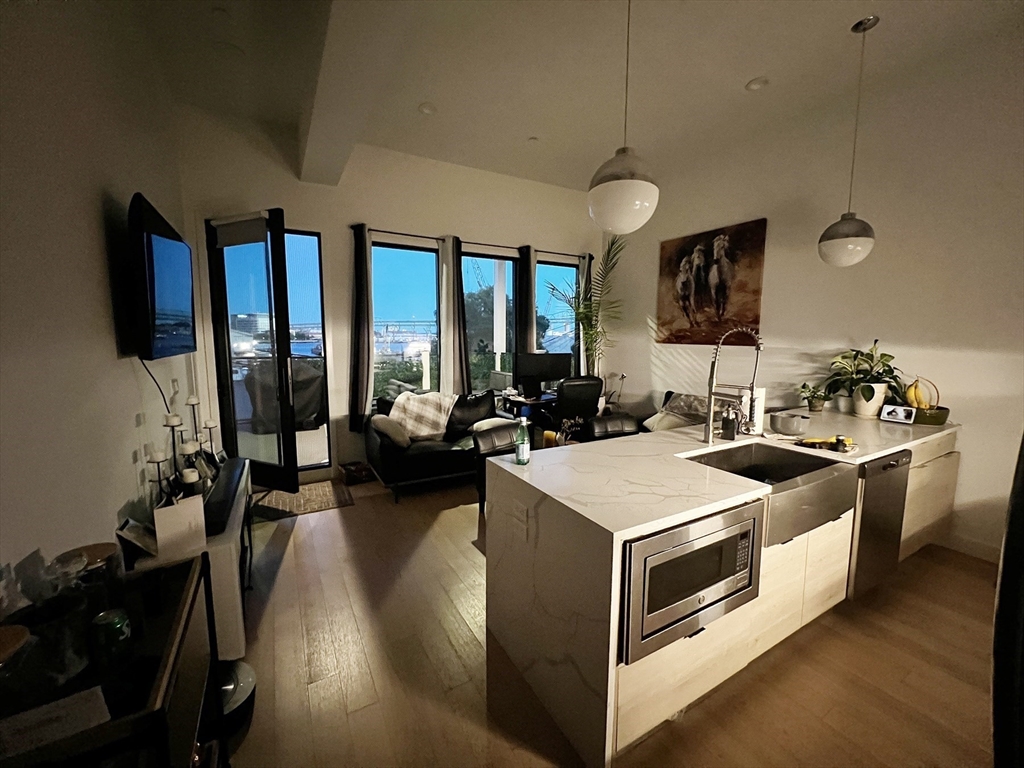 AVAILABLE FEB/MARCH: Ready for gorgeous sunset views? This 1BR/1BA at The Victoria, a boutique East Boston is a gem! The sleek Euro-style kitchen features Quartz countertops and Samsung stainless steel appliances and opens into a bright living area anchored by an impressive 8-foot peninsula—perfect for cooking, hosting, and everyday living! 100SF private deck with Bunker Hill/Tobin views. The bedroom comfortably fits a king or queen bed and includes a generous sized closet, while the modern bath offers a shower w/ Vigo fixtures. Designed for ease and flow, the unit is right off lobby for seamless move-ins and grocery runs, and features soaring ceilings, central heat/AC, engineered hardwood floors, tankless hot water, and LED lighting throughout. Professionally managed and dog-friendly, the building sits on a bus route and is just 12 minutes to Airport and Maverick stations for an easy commute, with restaurants, gyms, and shopping close by. Requirements: 680+ credit, first / security.