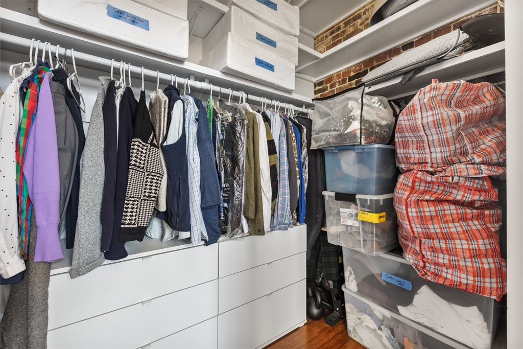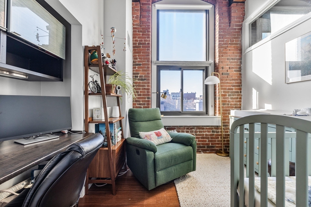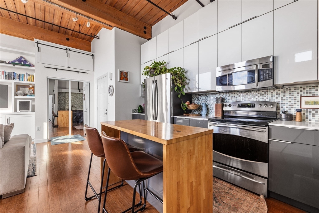 Available now! Dramatic brick and beam loft-style 2-bedroom, 1 bathroom condo with one covered parking space located in The Foundry on the Seaport/South Boston line. This smart and efficient condo boasts 12ft ceilings and 8ft windows and has undergone an architect-designed renovation, including a contemporary kitchen, updated bathroom, bamboo hardwood flooring, designer lighting, and more! The open concept kitchen/living room features custom built-in shelving, stylish cabinets, a butcher block island, exposed brick, and lofted storage. The spacious primary bedroom features an enormous walk-in closet and an abundance of natural light. The second bedroom features a built-in desk w/storage perfect for an office, guest room, or flex space! The Foundry is a professionally managed elevator building with common laundry facilities and bike storage. Super location, only steps to the Seaport, 0.6mi to Broadway T (Red Line), and easy access to highways & airport.