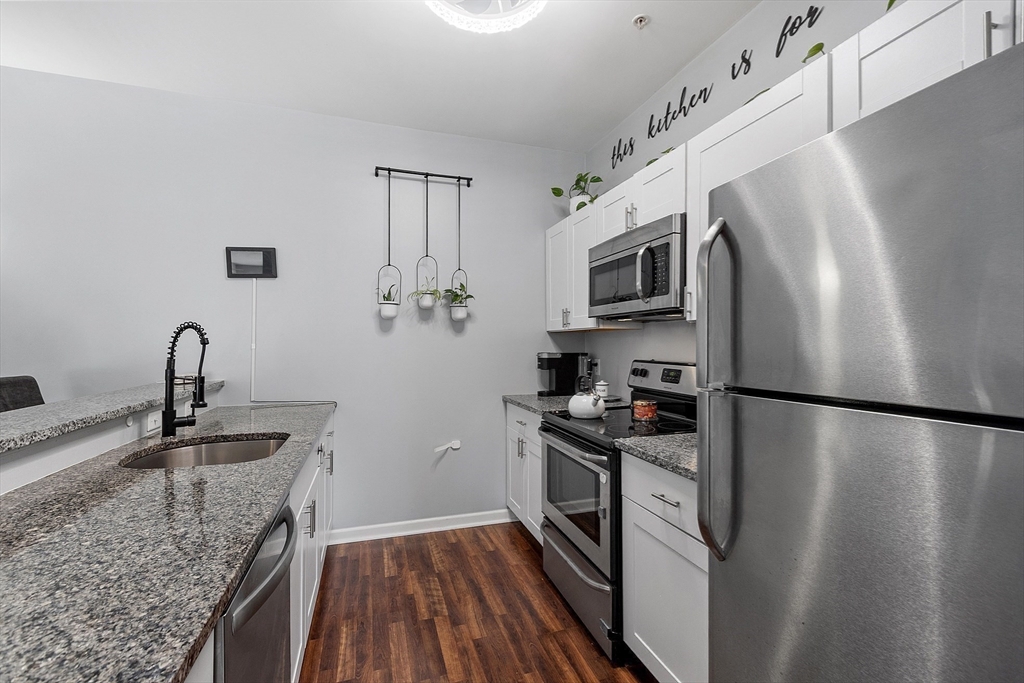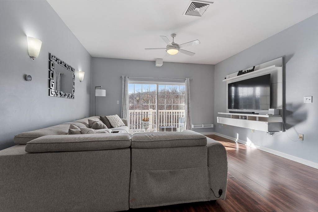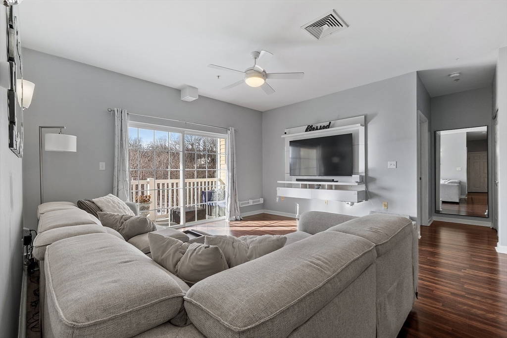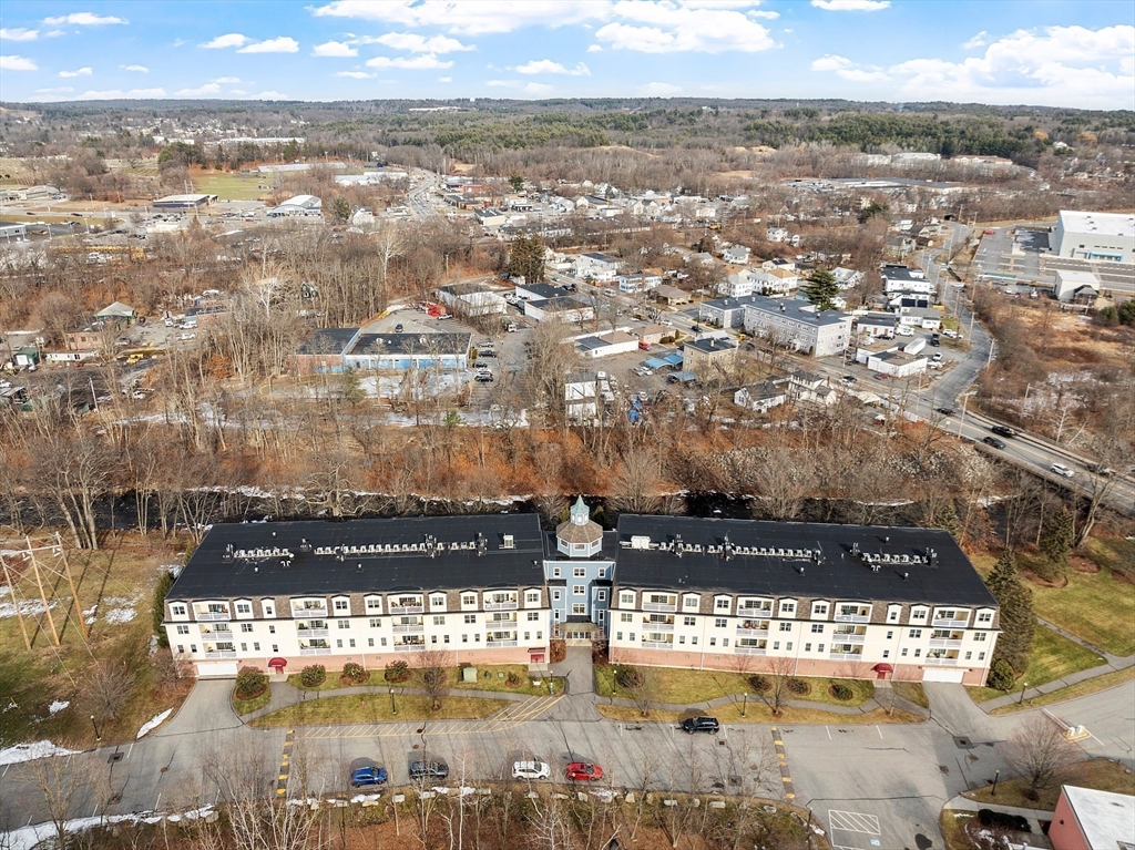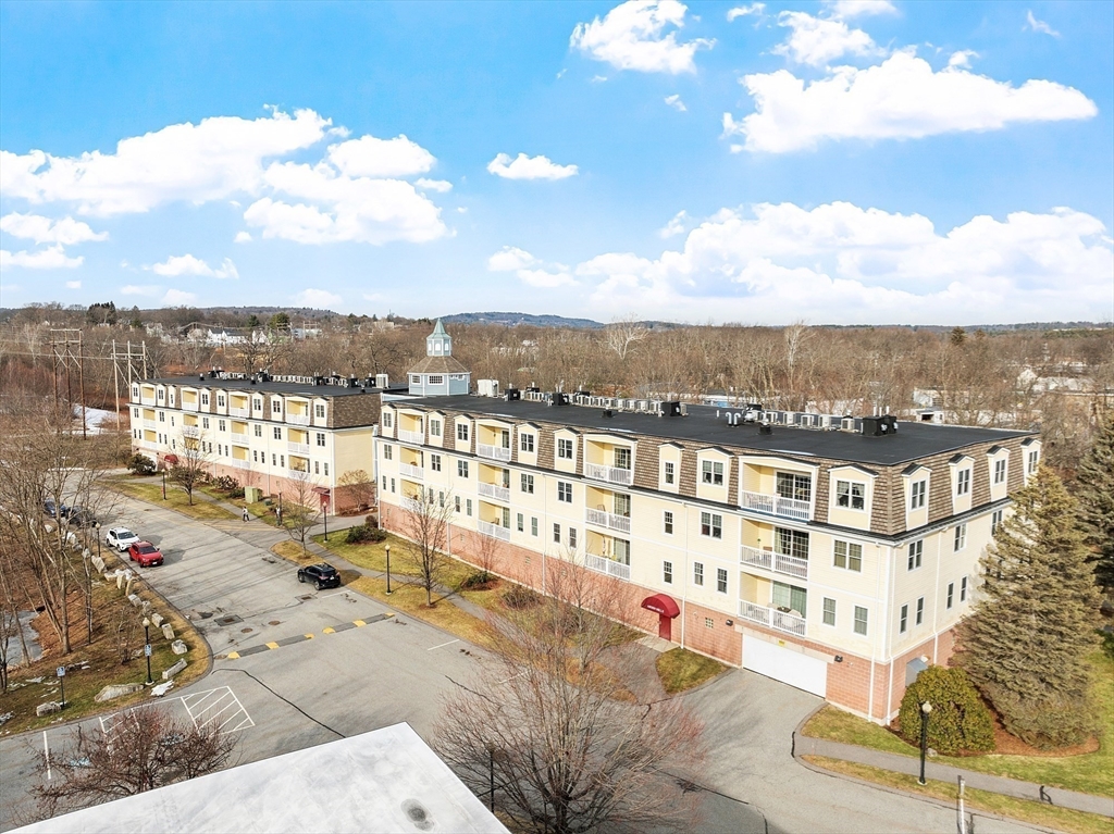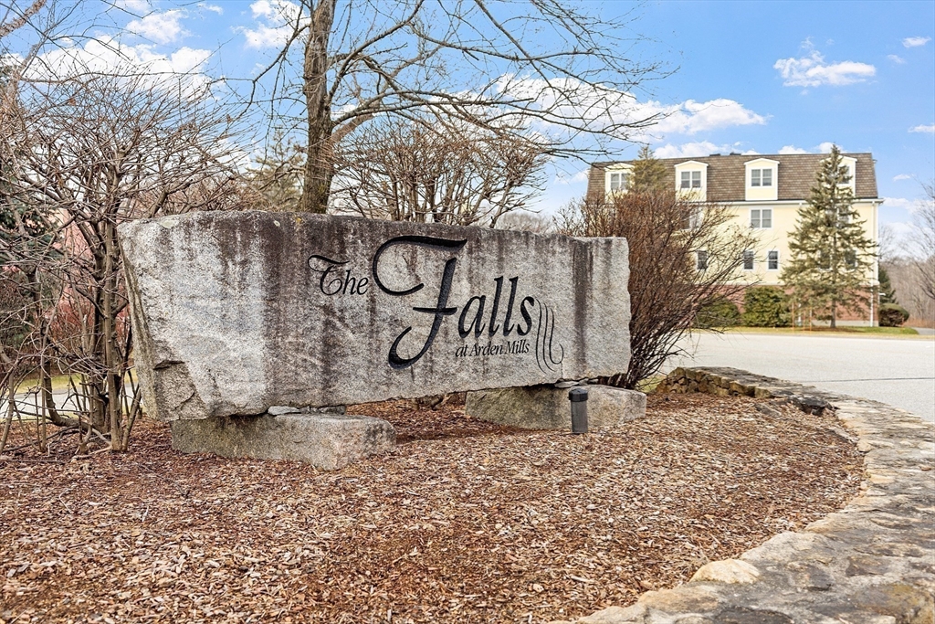 Welcome to the Falls at Arden Mills. Affordable luxury in a gated community. Airy & comfy one level living 2 bdrm, 2 bath condominium. Top floor w in-unit laundry. Beautifully spacious vibe - open concept + tall, 9' ceilings. Breakfast bar, open galley kitchen w granite countertops & lovely white cabinetry overlooking the dining room, providing nice space for entertaining. From your warm, natural light filled living room slide open the backdoor to enjoy your morning coffee or evening beverage on your private, covered balcony. Primary bdrm suite features a 3/4 bath with walk in shower and a closet/storage corridor. Full main bath w granite counters and new fixtures. 2nd bedroom across from main bathroom with wall-to-wall carpeting and large closet. New Hot Water Heater. Monitored, heated garage-deeded parking space and more storage! Secured entry, elevator access all floors. Common patio, paths to scenic Nashua River, waterfall + Rail Trail. Close to highway, purple line & shopping
