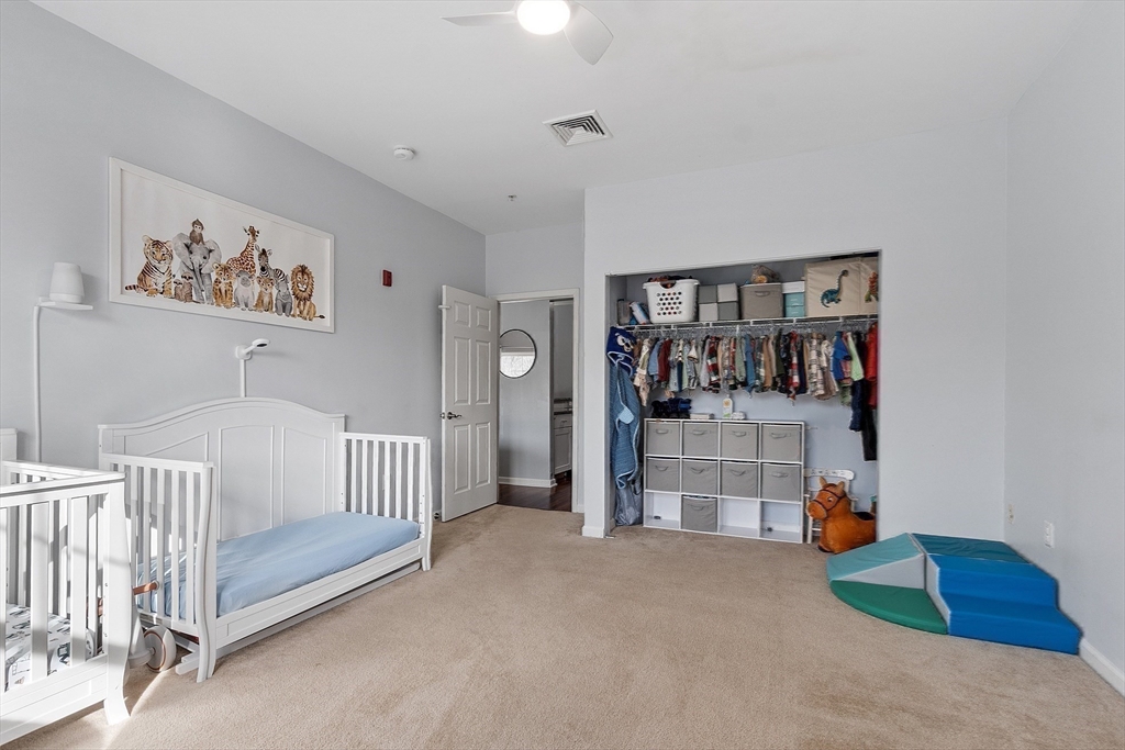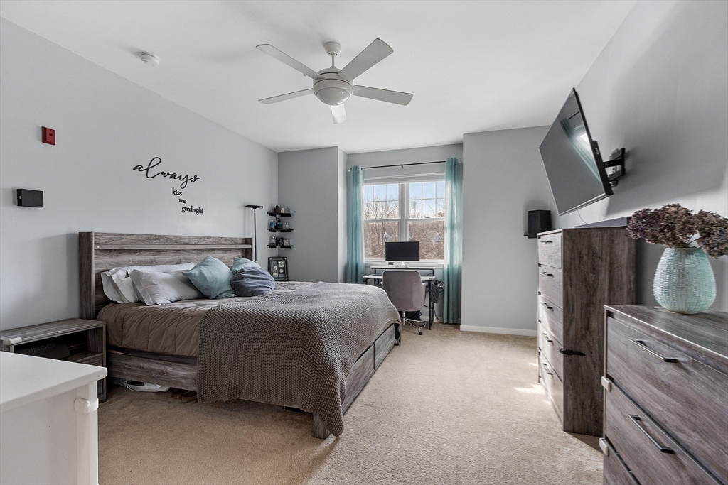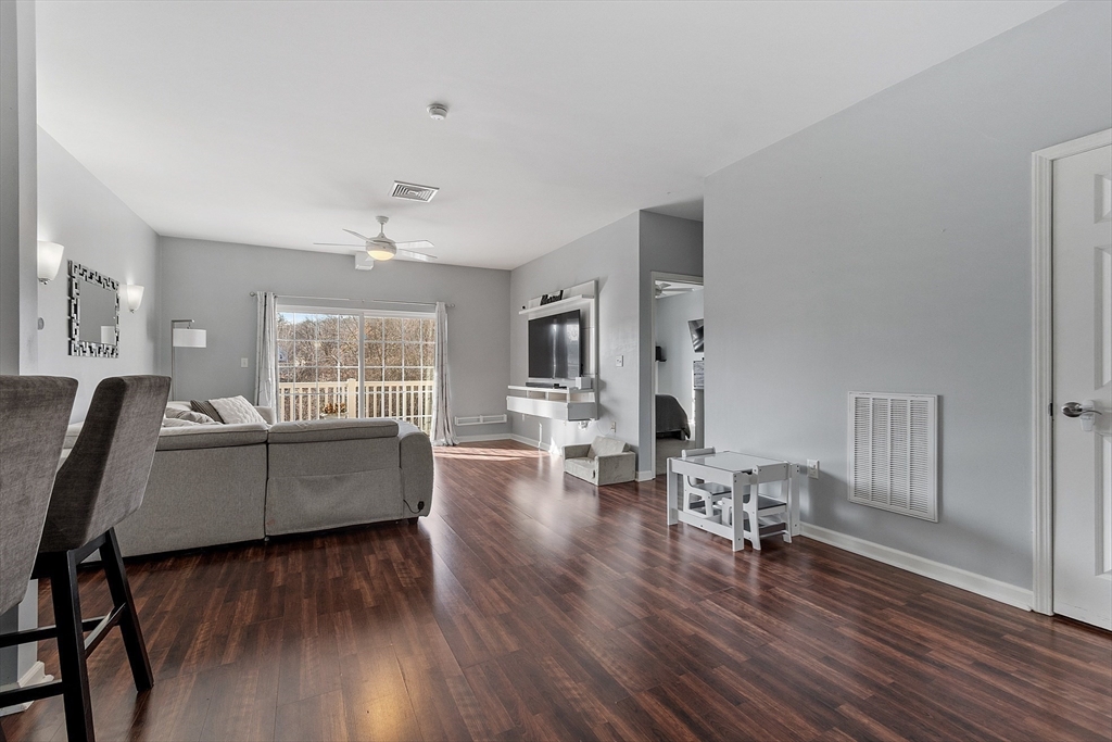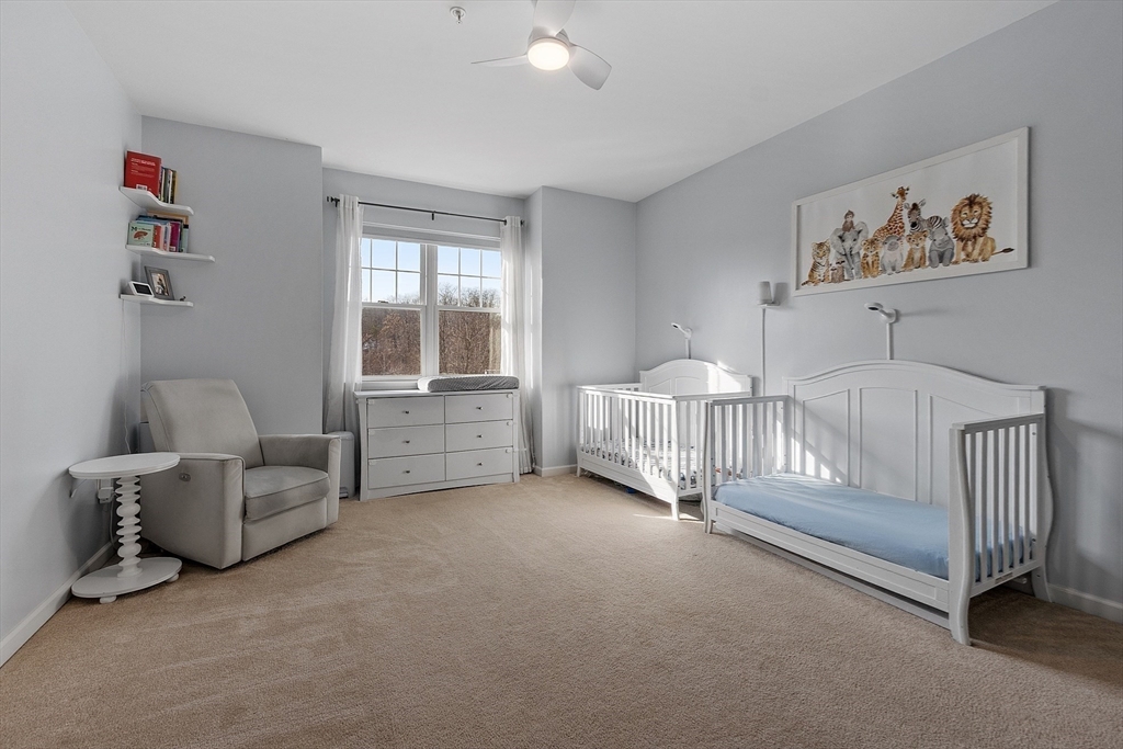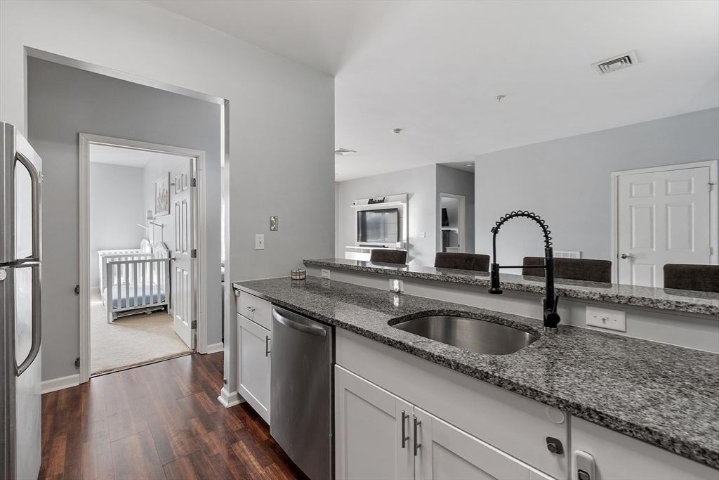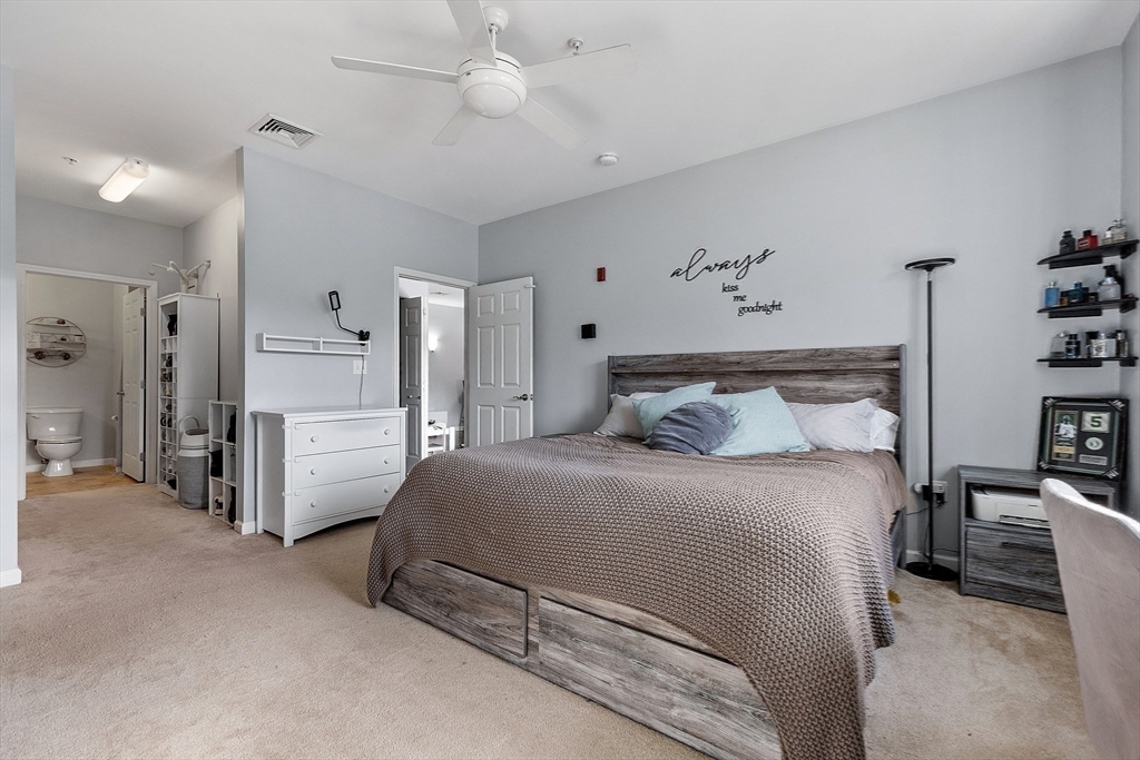 Welcome to the Falls at Arden Mills. Affordable luxury in a gated community. Airy & comfy one level living 2 bdrm, 2 bath condominium. Top floor w in-unit laundry. Beautifully spacious vibe - open concept + tall, 9' ceilings. Breakfast bar, open galley kitchen w granite countertops & lovely white cabinetry overlooking the dining room, providing nice space for entertaining. From your warm, natural light filled living room slide open the backdoor to enjoy your morning coffee or evening beverage on your private, covered balcony. Primary bdrm suite features a 3/4 bath with walk in shower and a closet/storage corridor. Full main bath w granite counters and new fixtures. 2nd bedroom across from main bathroom with wall-to-wall carpeting and large closet. New Hot Water Heater. Monitored, heated garage-deeded parking space and more storage! Secured entry, elevator access all floors. Common patio, paths to scenic Nashua River, waterfall + Rail Trail. Close to highway, purple line & shopping