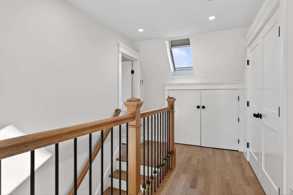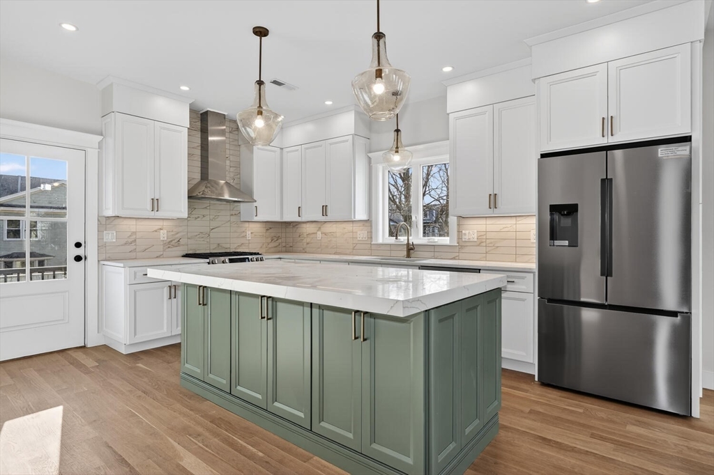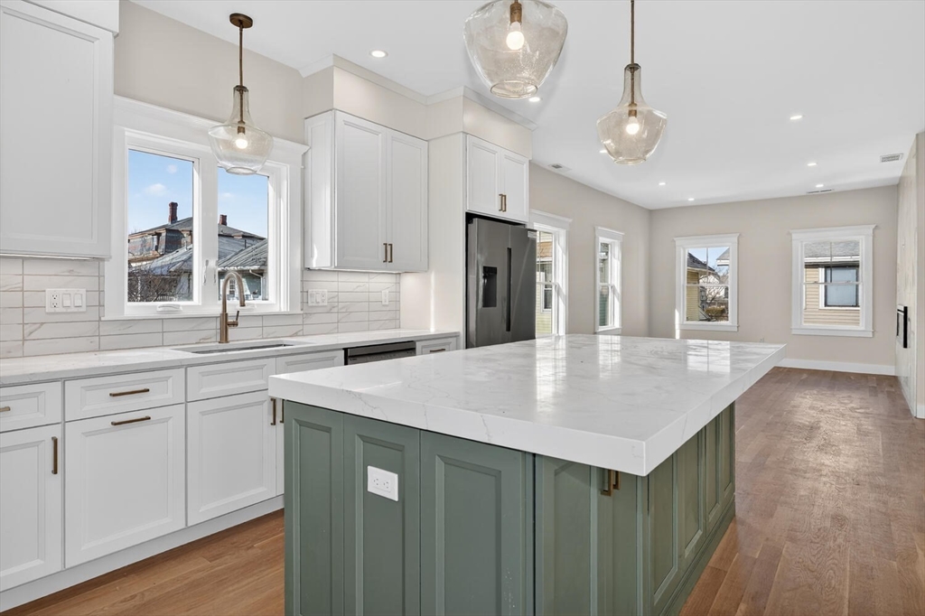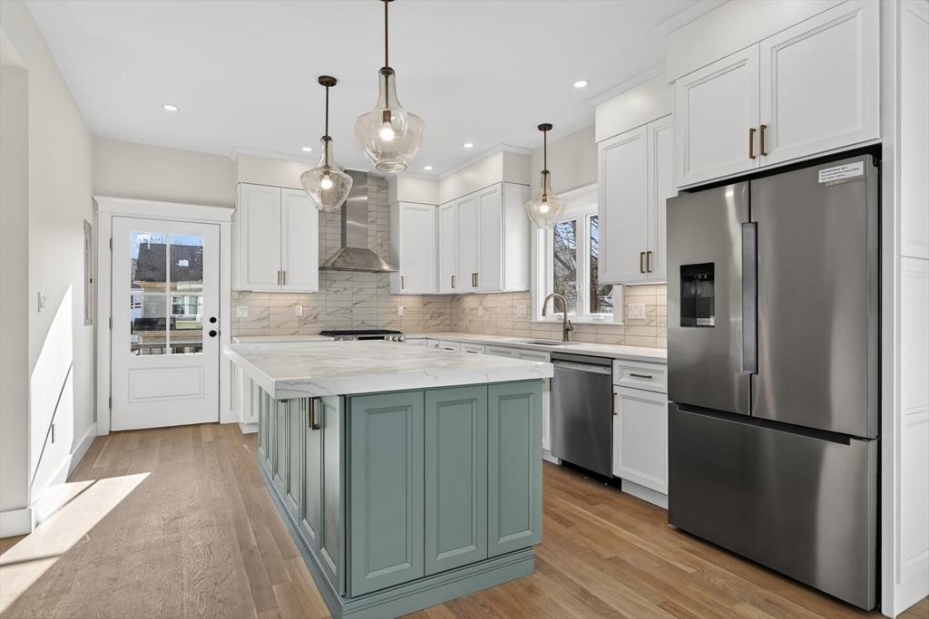 Luxurious, gut renovated two-family condominium located on a small terrace. This unit offers a modern layout with flexible living spaces. The second floor features a beautiful primary suite with large closet and a beautiful tiled bath with walk-in shower, sunlit living room with an electric fireplace, seamlessly integrated dining area and kitchen, creating a warm and open atmosphere. The spacious kitchen offers an impressive amount of cabinetry for storage and organization, beautiful countertops along with a large island that enhances interaction and functionality. The third floor includes two bright bedrooms, both with large closets, as well as a full bath and a laundry area. This is an excellent use of space, perfect for those seeking a modern home combined with old world charm in a convenient location. Ideally located with easy access to the Mass Pike (I-90), close to the Charles River and its scenic trails, as well as public transp. (Express bus to Boston!) and shopping.