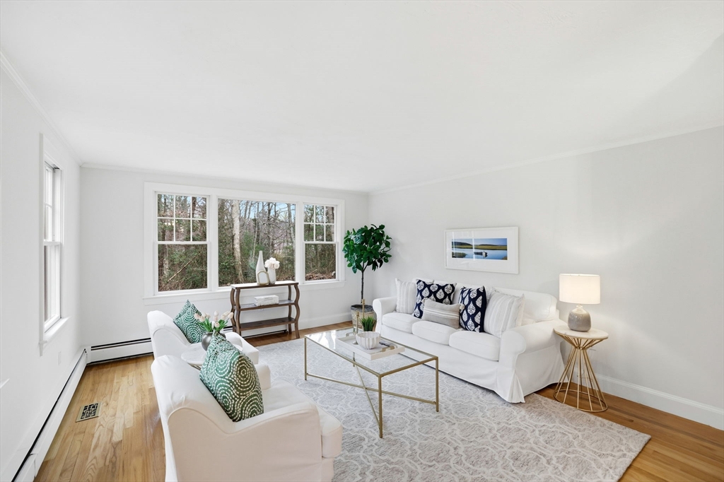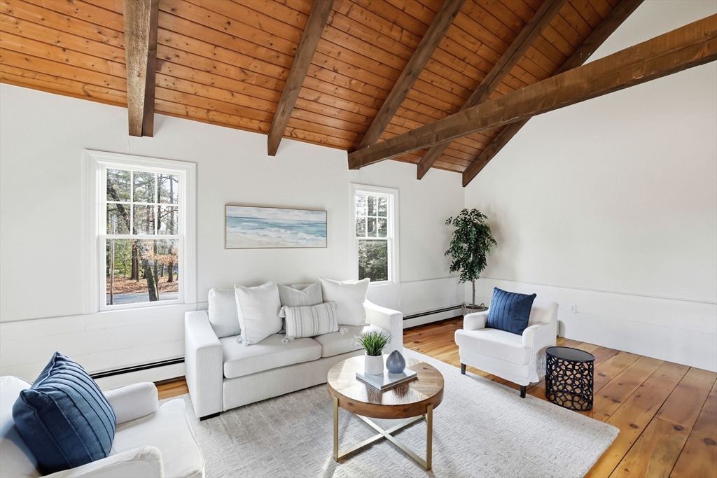 Cherished by the same family for 22 years, this updated and move-in ready Cohasset colonial is set back on a private, wooded 3/4-acre lot just one mile from the beach. Thoughtfully maintained and improved over time, the home offers peace of mind and an easy transition for its next owners. Recent improvements include a new roof, new maintenance-free HardiePlank siding, a new maintenance-free composite deck, and new C/A units, along with newer Andersen windows and exterior doors, newer appliances, a newer drilled well, water softener, and water purification system. Offering approx. 3100sf of living space, including a finished lower level with office and gym, the home features an oversized great room with a newer wood-burning fireplace insert, soaring beamed cathedral ceilings, wide pine floors & custom built-ins. A sunroom with skylights, cathedral beamed ceilings, and three Andersen sliders opens to a large kitchen and deck overlooking a private backyard surrounded by mature trees-ideal