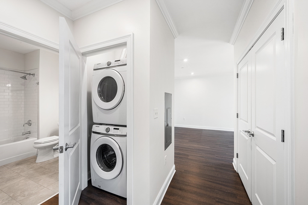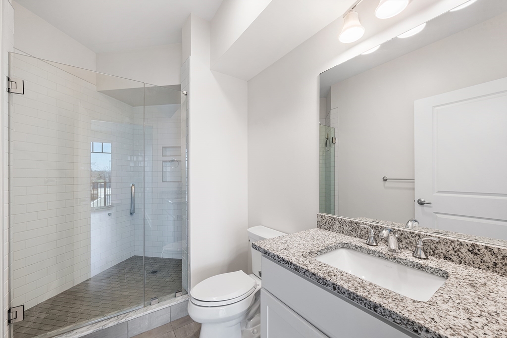 Welcome to The Foundry! This stunning 2bedroom, 2bath residence offers over 1,000 sq ft of single-level living & has been meticulously maintained. Conveniently located just off the elevator, this home combines high-end finishes, thoughtful design, & everyday convenience. The designer kitchen features granite countertops, ss appliances, custom cabinetry, & a breakfast bar, opening to a bright, open-concept living & dining area ideal for entertaining or relaxing. Enjoy a private balcony that creates a seamless indoor-outdoor connection. The spacious primary suite includes its own private balcony & a beautifully finished en-suite bath, while the versatile 2nd bedroom is perfect for guests or a home office. Additional highlights include in-unit laundry, central A/C & heat, 2 parking spaces, including a spot in the heated garage. Residents enjoy a landscaped outdoor terrace with grills & a community room for work/gatherings.Close to the commuter rail, this exceptional home truly has it all!