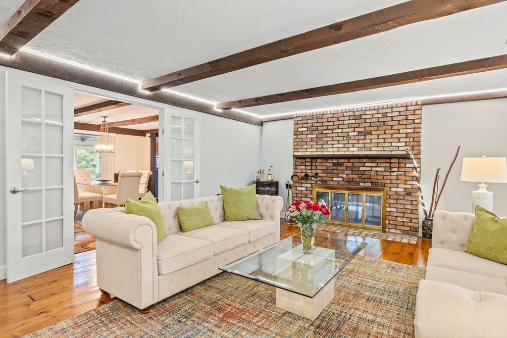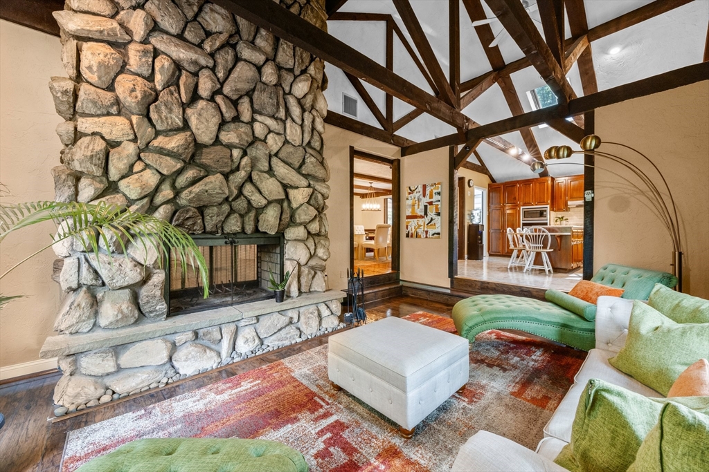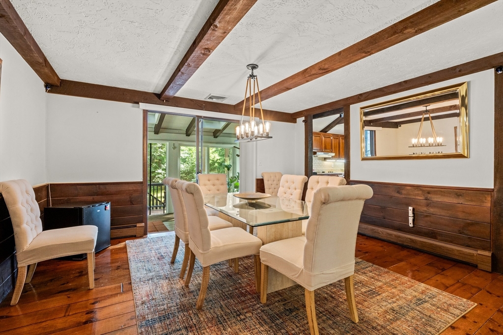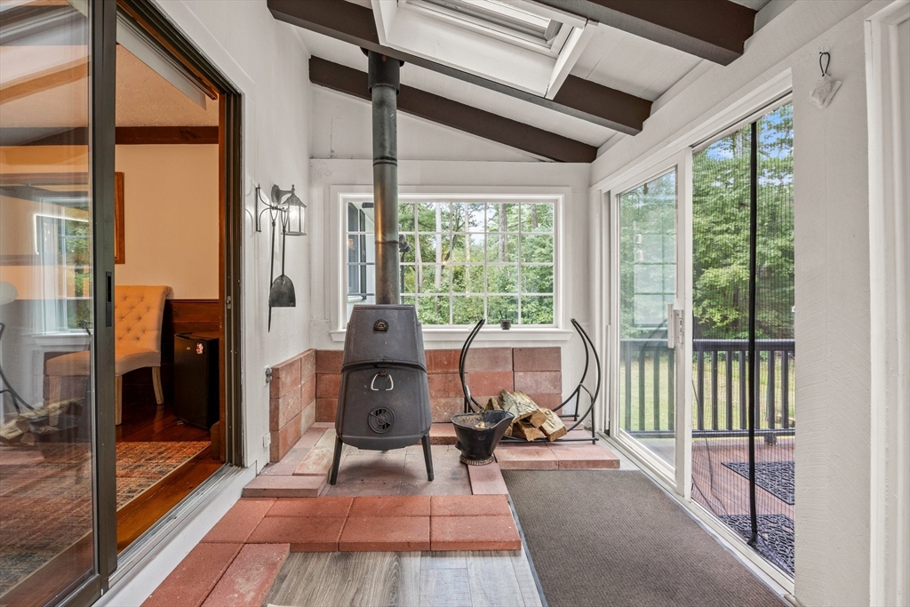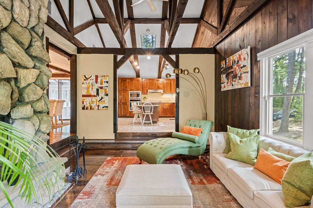Just 2 minutes from Rt 44, this renovated home surprises at every turn, offering space, privacy, and flexibility on a wooded 1.4-acre corner lot with 2 separate driveways. Step inside to discover a sunken family room featuring wide pine floors, cathedral ceilings, and a stunning stone fireplace. The bright living room adds warmth and character with exposed beams, a brick fireplace, and French doors. The kitchen shines with stainless steel appliances, granite countertops, abundant cabinetry, and an oversized two-level island with ample seating. The dining area flows seamlessly to a three-season room and deck overlooking a fenced portion of the backyard. The main level includes three generously sized bedrooms with spacious closets and two full baths. A spiral staircase leads to the fully finished, walk-out lower level offering exceptional versatility, including a large great room, bonus room, full bath with sauna, laundry room, utility space, and direct access to the oversized garage.