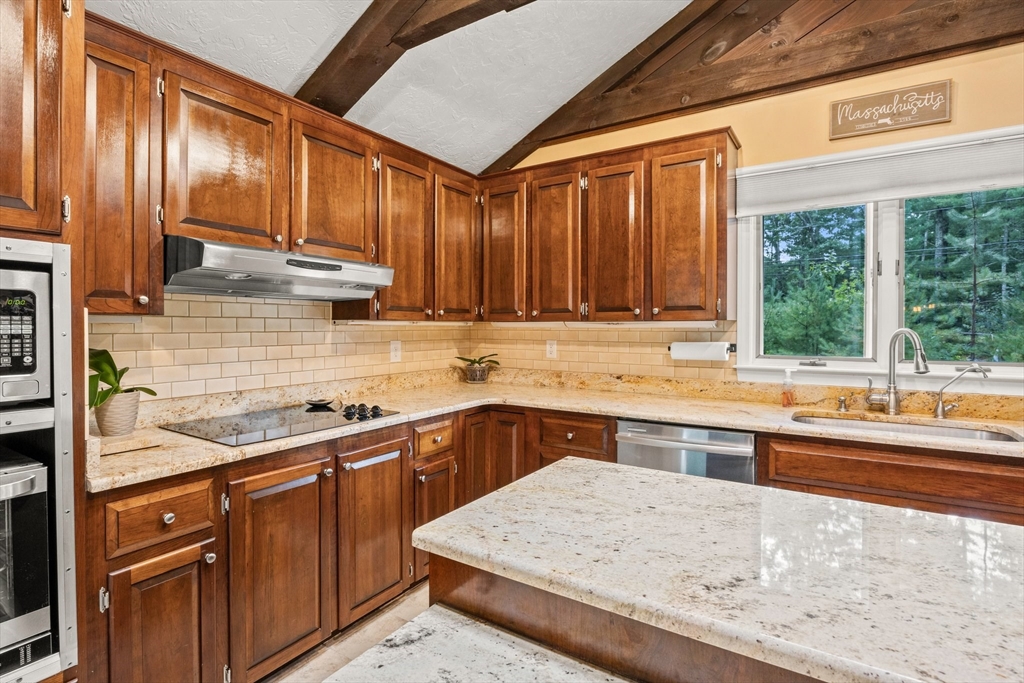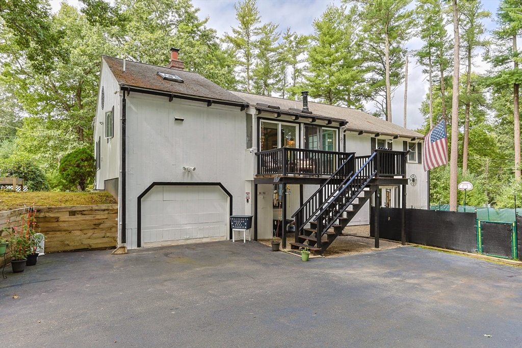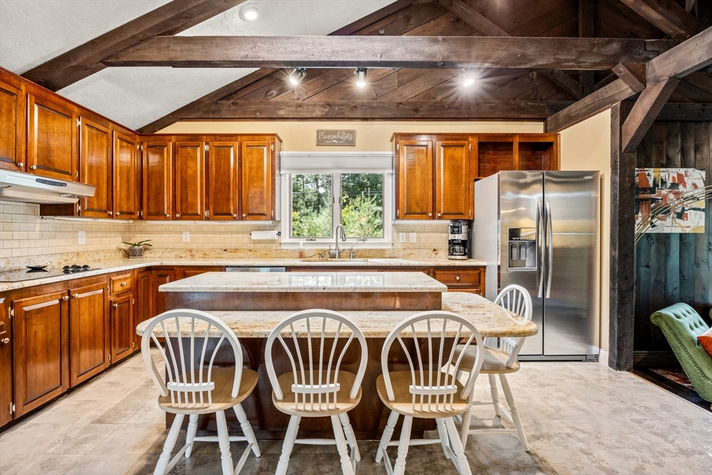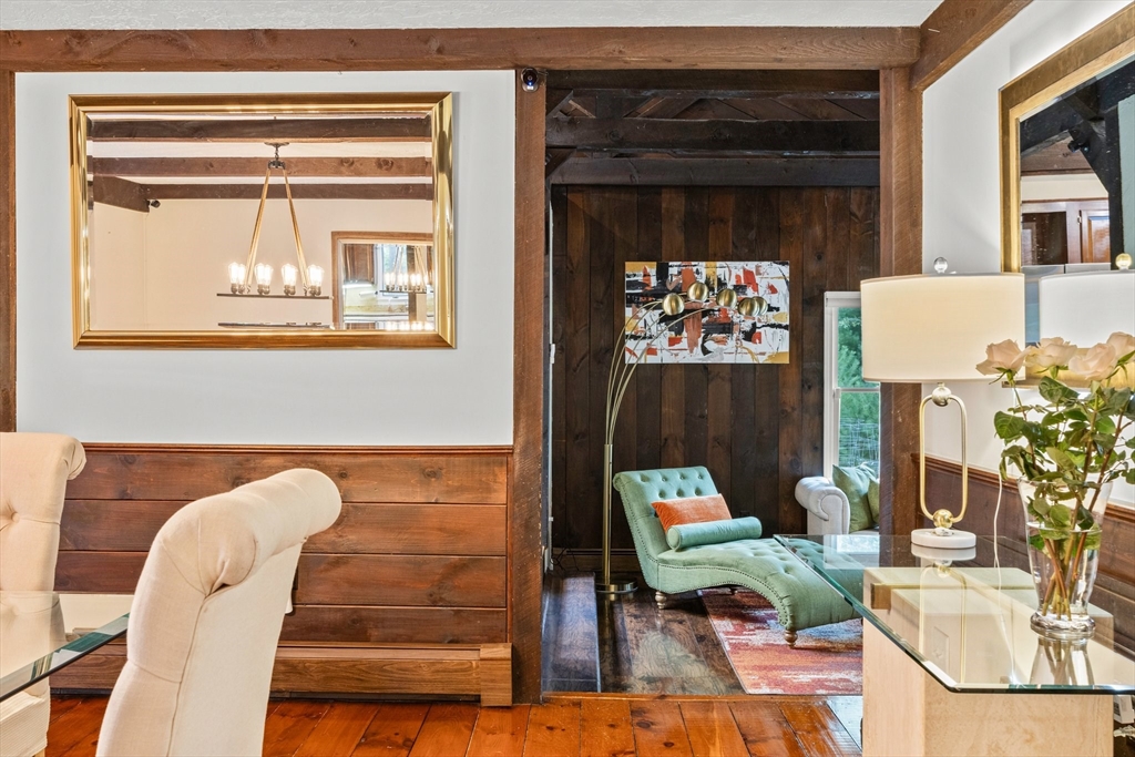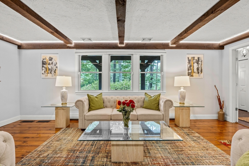 Just 2 minutes from Rt 44, this renovated home surprises at every turn, offering space, privacy, and flexibility on a wooded 1.4-acre corner lot with 2 separate driveways. Step inside to discover a sunken family room featuring wide pine floors, cathedral ceilings, and a stunning stone fireplace. The bright living room adds warmth and character with exposed beams, a brick fireplace, and French doors. The kitchen shines with stainless steel appliances, granite countertops, abundant cabinetry, and an oversized two-level island with ample seating. The dining area flows seamlessly to a three-season room and deck overlooking a fenced portion of the backyard. The main level includes three generously sized bedrooms with spacious closets and two full baths. A spiral staircase leads to the fully finished, walk-out lower level offering exceptional versatility, including a large great room, bonus room, full bath with sauna, laundry room, utility space, and direct access to the oversized garage.