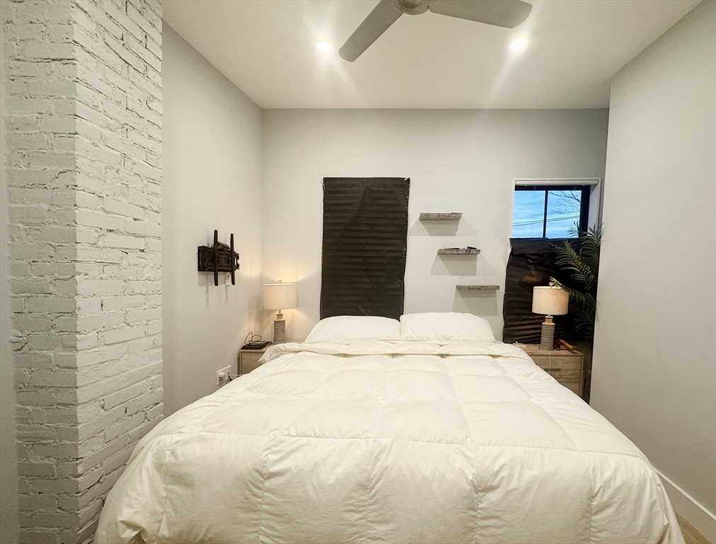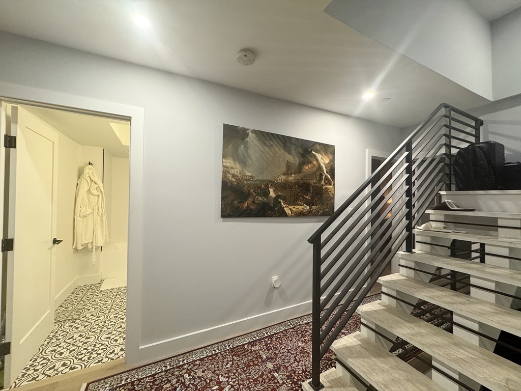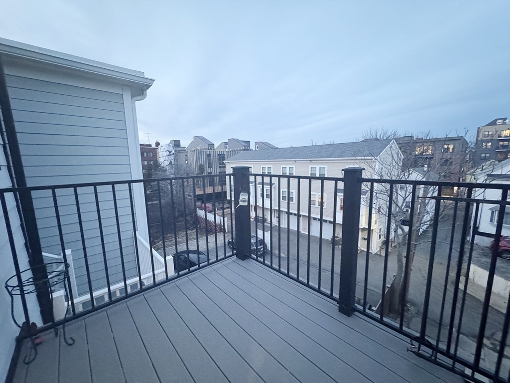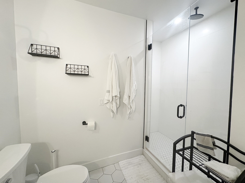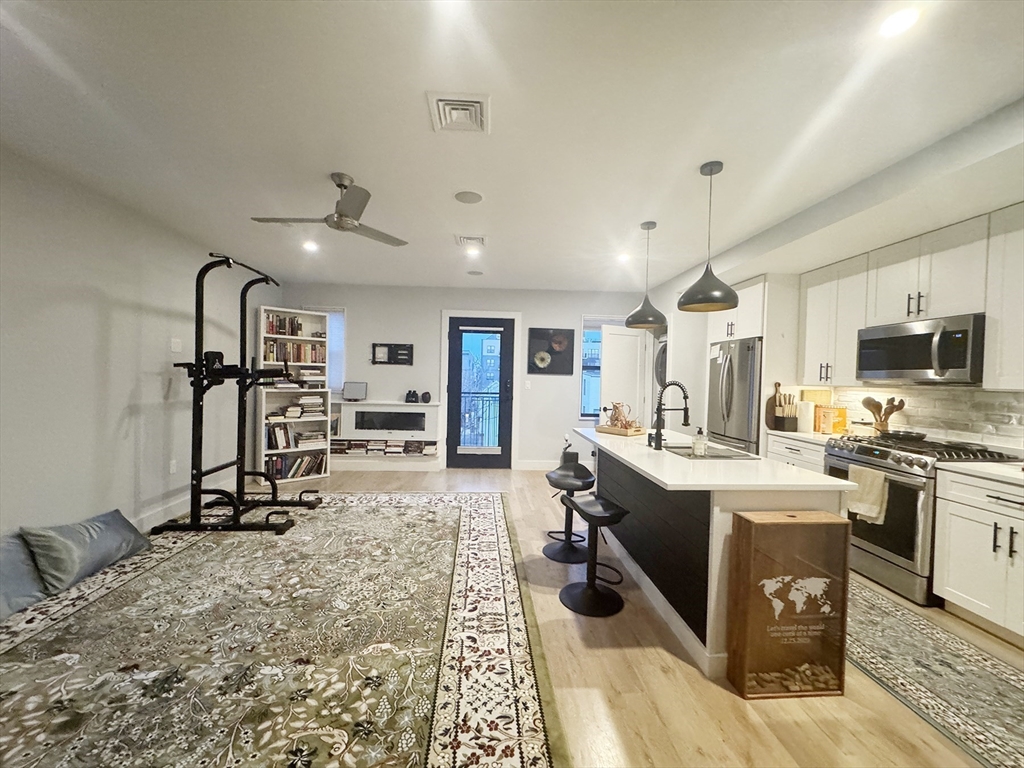 APRIL 1: Penthouse-level 2-bedroom, 2-bath condo in the heart of Jeffries Point, East Boston—truly a unicorn offering with TWO parking spaces, a private roof deck with 360-degree views, a gas-equipped kitchen deck, and deeded storage. The open floor plan is anchored by a custom metal staircase leading to the roof, creating a distinctive single-family feel. The kitchen features a large island, quartz countertops, stainless steel appliances including a wine fridge, and opens seamlessly to the living and dining area with a gas fireplace. The primary suite fits a king bed and showcases exposed brick column detailing, a custom closet system, and ensuite walk-in shower. The second bedroom offers generous closet space. Smart home technology, hardwood floors, and central heat/AC throughout. Just two blocks to the T, Tall Ship, and an array of vibrant restaurants, parks, and waterfront amenities.