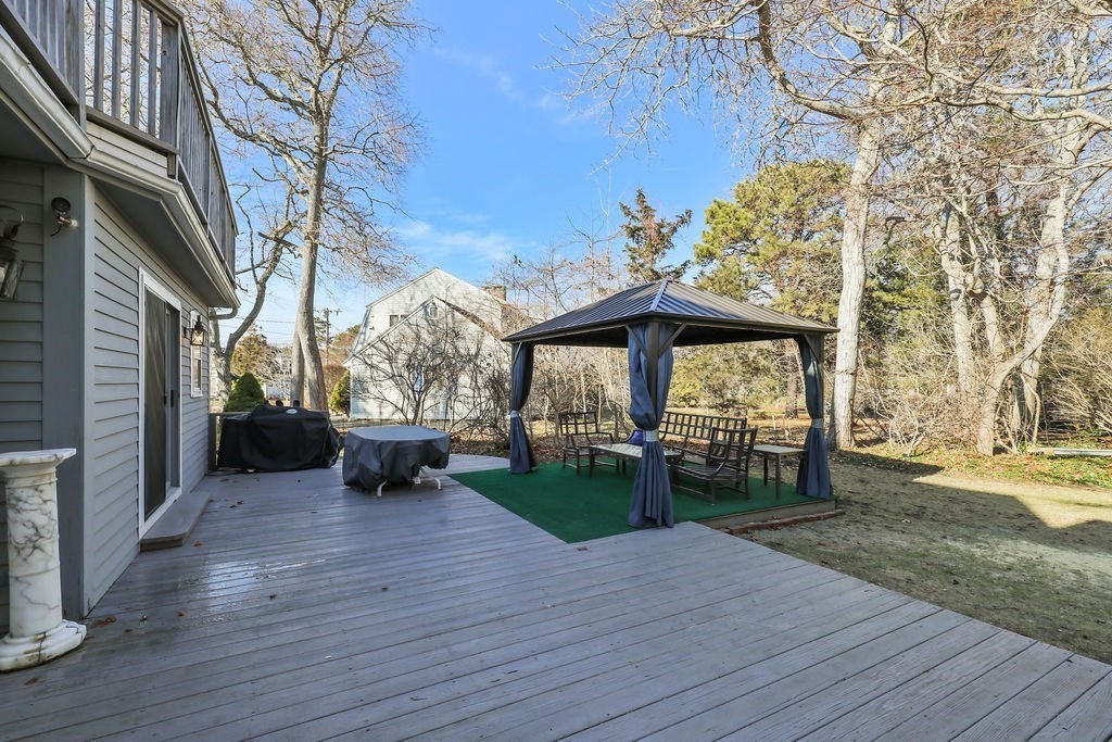 This cherished seaside home is on the market for the first time, offering a rare opportunity for its next owners. Experience waterside living in this charming mid-century modern Colonial, which seamlessly blends classic architecture with modern coastal comfort. The residence features 2,560 square feet of immaculate living space, including four bedrooms and 2.5 bathrooms. The first floor offers a versatile layout with a living room, dining room, kitchen, den, and library. Upstairs, you will find four bedrooms, including a primary suite with a private full bath and direct access to a spacious upper deck. A large second-floor family room provides additional living space with convenient stairs leading down to the den. Notable features include hardwood floors throughout most rooms and an attached two-car garage. Situated on a half-acre lot with mature landscaping, the outdoor space is ideal for entertaining, featuring a large deck and a gazebo. Your next summer adventures begin here!