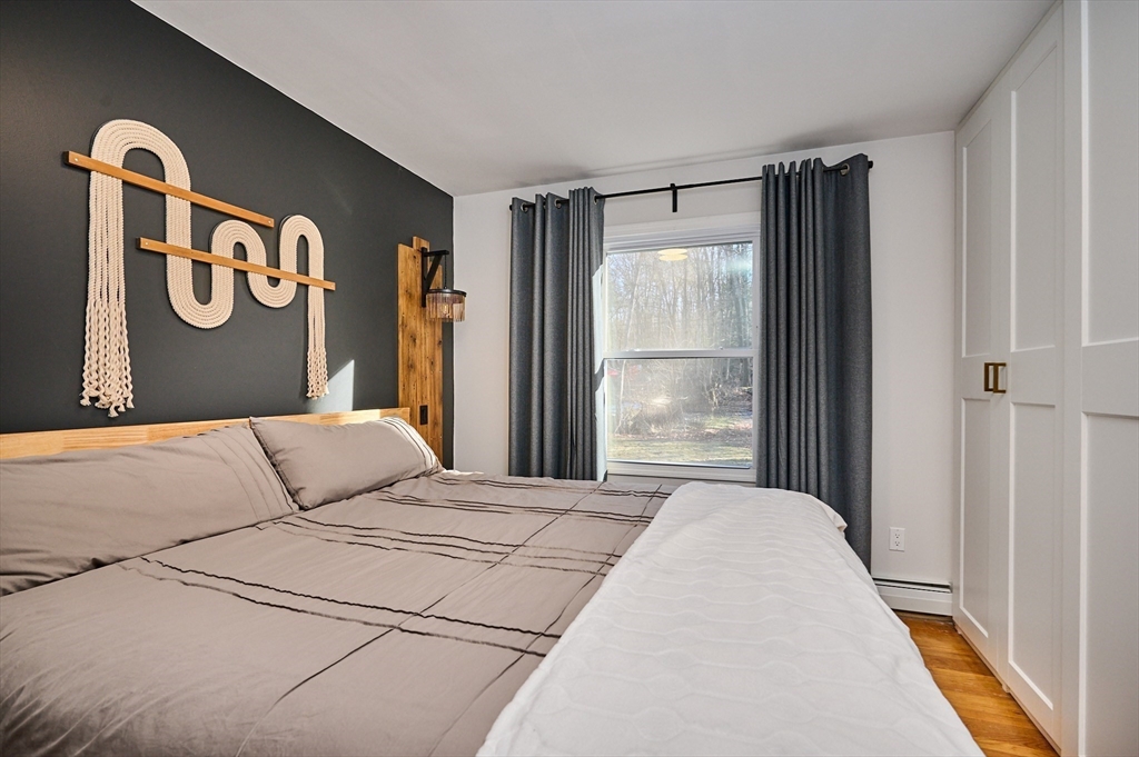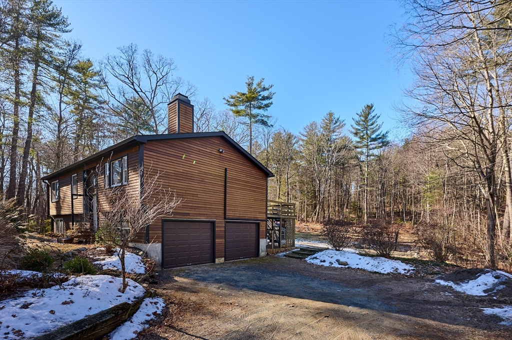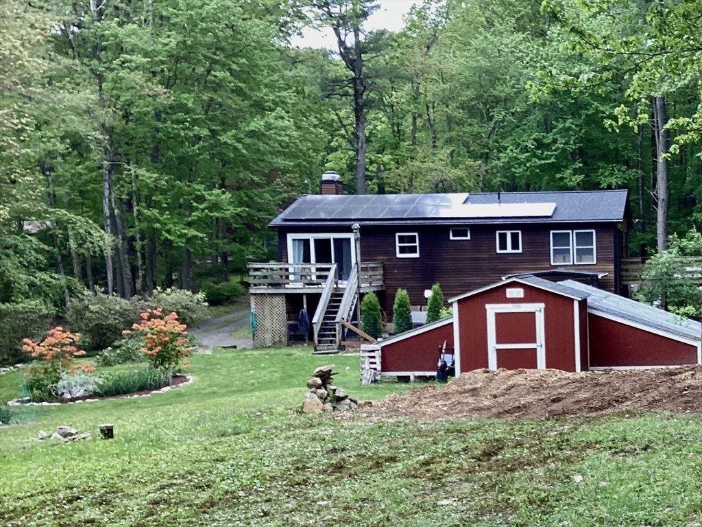 Buyer Dream Realized! Seller transformed 1986 3 bed, 2 bath Split-Level w/ 2 car garage into a Modern Contemporary. Owned solar panels + mini splits eliminated electric bills! Enjoy a peaceful country setting on 3.5A lot with trail access from back yard; close to Cadwell State Forest & Buffam Falls; just 10 min to Amherst & Five College academic hub. 2019-2025 extensive exterior work includes re-staining, new roof (+ facia, soffits & gutters); creation of ground-level deck & chicken run/enclosed berry garden; new garage doors & slider to lg deck. The interior redesign of every room of this 1669 SF house maximizes space utility & sleek, aesthetic appeal. Highlights include butcher block counter w/ marble backsplash, kitchen island w/ pendant lighting, built-in cabinetry on both levels, versatile closet systems, upgraded interior doors, oak & vinyl plank floors, Buderus HWBB + electric heat. Perk: Finished 1st level w new Family, Office, Gym & Laundry room. Opportunity knocks-Answer now!