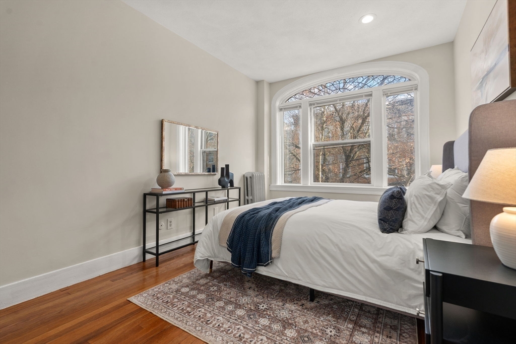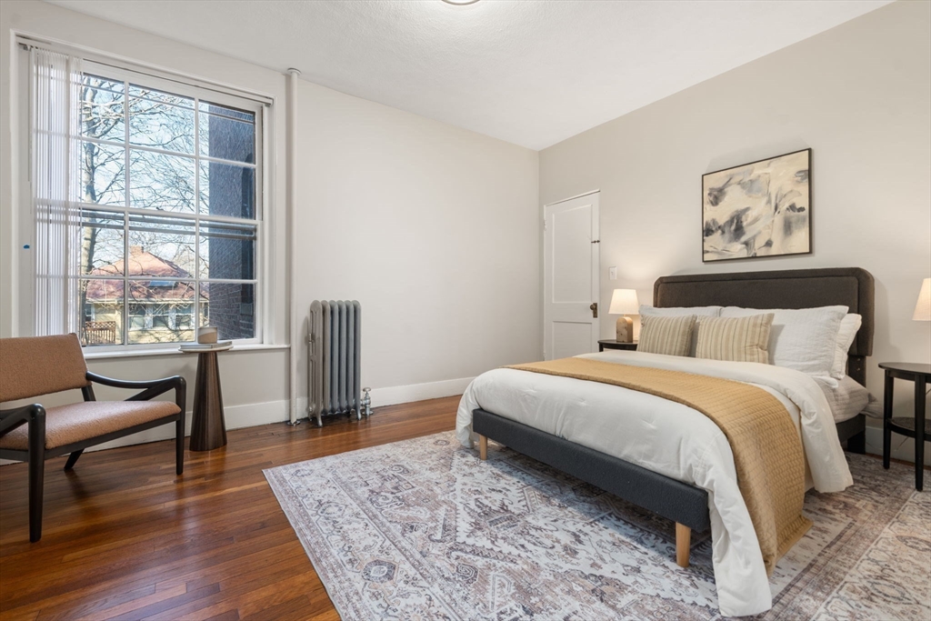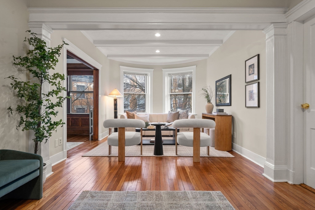 Coolidge Corner | Classic Brick Beauty with Sun-Filled Living. Timeless & elegant, this south-facing condo is in an ideal spot! Located on the 2nd floor this home offers 8RM, 4BR, & 2BA w/ 1,765 SF of beautifully maintained living space. A gracious foyer w/ a double closet, gleaming wood floors, & a striking high beamed ceiling sets the tone for a residence filled with light, warmth, and character. The inviting living room features a stunning bay window, while high ceilings lead seamlessly into a spectacular, entertainment-sized DR complete w/rich wood paneling, a fireplace, & a built-in cabinet. The remodeled cook’s kitchen is both stylish & functional, w/ stainless steel appliances, beautiful countertops, ample space for a table & breakfast bar seating. The primary BR boasts a renovated en-suite bath w/a large walk-in shower. Off the primary BR is a picturesque sunroom/office flooded w/ natural light. Coveted separate laundry room for side by side W/D. Why wait?!