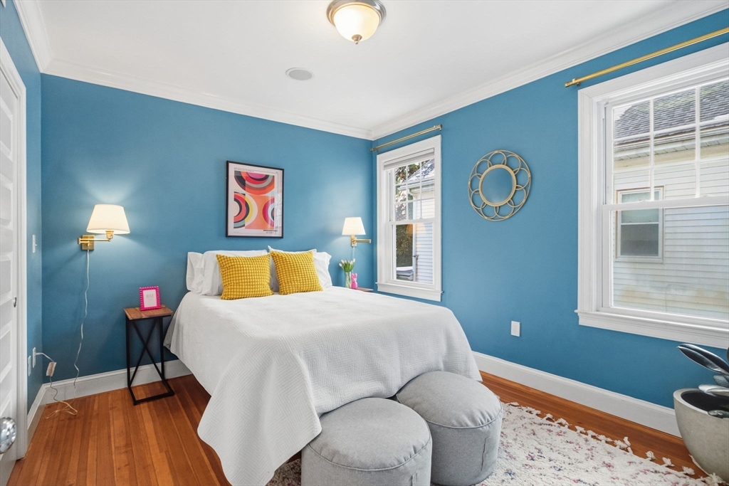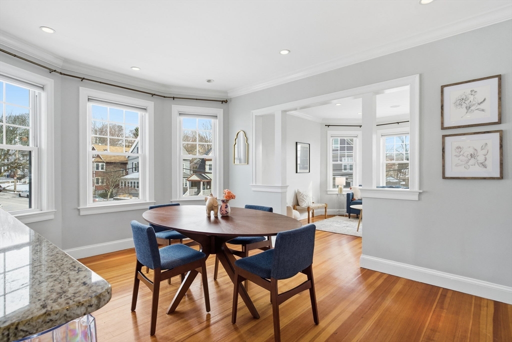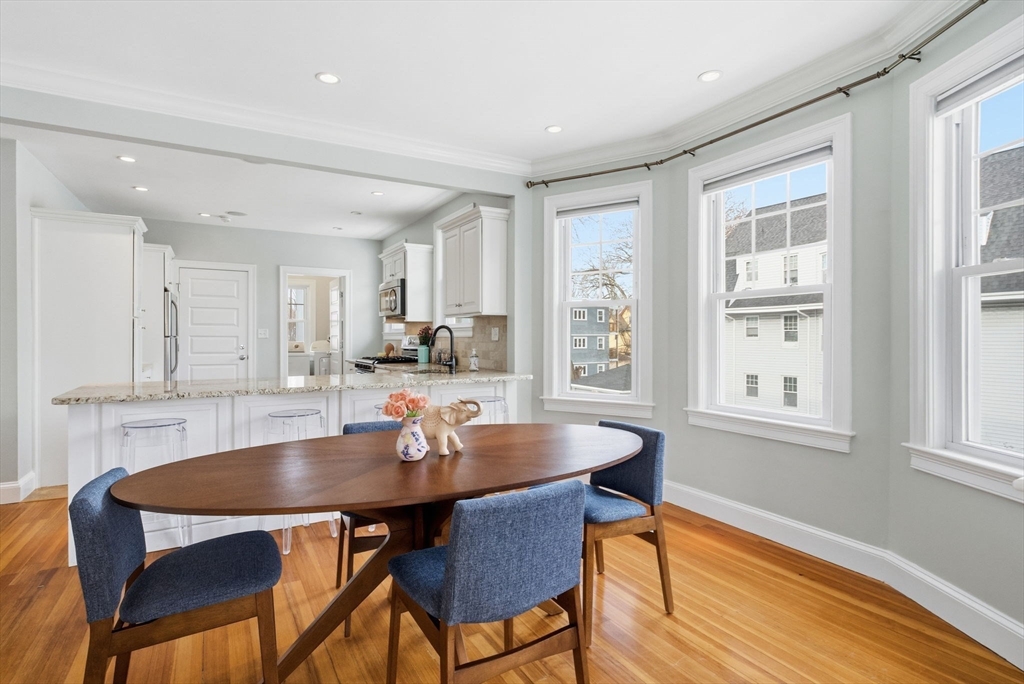 Welcome to 22 Walter St, a beautifully updated condo in the heart of Roslindale. Nestled within a gambrel-roofed triplex, this charming property offers a tasteful blend of modern updates and timeless charm. With 951 square feet of thoughtfully designed living space, this home has 2 bedrooms, 1 renovated bathroom, and a total of 5 light-filled rooms. The open kitchen is a standout, with premium counters, sleek stainless steel appliances, a gas stove, dishwasher, and breakfast bar—perfect for both cooking and entertaining. Throughout the home, you'll find beautiful hardwood floors.The renovated bathroom and central heating and cooling provide modern comfort year-round. Laundry is a breeze with convenient washer/dryer hookups. Step outside to enjoy the shared outdoor space or relax on your private porch. On-site parking and dedicated private storage add convenience to your daily life. Situated in a great location, near coffee shops, parks and restaurants, this home has it all!