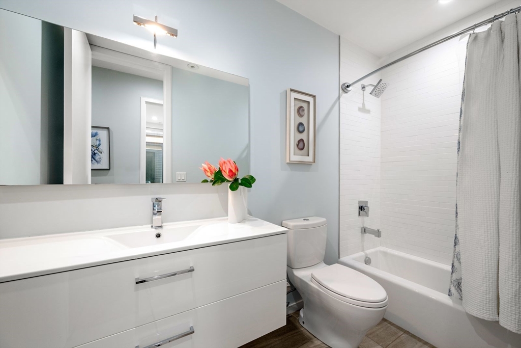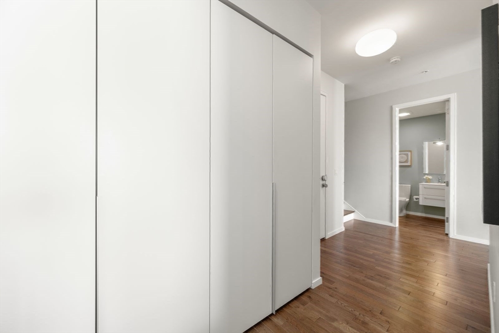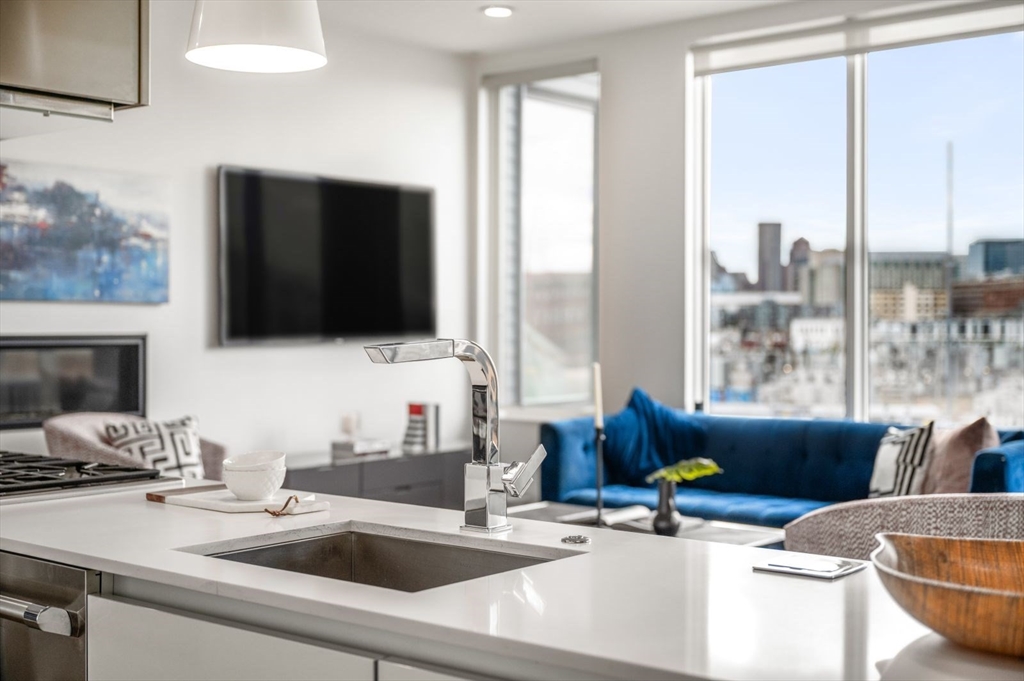 Experience the finest in contemporary living in this sleek and stylish penthouse duplex where South Boston meets the Seaport. This front facing, corner residence features incredible oversized windows, bringing in tons of natural light as well as skyline views of the Seaport and downtown beyond. The modern kitchen blends form and function with designer cabinetry, high-end stainless steel appliances, white quartz counter tops and seating for four stools. The layout lends itself wonderfully to entertaining and can be set up in multiple configurations. There is also a powder room on the main level. Upstairs features 2 bedrooms with great storage and more oversized windows. Beautiful spa-like bathrooms accentuate the overall design driven feel of this contemporary home. One flight up is your spacious private roof-deck perfectly situated in the front corner to take in the city views. A deeded garage parking space finishes things off and completes a true "total package". Very walkable too!