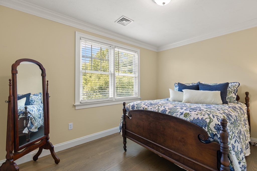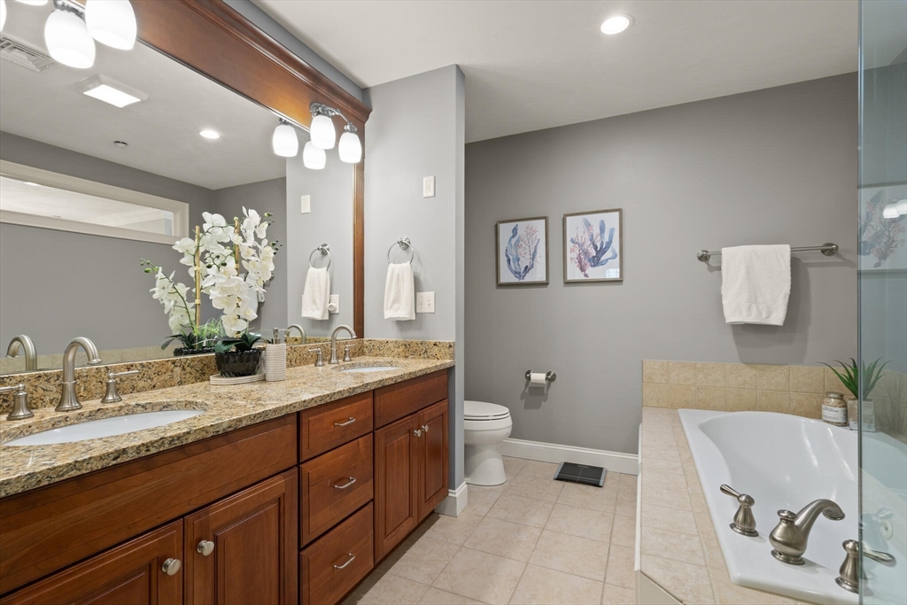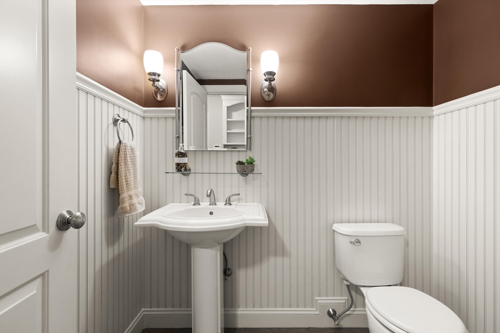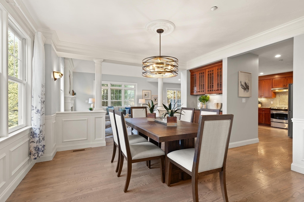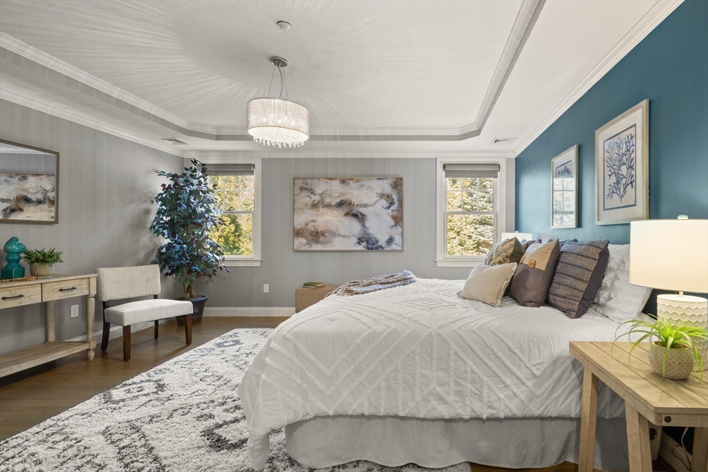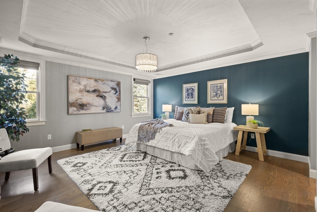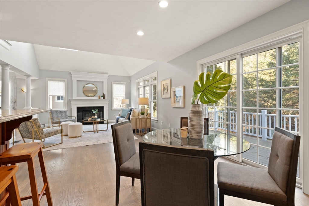 Sophisticated, airy, and bright end unit condo blending elegance and comfort. Perfectly positioned at the rear of the complex, this stunning 3 bedroom home enjoys tranquil views of conservation land. A soaring vaulted ceiling with skylight, gas fireplace, gleaming hardwoods, and refined moldings set the tone for quality throughout. The expansive kitchen features cherry cabinetry, stainless steel appliances, a peninsula, and an inviting eat-in area with sliders to the deck. The formal dining room shines with wainscoting and a custom bar with glass-front cherry cabinetry, ideal for entertaining. A first floor office with tailored built ins provides an inspiring workspace. Upstairs includes three spacious bedrooms, including a luxurious primary suite, plus convenient second floor laundry. The finished walk out lower level with full bath expands the living space, perfect for a media room, guest suite, or gym. Two car garage and prime Sudbury location. NOT AGE RESTRICTED!