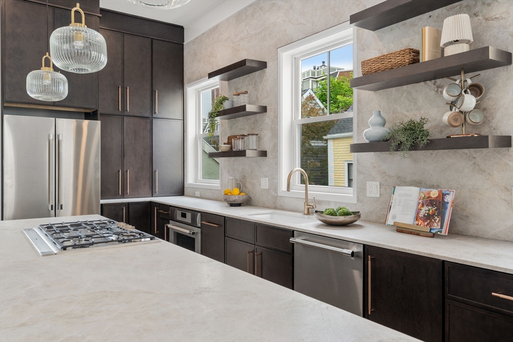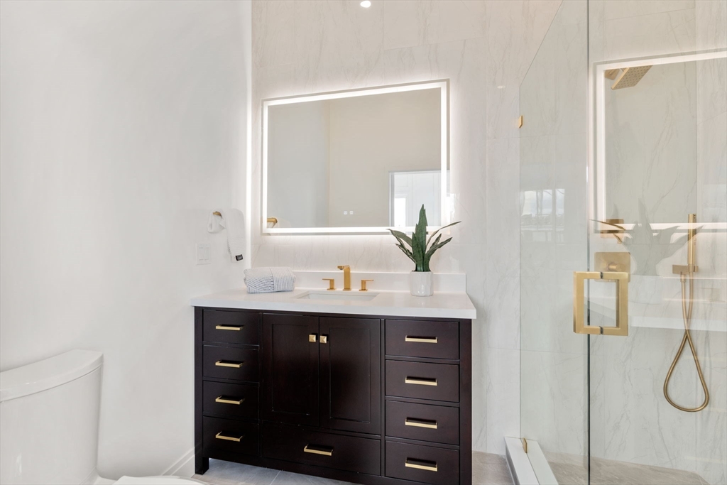 Welcome to this stunning PENTHOUSE 3-bedroom, 2-bathroom condo offering over 1,900 sf of luxurious living space and GARAGE PARKING in historic Charlestown. This new construction home features an open layout with soaring ceilings, a gas fireplace, custom moldings and high-end finishes curated by Velar Design. The designer kitchen showcases premium Thermador appliances and Taj Mahal Quartzite countertops and backsplash, flowing seamlessly to an oversized private deck for effortless indoor-outdoor living. All bedrooms are queen-sized with ample storage and both bathrooms are tiled floor-to-ceiling with sleek finishes and backlit LED mirrors. Custom lighting and engineered hw floors throughout, adding warmth and sophistication. Enjoy year-round comfort with ample storage, central AC, plus the rare convenience of garage parking. Steps from Charlestown’s vibrant dining, shopping, and public transportation, with easy access to downtown Boston, this home is the perfect blend of luxury & charm.
