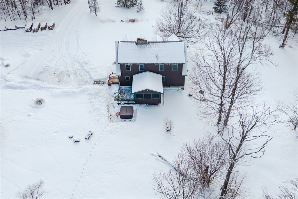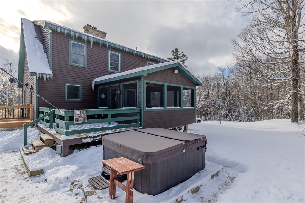 Gorgeous 3 bedroom 2 full bath home on almost 9 acres. Beautiful wide-plank wood floors throughout the kitchen, dining room and living room. Spacious primary bedroom with large closet on the first floor. Eat in kitchen and large living room with vaulted wood ceiling and wood stove. Oversized screened porch off the kitchen. Upstairs another two large bedrooms and another full bath. Hot tub (2023 APO) for year-round enjoyment. Newer washer and dryer 2023 (APO) Located in the private association of Becket Woods. Close to all Berkshire Amenities including Becket Beach, stock ponds, hiking trails and Jacobs Pillow. 4-5 Cords of wood included for buyer's enjoyment. Seller will get a passing Title V before closing (being done Jan 23). OPEN HOUSE SAT JAN 24TH 11:30-1:30