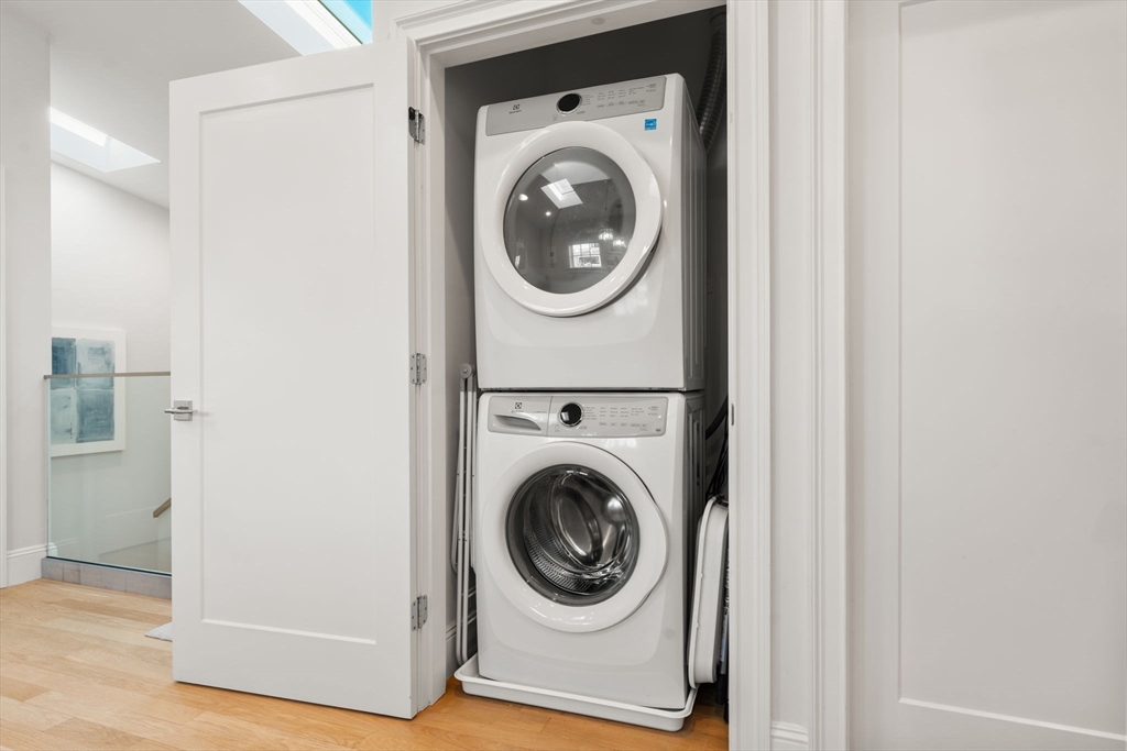 Welcome to 269 Gold Street, an elegant and sunlit penthouse on the west side. Built in 2021, this brand-new unit features soaring ceilings and stunning skylights that flood the space with natural light. This well-appointed 2 bed, 1.5 bath residence spans 896 sq ft of thoughtfully designed space. You'll love the centerpiece chef’s kitchen, complete with stainless steel appliances, quartz countertops, and plenty of cabinet storage. Enjoy hardwood floors throughout, in-unit laundry, and two spacious bedrooms. Step out onto a private deck that expands your living area, offering unobstructed views of the iconic Back Bay skyline. Nestled on a quiet one-way street, this home is just minutes from public transit, providing a rare blend of serenity and prime South Boston convenience. The owner currently rents a garage parking space in the building that can be transferred to the buyer.