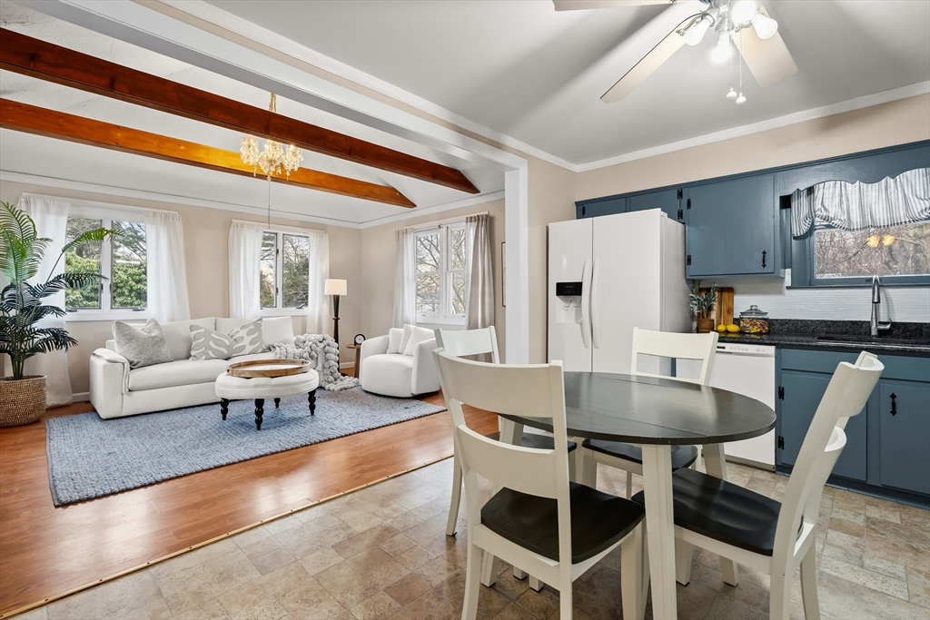 Move-in ready single-level home offering 3 bedrooms and 1 bath in a convenient location close to the train and highway access. A welcoming entry foyer/mudroom opens to the main living room featuring a picture window and ceiling fan, creating a bright and comfortable space. The eat-in kitchen offers granite countertops and flows seamlessly into a stunning family room with vaulted ceilings, exposed beams, and access to a side porch overlooking the fenced yard—perfect for relaxing or entertaining. Laundry hookups are currently located in the third bedroom and can easily be removed to restore it as a true bedroom. The basement provides ample storage along with dedicated workspace potential. Outdoor features include a patio and fenced yard, ideal for enjoying the outdoors. A wonderful opportunity for easy living with both indoor and outdoor appeal.