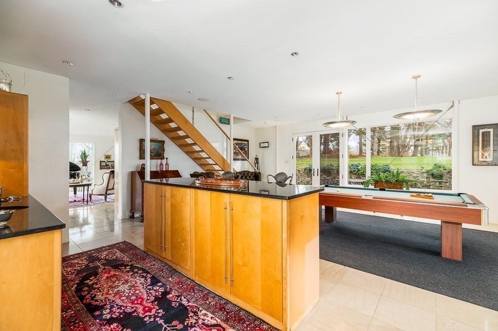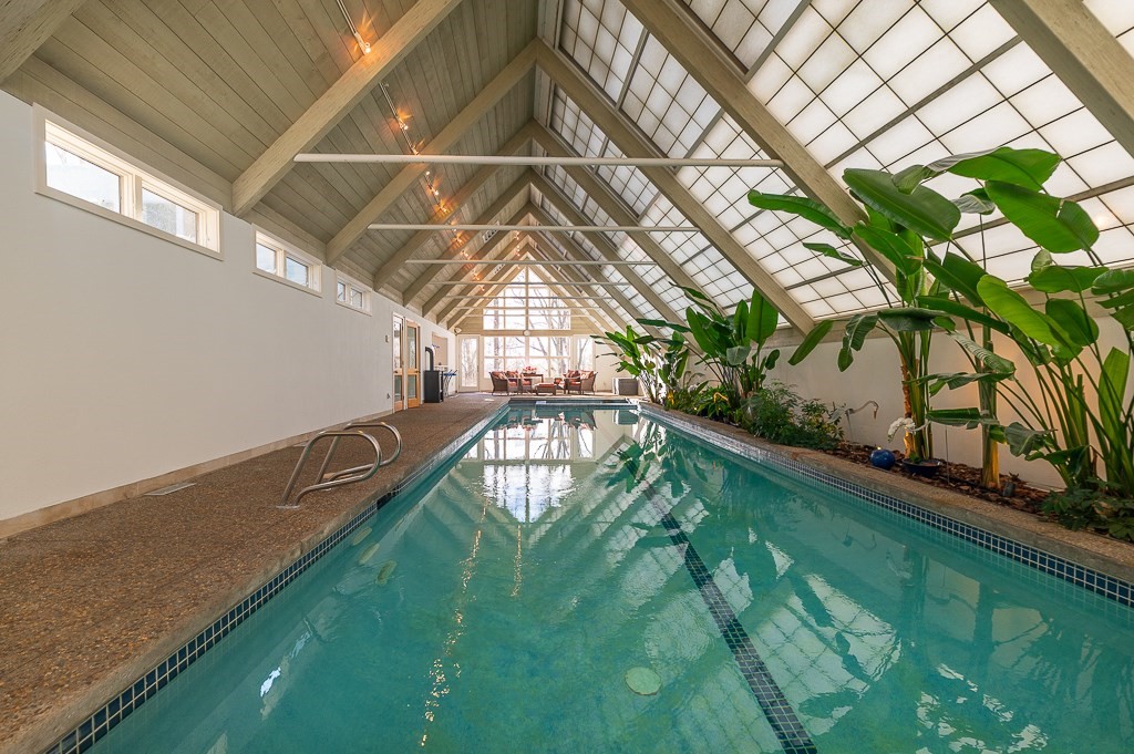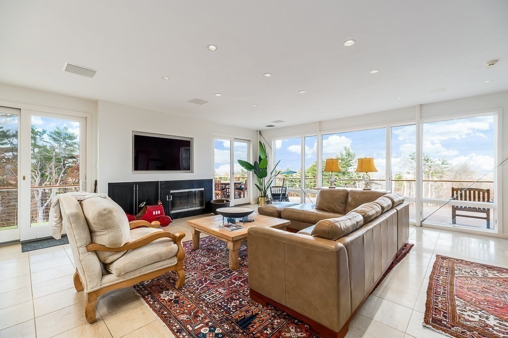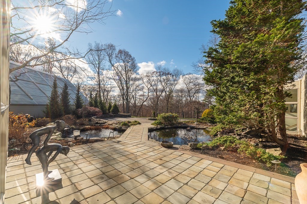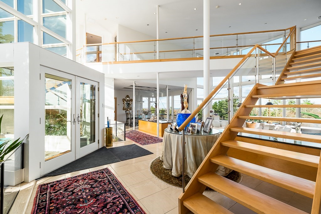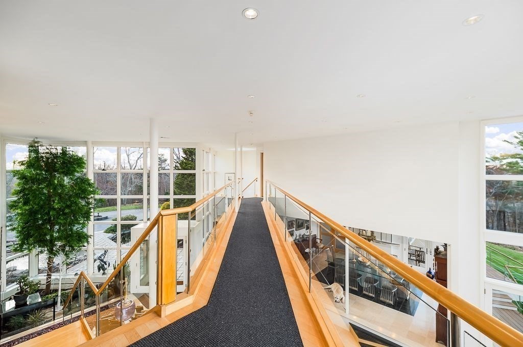 This striking modern estate rises above 15+ acres of complete privacy, with sweeping overland views and distant ocean vistas. Designed for both drama and livability, the move-in-ready contemporary centers around a breathtaking great room with 25-foot ceilings, walls of glass, and an elevated bridge overlooking the space. The home flows effortlessly into a sleek chef’s kitchen, sophisticated media and billiard rooms, and multiple guest suites ideal for hosting. Five bedrooms, seven baths, and a remarkable home office or studio complete the main residence. A spectacular natatorium—with a 50-foot heated pool and spa, bar, and private guest suite, creates a true year-round resort experience. The second-floor primary suite offers a marble spa bath and custom dressing room, while a lower-level library/office and wine cellar cater to collectors and remote work. Expansive decks extend living outdoors, and the approach—via koi pond, waterfalls, and tranquil landscaping, an unforgettable estate.