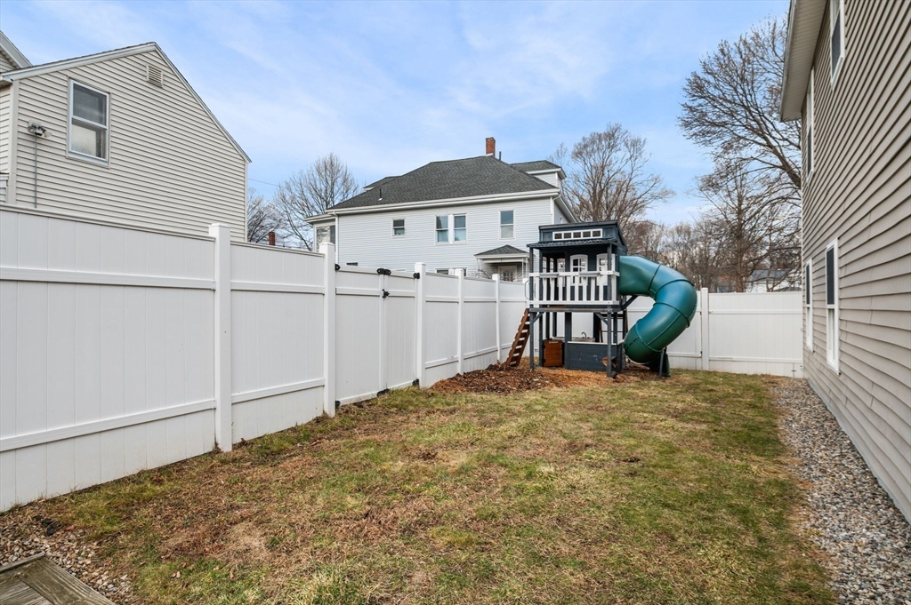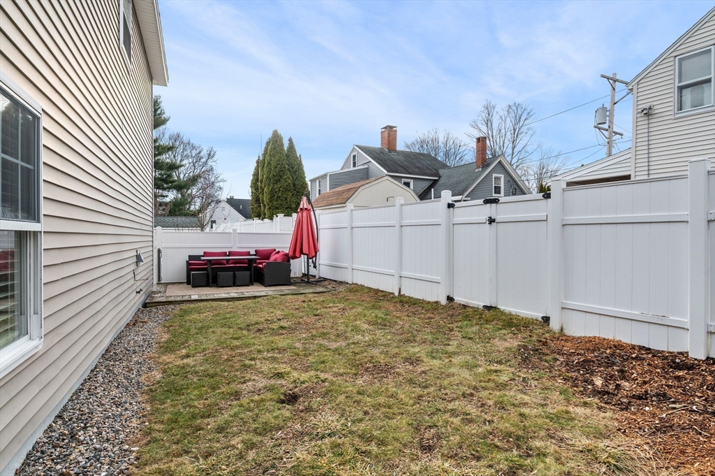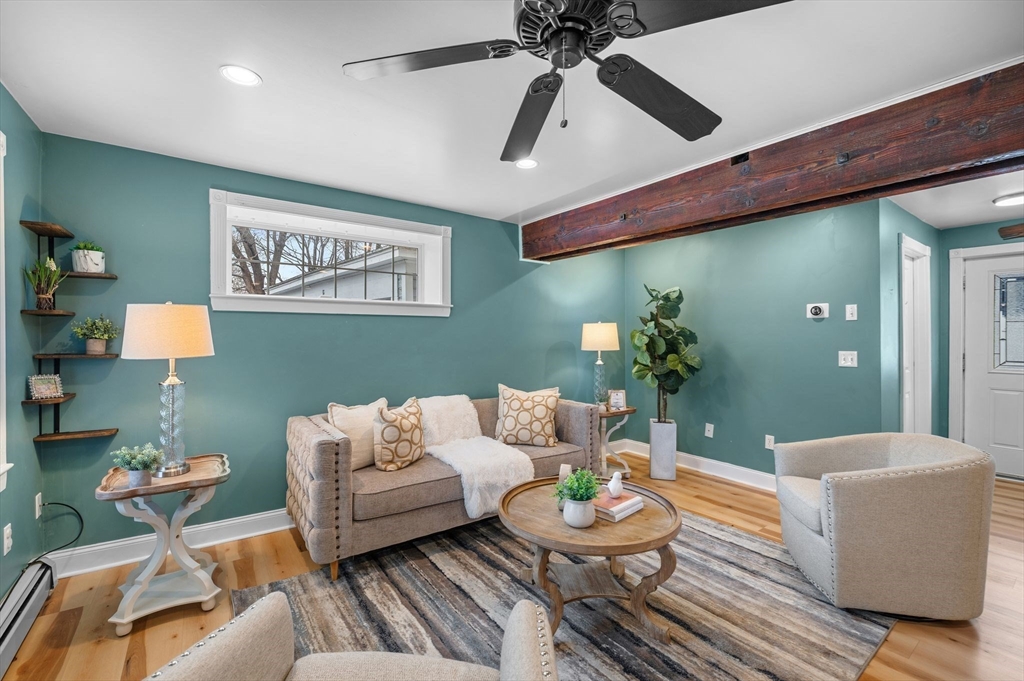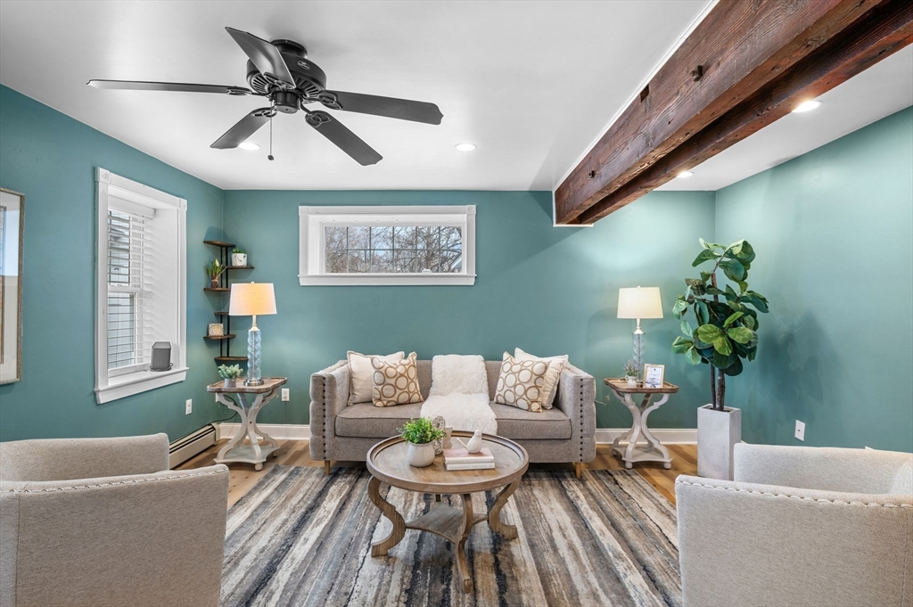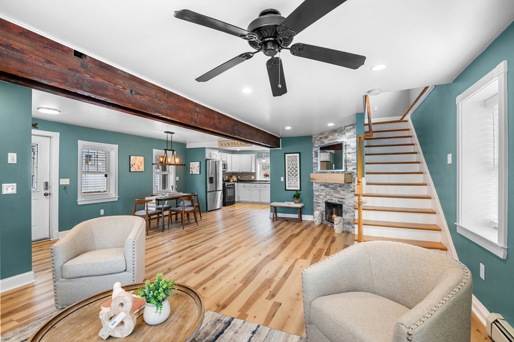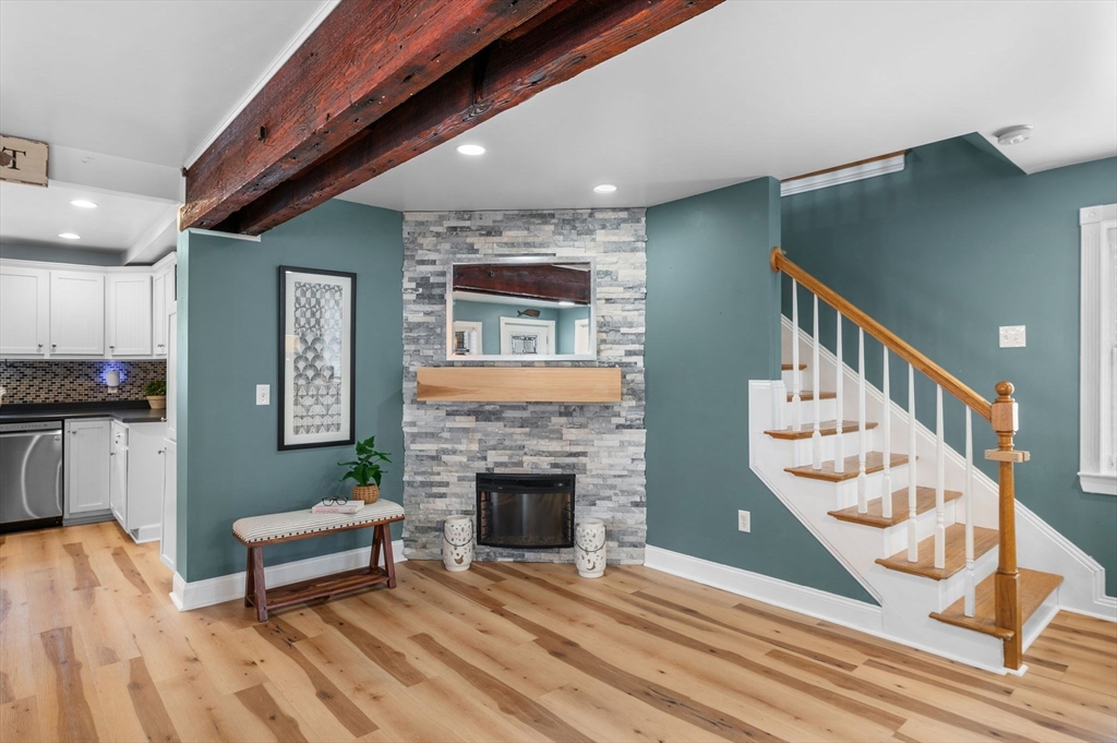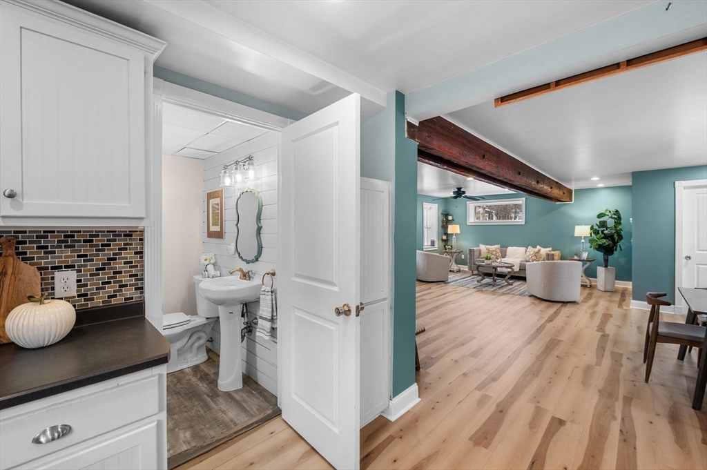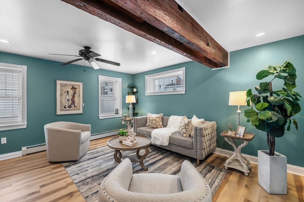 Welcome to this charming 3-bedroom, 1.5 bath home offering 1,822 sq ft of comfortable living in the heart of downtown Amesbury, close to everything the city has to offer, yet perfectly tucked away for privacy. The inviting front porch offers a cozy spot for morning coffee. Once inside, the home opens to a bright, open-concept layout, highlighted by a beautiful exposed beam that adds warmth and character. A huge front closet provides exceptional everyday convenience, with plenty of space for coats, boots, and all the extras. This home features nicely sized bedrooms with great flexibility for guest space, home office needs, or everyday living. The full bathroom is thoughtfully designed with a double sink vanity. Step outside to enjoy an adorable fenced yard, with a deck, and a spot for a dog run. A shed incorporated into the house adds standout storage space for bikes, tools, seasonal items, and more.With its blend of charm, space, and an unbeatable location, this home is the one!