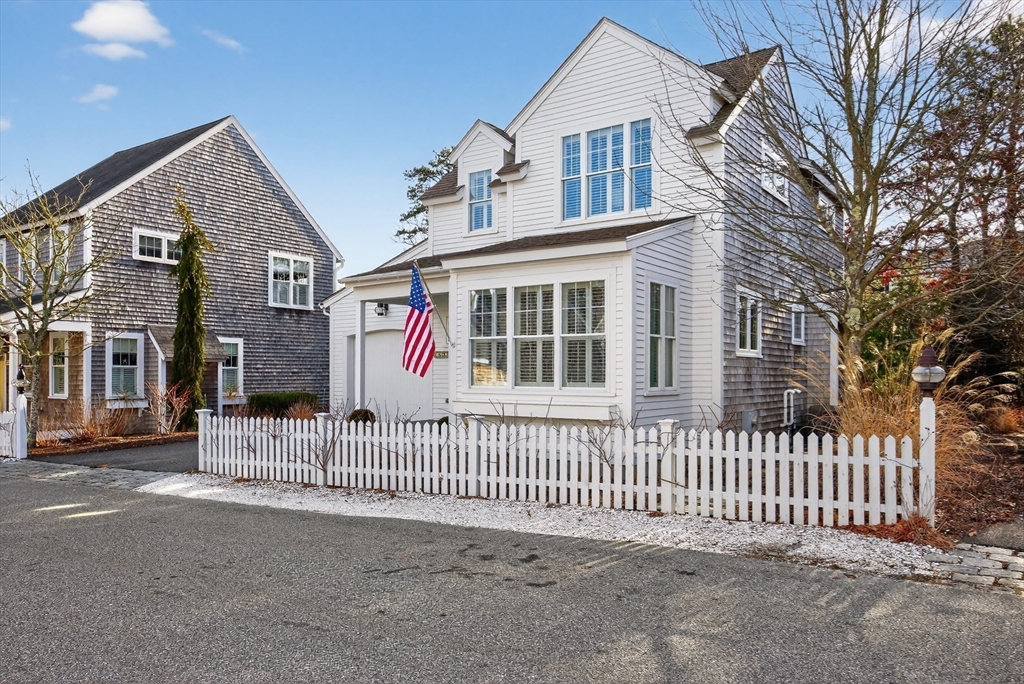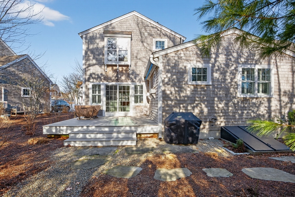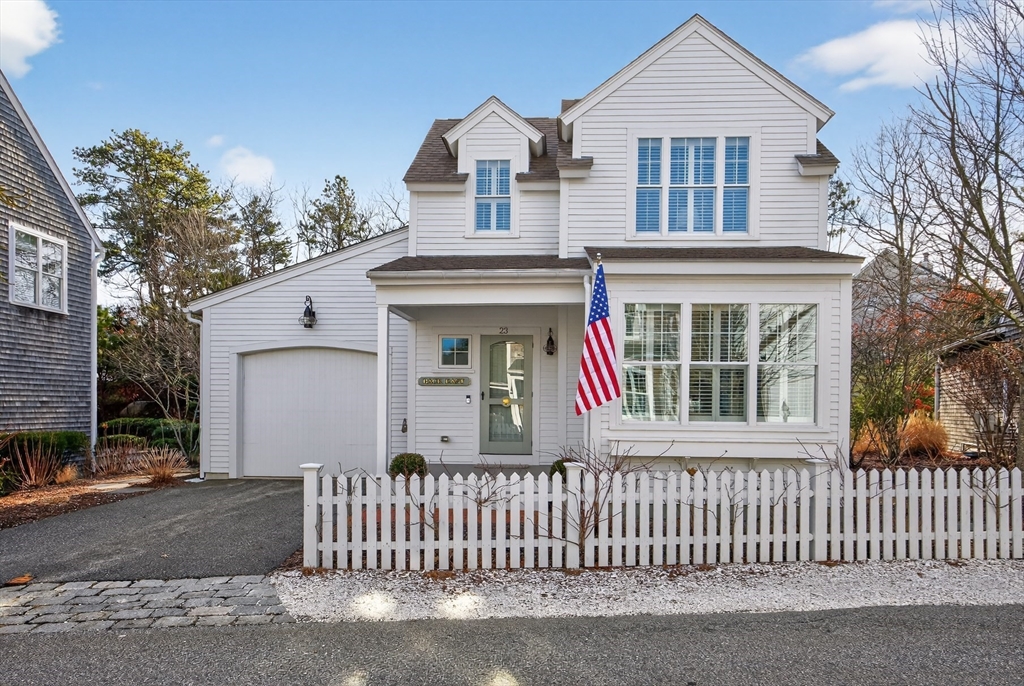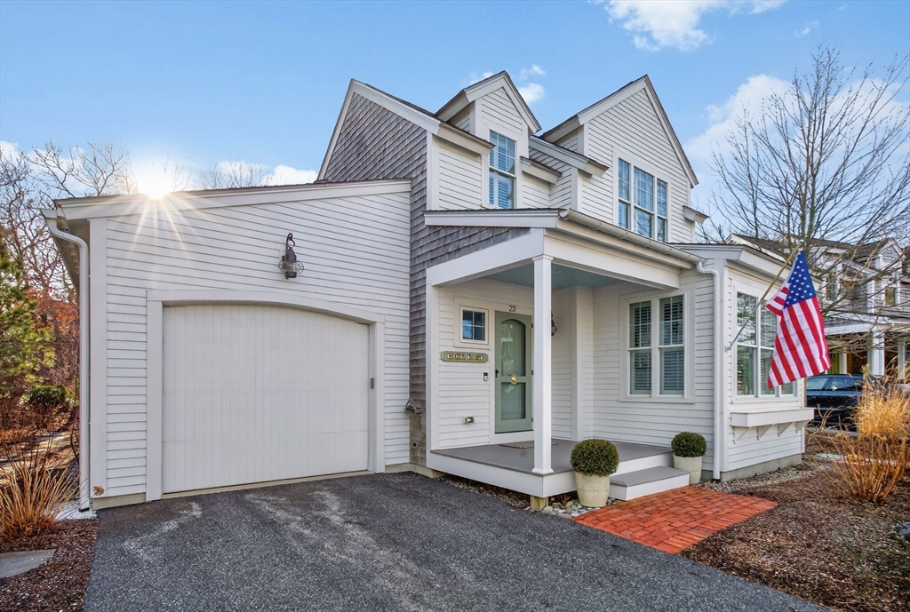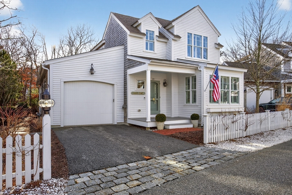 Welcome to 23 Cobblestone! Located in the picturesque, Nantucket-style cottage neighborhood within The Pinehills. Walking distance to miles of paved trails, Pinehills retail, events on the Village Green, and activities at the Stonebridge Club. First floor includes an open plan living room with fireplace, and a chef’s kitchen with Wolf Dual Fuel Range with 4 burners and infrared griddle. Range hood vents outside. Kitchen includes a farm sink, and a center island with built-in microwave. Primary-sized bedrooms located on both first and second floors, with a third bedroom with window seat also on the second floor. Full, step-in tiled showers on both floors. Ample storage and closet space throughout the home, garage, and basement. Custom front storm door. Step off large back deck (with retractable awning) to enjoy your backyard that includes gas hook-up for grilling. Mature plantings throughout property include roses, hydrangeas, and ornamental grasses. Installed two-zone drip irrigation.